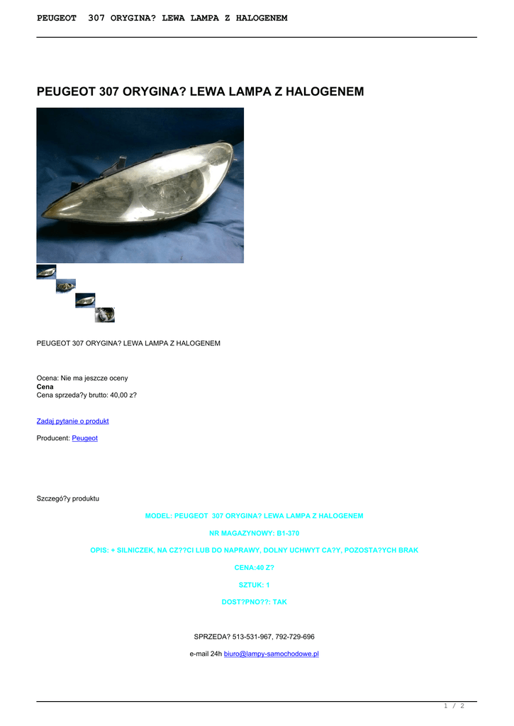 PEUGEOT 307 ORYGINA? LEWA LAMPA Z HALOGENEM PEUGEOT 307 ORYGINA? LEWA LAMPA Z HALOGENEM PEUGEOT 307 ORYGINA? LEWA LAMPA Z HALOGENEM Ocena: Nie ma jeszcze oceny Cena Cena sprzeda?y brutto: 40,00 z? Zadaj pytanie o produkt Producent: Peugeot Szczegó?y produktu MODEL: PEUGEOT 307 ORYGINA? LEWA LAMPA Z HALOGENEM NR MAGAZYNOWY: B1-370 OPIS: + SILNICZEK, NA CZ??CI LUB DO NAPRAWY, DOLNY UCHWYT CA?Y, POZOSTA?YCH BRAK CENA:40 Z? SZTUK: 1 DOST?PNO??: TAK SPRZEDA? 513-531-967, 792-729-696 e-mail 24h [email protected] 1 / 2 PEUGEOT 307 ORYGINA? LEWA LAMPA Z HALOGENEM Po zakupie Twoja lampa zostanie wys?ana jeszcze tego samego dnia. Ka?da paczka jest dobrze zabezpieczona i dostarczana za po?rednictwem Firmy Kurierskiej Siódemka. Do wysy?ki do??czamy paragon lub na ?yczenie rachunek. Mo?liwy równie? odbiór osobisty. Przesy?ka kurierska przedp?ata- 30 z? Przesy?ka kurierska pobraniowa - 35 z? - EKSPRESOWA WYSY?KA -GWARANCJA ROZRUCHOWA ZAKUPIONYCH CZ??CI - MO?LIWO?? ZWROTU PRZESY?KI W CI?GU 10 DNI BEZ PODANIA PRZYCZYNY -SATYSFAKCJA GWARANTOWANA 100% Jeste?my firm? z wieloletnim do?wiadczeniem zajmuj?c? si? sprzeda?? lamp samochodowych . W swojej bogatej ofercie posiadamy lampy do wszystkich modeli aut. Dwa razy w tygodniu odbywa si? nowa dostawa, realizujemy równie? zamówienia indywidualne. Magazyny s? stale zaopatrywane w nowy towar.Wszystkie lampy ukazuj?ce si? w og?oszeniach posiadaj? dok?adny opis sprzedawanej cz??ci. Zdj?cia nie podlegaj? obróbce. Wykonujemy tak?e kompleksowe us?ugi w zakresie: …. naprawa lamp samochodowych, regeneracja reflektorów, polerowanie matowych kloszy, przeróbka lamp z USA na UE, tuning, monta? ?wiate? dziennych, przeróbka reflektorów…. US?UGI 795-785-666 wi?cej na www.lampy-samochodowe.pl ZAPRASZAMY!!! 2 / 2 Powered by TCPDF (www.tcpdf.org)