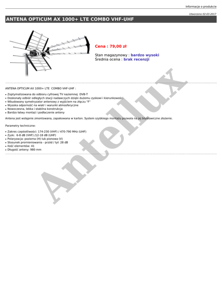 Informacje o produkcie Utworzono 02-03-2017 ANTENA OPTICUM AX 1000+ LTE COMBO VHF-UHF Cena : 79,00 zł ANTENA OPTICUM AX 1000+ LTE COMBO VHF-UHF : ● ● ● ● ● Zoptymalizowana do odbioru cyfrowej TV naziemnej DVB-T Doskonały odbiór odległych stacji nadawczych dzięki dużemu zyskowi i kierunkowości Wbudowany symetryzator antenowy z wyjściem na złączu "F" Wysoka odporność na wiatr i warunki atmosferyczne Nowoczesna, lekka i stabilna konstrukcja Bardzo łatwy montaż i podłaczenie anteny lu ● x Stan magazynowy : bardzo wysoki Średnia ocena : brak recenzji Parametry techniczne: ● ● ● ● ● Zakres częstotliwości: 174-230 (VHF) / 470-790 MHz (UHF) Zysk: 6-8 dB (VHF) /12-18 dB (UHF) Polaryzacja: pozioma (H) lub pionowa (V) Stosunek promieniowania - przód / tył: 28 dB Ilość elementów: 41 Długość anteny: 980 mm An ● te l Antena jest wstępnie zmontowana, zapakowana w karton. System szybkiego montażu pozwala na jej błyskawiczne złożenie.