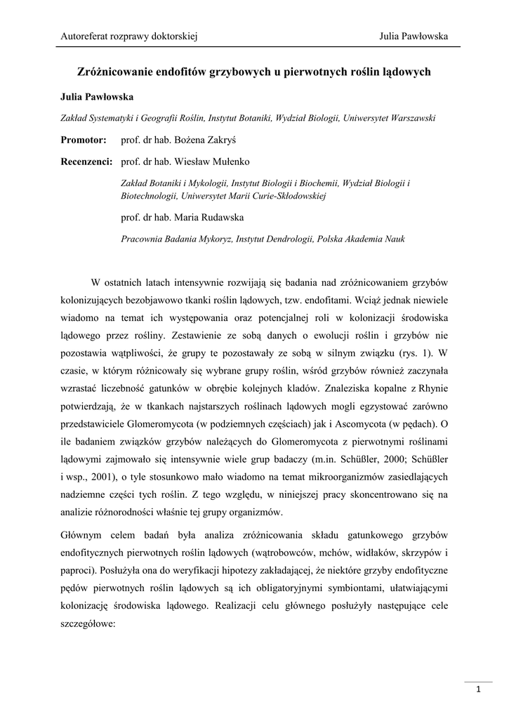 Autoreferat rozprawy doktorskiej Julia Pawłowska Zróżnicowanie endofitów grzybowych u pierwotnych roślin lądowych Julia Pawłowska Zakład Systematyki i Geografii Roślin, Instytut Botaniki, Wydział Biologii, Uniwersytet Warszawski Promotor: prof. dr hab. Bożena Zakryś Recenzenci: prof. dr hab. Wiesław Mułenko Zakład Botaniki i Mykologii, Instytut Biologii i Biochemii, Wydział Biologii i Biotechnologii, Uniwersytet Marii Curie-Skłodowskiej prof. dr hab. Maria Rudawska Pracownia Badania Mykoryz, Instytut Dendrologii, Polska Akademia Nauk W ostatnich latach intensywnie rozwijają się badania nad zróżnicowaniem grzybów kolonizujących bezobjawowo tkanki roślin lądowych, tzw. endofitami. Wciąż jednak niewiele wiadomo na temat ich występowania oraz potencjalnej roli w kolonizacji środowiska lądowego przez rośliny. Zestawienie ze sobą danych o ewolucji roślin i grzybów nie pozostawia wątpliwości, że grupy te pozostawały ze sobą w silnym związku (rys. 1). W czasie, w którym różnicowały się wybrane grupy roślin, wśród grzybów również zaczynała wzrastać liczebność gatunków w obrębie kolejnych kladów. Znaleziska kopalne z Rhynie potwierdzają, że w tkankach najstarszych roślinach lądowych mogli egzystować zarówno przedstawiciele Glomeromycota (w podziemnych częściach) jak i Ascomycota (w pędach). O ile badaniem związków grzybów należących do Glomeromycota z pierwotnymi roślinami lądowymi zajmowało się intensywnie wiele grup badaczy (m.in. Schüßler, 2000; Schüßler i wsp., 2001), o tyle stosunkowo mało wiadomo na temat mikroorganizmów zasiedlających nadziemne części tych roślin. Z tego względu, w niniejszej pracy skoncentrowano się na analizie różnorodności właśnie tej grupy organizmów. Głównym celem badań była analiza zróżnicowania składu gatunkowego grzybów endofitycznych pierwotnych roślin lądowych (wątrobowców, mchów, widłaków, skrzypów i paproci). Posłużyła ona do weryfikacji hipotezy zakładającej, że niektóre grzyby endofityczne pędów pierwotnych roślin lądowych są ich obligatoryjnymi symbiontami, ułatwiającymi kolonizację środowiska lądowego. Realizacji celu głównego posłużyły następujące cele szczegółowe: 1 Autoreferat rozprawy doktorskiej Julia Pawłowska - izolacja i identyfikacja grzybów z tkanek pierwotnych roślin lądowych (wątrobowców, mszaków, widłaków, skrzypów, paproci); - określenie stałości składu gatunkowego grzybów endofitycznych oraz charakterystyka ich dróg transmisji. Rysunek 1. Koewolucja grzybów i roślin lądowych. Na osi poziomej znajduje się skala czasu liczona w milionach lat wraz z odpowiadającymi im okresami geologicznymi (za International Comission on Stratigraphy). Powyżej osi czasu przedstawiono szacowaną liczebność głównych grup roślin w poszczególnych okresach (kolory oznaczają kolejne grupy roślin; za Niklas i wsp., 1983 zmienione). Poniżej osi czasu przedstawiono wydatowane sześcioma skamienielinami drzewo filogenetyczne wybranych grup grzybów (za Redecker i wsp., 2000 zmienione). Białe przerywane pola oznaczają nieciągłość skali. Przerywane, czarne linie pionowe łączą kluczowe wydarzenia na obydwu częściach wykresu. 2 Julia Pawłowska Autoreferat rozprawy doktorskiej Podczas realizacji pracy przeanalizowano ponad 2000 fragmentów roślin, z których wyizolowano około 1000 szczepów grzybów. Wszystkie szczepy zidentyfikowano posługując się klasycznymi metodami stosowanymi w badaniach morfologicznych oraz technikami biologii molekularnej. Wśród 57 zidentyfikowanych gatunków dwa opisano jako nowe dla nauki (Paraconiothyrium babiogorense i Paraconiothyrium polonense), dwa inne reklasyfikowano (Mucor luteus i Paraconiothyrium lycopodinum). Kilka taksonów było po raz pierwszy notowanych dla Polski (Allantophomopsis lycopodina, Cadophora luteoolivacea, Cladosporium ossifragi, Gelasinospora tetrasperma, Leiosphaerella lycopodina, Paraconiothyrium sp., Rhizosphaerea kalkhoffii, Stagonospora pteridiicola). Przeprowadzone badania pozwoliły także odpowiedzieć na następujące pytania: a) Czy bogactwo i skład gatunkowy grzybów endofitycznych pierwotnych roślin lądowych odbiega od tego u roślin nago- i okrytozalążkowych? Liczba gatunków grzybów endofitycznych współcześnie zasiedlających tkanki pierwotnych roślin lądowych jest mniejsza niż u roślin nago- czy okrytozalążkowych, a zróżnicowanie zespołów grzybowych zasadniczo odmienne. Tylko nieliczne grzyby, takie jak Phoma herbarum czy Trichoderma viride, były wcześniej notowane jako endofity roślin nasiennych. Wiele z wyizolowanych grzybów to powszechnie znane patogeny roślin (przedstawiciele rodzajów Mycosphaerella czy Coniothyrium), co potwierdza sugestie innych badaczy, że endofityzm może być jedynie fazą w cyklu życiowym, a nie permanentnym stanem. Przeprowadzone badania są pierwszymi, które w tak bezpośredni sposób wskazują, że specyficzne gatunkowo grzyby endofityczne, występujące licznie w populacji rośliny żywicielskiej, mogą być znanymi od dawna patogenami. b) Czy istnieją różnice w składzie zespołów grzybów pomiędzy poszczególnymi żywicielami (specyficzność gatunkowa) i ich miejscem występowania (stanowiskami) ? Skład zespołów grzybów endofitycznych pierwotnych roślin lądowych zależy raczej od miejsca bytowania niż od rośliny żywicielskiej; różnice pomiędzy poszczególnymi żywicielami były słabo zaznaczone. Specyficzność gatunkową względem rośliny żywicielskiej zaobserwowano tylko w przypadku kilku gatunków: Paraconiothyrium babiogorense względem Huperzia selago; Paraconiothyrium lycopodinum, Leiosphaerella lycopodina i Allantophomopsis lycopodina względem Lycopodium annotinum oraz Stagonospora pteridiicola względem Pteridium aquilinum; endofityczne szczepy Gibberella 3 Autoreferat rozprawy doktorskiej Julia Pawłowska tricincta były izolowane jedyni