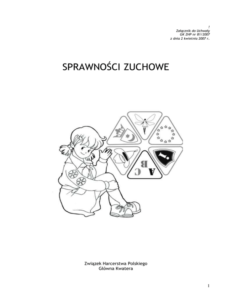 ! Załącznik do Uchwały GK ZHP nr 81/2007 z dnia 2 kwietnia 2007 r. SPRAWNOŚCI ZUCHOWE Związek Harcerstwa Polskiego Główna Kwatera 1 Druhno Drużynowa, Druhu Drużynowy! Do Twoich rąk trafił właśnie regulamin oraz programy sprawności zuchowych. Czym to wydanie różni się od poprzednich? Po pierwsze - znajdziecie w nich nowe programy sprawności, dzięki którym będziecie mogli poszerzyć swój warsztat pracy. Dzięki nim wzbogacicie tematykę zbiórek, ich fabułę oraz wprowadzicie nowe, interesujące dla zuchów treści. Po drugie – programy sprawności zostały podzielone tematycznie. Nie oznacza to jednak, że jest to jedyny dopuszczalny podział. Regulamin każdej sprawności oparty jest o schemat. W ramach tego schematu, w każdej sprawności znalazło się miejsce na: - wszechstronne kształtowanie charakteru - poprzez rozwijanie i gruntowanie samodzielności, gotowości do pomocy innym, dzielności czy prawdomówności, - rozwój intelektualny – poprzez wprowadzanie nowych, ciekawych informacji i wszechstronne wzbogacanie wiedzy. - wyrobienie fizyczne – wynikające z zagwarantowania zuchom na zbiórce ruchu (gier i ćwiczeń) oraz przebywania na świeżym powietrzu, - ćwiczenia praktyczne – z zakresu danej sprawności, Oczywiście, powstałe grupy sprawności w sposób szczególny przyczyniają się do rozwijania jednej wybranej postawy, którą chcemy kształtować u zuchów w określonym czasie, w zależności od indywidualnej charakterystyki gromady. Programy sprawności zbudowane są jednak w taki sposób, że obok dominujących tresci (ściśle zwiazanych z tematyką sprawności), zawierają propozycje działań, służące wszechstronnemu rozwojowi. Po trzecie – w opracowaniu tym znajdziecie zarówno sprawności zdobywane zespołowo i indywidualnie. Wyodrębnione sprawności zdobywane indywidualnie pomogą kształtować i rozwijać pożądane cechy u zuchów. W zestawie sprawnościach zuchowych nie ma jednak żadnej sprawności, której program wykluczałby zdobywanie zespołowe. Wszystkie sprawności można również dostosować do indywidualnego zdobywania, jeśli zuch posiada predyspozycje lub wyraźne chęci by taką sprawność realizować. Mamy nadzieję, że książeczka spełni swoje zadanie ułatwiając pracę drużynowym. Zespół Zuchowy WM GK ZHP 2 Regulamin sprawności zuchowych I. Sprawność zuchowa to określone programem umiejętności i pożądane zachowania przeżyte w zabawie. 1. Zespołowe zdobywanie sprawności to aktywne uczestnictwo w zabawach gromady. Indywidualne zdobywanie sprawności to samodzielne podejmowanie działań w określonej dziedzinie. Zdobywanie sprawności służy ujawnianiu i rozwijaniu uzdolnień zuchów, uczy rzetelności w zabawie, umożliwia poznanie otaczającego świata i ćwiczenie pożytecznych w życiu umiejętności. 2. Program sprawności zdobywanej zespołowo to zbiór pomysłów do zabaw z zuchami, który składa się z trzech części: a) zestawu zadań objętych tematem sprawności zapisanych w formie zabaw i skierowanych do zucha, b) zbioru podpowiedzi dla drużynowego, które pomogą mu: - dostrzec walory wychowawcze proponowanych zabaw, - modyfikować wymagania objęte tematem sprawności w zależności od pory roku, charakteru i możliwości gromady, c) podstawowej bibliografii dotyczącej tematu sprawności. 3. Program sprawności zdobywanej indywidualnie to zbiór: a) proponowanych działań do samodzielnej realizacji przez zucha, b) podpowiedzi dla drużynowego, które zawierają propozycje: - możliwości włączenia samodzielnych działań zucha do zabaw gromady, - sposobów oceny (kontroli) przebiegu realizacji podjętych przez zucha działań, - dalszego wspierania rozwoju zainteresowań zucha. 4. Pakiet zabaw zawartych w programie sprawności powinien sprzyjać: a) rozwojowi fizycznemu, b) rozwojowi umysłowemu, c) rozwojowi społecznemu, d) rozwojowi duchowemu każdego zucha. Wpływ ten może być rezultatem zarówno sposobu podejścia do zabawy i jej organizacji, jak również samej treści zabawy. II. Tryb zdobywania sprawności zuchowych 1. Zespołowe zdobycie sprawności polega na aktywnym udziale zucha w zabawach gromady. W zdobywaniu sprawności należy uwzględnić: – podjęcie w Kręgu Rady decyzji o tym, w co się będziemy bawić, czyli o wyborze sprawności, – wspólną zabawę wynikającą z programu danej sprawności, – wspólną zabawę z wykorzystaniem umiejętności i istotnych elementów zbiórek, które umożliwiają podsumowanie cyklu i podjęcie decyzji o przyznaniu sprawności, – indywidualne przyznanie sprawności każdemu zuchowi. Decydują o tym wszystkie zuchy wraz z przybocznymi i drużynowym w Kręgu Rady, – obrzędowe nadanie sprawności połączone z wręczeniem znaczka sprawności. 3 2. Indywidualne zdobycie sprawności polega na zrealizowaniu wybranych przez zucha działań oraz prezentacji w trakcie zbiórki wybranych wspólnie z drużynowym efektów tych działań. W indywidualnym zdobywaniu sprawności należy uwzględnić: – wybrane przez zucha sprawności i wspólne ustalenie z drużynowym lub przybocznym zadań wynikających z jej programu, – wykonanie ustalonych zadań. Realizacja tych zadań jest wspierana przez drużynowego lub przybocznego w zależności od potrzeb zucha, – prezentację na zbiórce wybranych wspólnie z drużynowym zadań i podjęcie wspólnej decyzji w Kręgu Rady o przyznaniu sprawności. 3. Sprawności można zdobywać zespołowo lub indywidualnie pamiętając o dostosowaniu programu do przyjętego sposobu realizacji. 4. Dziecko wstępujące do gromady uczestniczy w zdobywaniu sprawności i może ją mieć przyznaną przed złożeniem Obietnicy. III. Zasady ogólne 1. Podstawowy zestaw programów sprawności ogłasza Naczelnik ZHP. Programy sprawności występują w dwóch grupach: – realizowanych zespołowo, – realizowanych indywidualnie. 2. Zdobycie sprawności potwierdzane jest w książeczce zucha