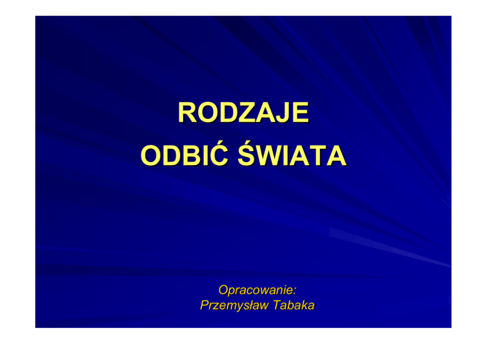 RODZAJE ODBIĆ ŚWIATA Opracowanie: Przemysław Tabaka Rodzaje odbić światła Rozróżnia się różne rodzaje odbić na granicy dwóch ośrodków ODBICIE KIERUNKOWE • Występowanie odbicia – Powierzchnie zwierciadlane (powlekane odpowiednią powłoką) – Powierzchnie polerowane (chromowane, niklowane itp.) – Powierzchnie naturalnie gładkie (np. lustro wody) • Charakterystyka odbicia – Zmiana kierunku rozchodzenia się wiązki świetlnej (wg prawa Snella) – Powstawanie na tle powierzchni odbijającej pozornego obrazu źródła oświetlającego ODBICIE KIERUNKOWE • Prezentacja graficzna odbicia •α =β • Φ′ = ρ ⋅ Φ normalna ρ ROZPROSZONE (RÓWNOMIERNIE) ODBICIEODBICIE ROZPROSZONE • Występowanie odbicia – Powierzchnie matowe, pozbawione połysku (np. papier rysunkowy, matowe pokrycia farb klejowych) • Charakterystyka odbicia – Odbicie światła w różnych kierunkach, przy których (w skali makroskopowej) odbicia kierunkowe nie występują – Brak obrazu źródła światła, tak rzeczywistego jak i pozornego – W przypadku doskonale rozpraszających powierzchni ich luminancja jest stała i nie zależy od kierunku obserwacji, jak i kierunku świecenia ROZPROSZONE (RÓWNOMIERNIE) ODBICIEODBICIE ROZPROSZONE • Prezentacja graficzna odbicia • I β = I m cosβ •L= normalna ρ Iβ = Scosβ I m cosβ I m = = Scosβ S gdzie: S – pole powierzchni elementarnej, β – kąt odbicia światła ODBICIE MIESZANE ODBICIE MIESZANE (KIERUNKOWO ROZPROSZONE) • Występowanie odbicia – Powierzchnie trochę matowe, trochę połyskujące • Charakterystyka odbicia – Łączy w sobie cechy zarówno odbicia kierunkowego, jak i równomiernie rozproszonego – Zależność charakteru odbicia od kąta oświetlania próbki odbijającej – Zależność całkowitego współczynnika odbicia od kąta oświetlania próbki odbijającej ODBICIE MIESZANE ODBICIE MIESZANE (KIERUNKOWO ROZPROSZONE) • Prezentacja graficzna odbicia Strumień świetlny odbity Φρ od próbki dzieli się na część odbitą w sposób kierunkowy ΦK i część odbitą w sposób rozproszony ΦR Φρ = Φ K + ΦR ρ Otrzymana krzywa światłości składa się z dwóch części: kołowej odpowiadającej odbiciu rozproszonemu i wystającej z koła odpowiadającej odbiciu kierunkowemu Wpływanie na charakter odbicia strumienia świetlnego, a tym samym na stopień rozproszenia można dokonać w ramach: mikrostruktury Jeżeli zagwarantuje się dużą gładkość mikrostruktury powierzchni odbijającej, to można spodziewać się kierunkowego odbicia światła. Matowa powierzchnia np. z aluminium wytrawionego odbija strumień świetlny zgodnie z prawem Lamberta makrostruktury Wyposażenie regularnej powierzchni zwierciadlanej w strukturę groszków powoduje lokalne odbicia od tych groszków. Mają one charakter rozproszony, mimo że mikrostruktura pojedynczego uwypuklenia czy zagłębienia jest zwierciadlana. Przez dobór wielkości groszków,gęstości ich rozłożenia na powierzchni można wpływać na skalę rozproszenia