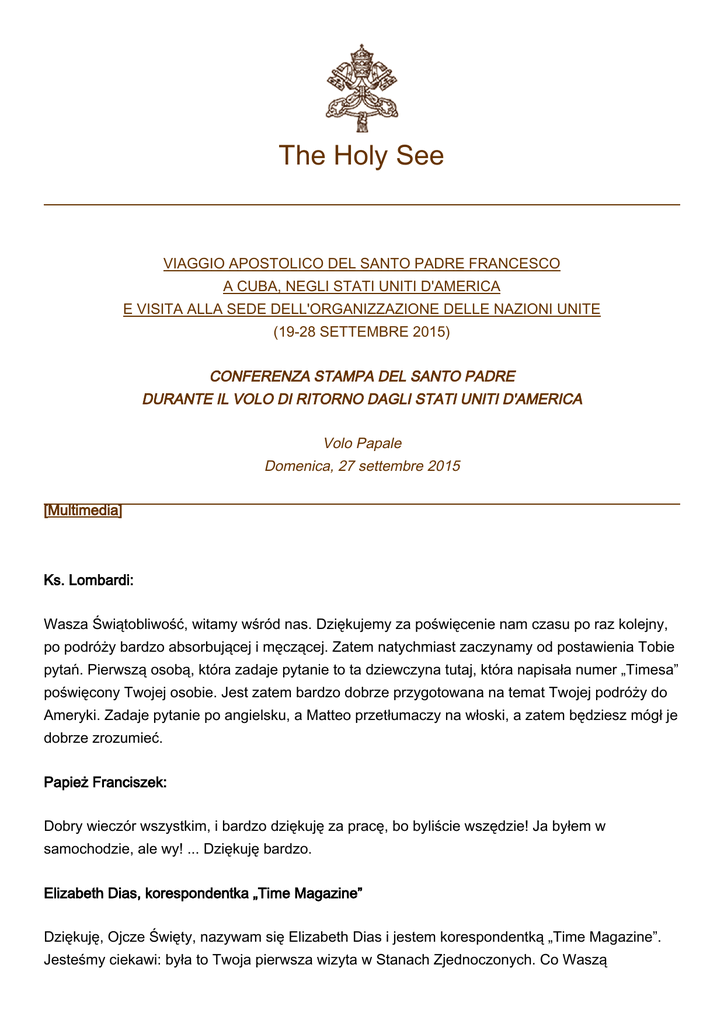 The Holy See VIAGGIO APOSTOLICO DEL SANTO PADRE FRANCESCO A CUBA, NEGLI STATI UNITI D'AMERICA E VISITA ALLA SEDE DELL'ORGANIZZAZIONE DELLE NAZIONI UNITE (19-28 SETTEMBRE 2015) CONFERENZA STAMPA DEL SANTO PADRE DURANTE IL VOLO DI RITORNO DAGLI STATI UNITI D'AMERICA Volo Papale Domenica, 27 settembre 2015 [Multimedia] Ks. Lombardi: Wasza Świątobliwość, witamy wśród nas. Dziękujemy za poświęcenie nam czasu po raz kolejny, po podróży bardzo absorbującej i męczącej. Zatem natychmiast zaczynamy od postawienia Tobie pytań. Pierwszą osobą, która zadaje pytanie to ta dziewczyna tutaj, która napisała numer „Timesa” poświęcony Twojej osobie. Jest zatem bardzo dobrze przygotowana na temat Twojej podróży do Ameryki. Zadaje pytanie po angielsku, a Matteo przetłumaczy na włoski, a zatem będziesz mógł je dobrze zrozumieć. Papież Franciszek: Dobry wieczór wszystkim, i bardzo dziękuję za pracę, bo byliście wszędzie! Ja byłem w samochodzie, ale wy! ... Dziękuję bardzo. Elizabeth Dias, korespondentka „Time Magazine” Dziękuję, Ojcze Święty, nazywam się Elizabeth Dias i jestem korespondentką „Time Magazine”. Jesteśmy ciekawi: była to Twoja pierwsza wizyta w Stanach Zjednoczonych. Co Waszą 2 Świątobliwość zaskoczyło w Stanach Zjednoczonych a co było inne w porównaniu do Twoich oczekiwań? Papież Franciszek: Tak, to była pierwsza wizyta: nigdy tutaj nie byłem. Zaskoczyła mnie serdeczność ludzi, bardzo sympatycznych: to coś pięknego a także innego. W Waszyngtonie, ciepłe powitanie, ale też trochę bardziej formalne, w Nowym Jorku, trochę żywiołowe, a w Filadelfii bardzo wyraziste. Trzy różne sposoby, ale ta sama gościnność. Jestem pod głębokim wrażeniem serdeczności przyjęcia a, podczas uroczystości religijnych, także pobożności, religijności. Widać było, że ludzie się modlą, a to wywarło na mnie bardzo głębokie wrażenie, było piękne. Elizabeth Dias: Czy Wasza Świątobliwość napotkał ze strony Stanów Zjednoczonych na jakieś wyzwanie, którego się nie spodziewał? Jakąś prowokację? Papież Franciszek: Nie, dzięki Bogu, nie. Wszystko przebiegło dobrze. Żadnej prowokacji. Wszyscy byli uprzejmi, żadnej zniewagi… Ale musimy kontynuować pracę z tym ludem wiernym, tak jak pracowano dotychczas, towarzysząc ludziom w rozwoju, w tym, co jest w nich dobre i w ich trudnościach; towarzysząc ludziom w radości i w ciężkich chwilach trudności, kiedy nie ma pracy, gdy pojawia się choroba... Wyzwaniem Kościoła dzisiaj jest bycie tym, czym był zawsze: bliski ludziom, mieszkańcom Stanów Zjednoczonych. Nie ma to być Kościół oderwany od ludzi ale bliski. I jest to wyzwanie, które Kościół w Stanach Zjednoczonych dobrze zrozumiał! Rozumie i chce wypełniać. Ks. Lombardi: Teraz przejdziemy do drugiego pytania, które zada David O'Reilly z „Philadelphia Inquirer” – jednej z największych gazet w Filadelfii, gdzie byliśmy w tych dniach. David O'Reilly, „Philadelphia Inquirer”: Ojciec Święty, Filadelfia – jak wiesz – przeżyła ciężki okres związany z wykorzystywaniem seksualnym. Jest to w Filadelfii rana wciąż otwarta. Wiem, że wiele osób w Filadelfii było zaskoczonych, ponieważ w przemówieniu do biskupów w Waszyngtonie zaoferowałeś im pocieszenie i pokrzepienie. Myślę, że wiele osób w Filadelfii, chciałoby Ciebie zapytać: „Dlaczego odczuwałeś potrzebę zaoferowania biskupom pociechy i pokrzepienia?”. Papież Franciszek: 3 W Waszyngtonie mówiłem do wszystkich biskupów Stanów Zjednoczonych: byli tam wszyscy, z całego kraju. Odczułem potrzebę wyrażenia współczucia, bo zaszła rzecz bardzo straszna, a wielu z nich nie cierpiało, gdyż o tym nie wiedzieli, a kiedy nastąpił wybuch, bardzo cierpieli: ludzie Kościoła, modlitwy, prawdziwi pasterze... Powiedziałem, używając słów z Biblii, z Księgi Apokalipsy, że wiedziałem – iż „przychodzą z wielkiego ucisku”. To, co się wydarzyło było wielkim uciskiem. Ale było to nie tylko cierpienie emocjonalne. O tym powiedziałem dziś grupie osób, które doznały wykorzystywania. Było ono... nie powiem „apostazją”, ale niemal świętokradztwem. Wykorzystywanie, jak wiemy ma miejsce w różnych środowiskach: w rodzinie, w środowisku sąsiedzkim, w szkołach, na siłowniach, w dowolnym miejscu. Ale kiedy ksiądz popełnia nadużycie, to sprawa bardzo poważna, bo powołaniem kapłana jest dbanie o rozwój tego dziecka czy tej dziewczyny ku górze, ku miłości Boga, ku dojrzałości uczuciowej, ku dobru. A zamiast tego powalił tę osobę, zmiażdżył, dopuścił się zła. I dlatego jest to niemal świętokradztwo. Zdradził on swoje powołanie, wezwanie Pana. Z tego powodu Kościół, w takiej sytuacji jest stanowczy. Nie wolno tego ukrywać. Dlatego winnymi są także ci, którzy ukrywali te rzeczy. Nawet niektórzy biskupi, którzy to ukrywali. To coś bardzo złego. A słowa pociechy nie oznaczają „Nie martw się, nic się nie stało!”. Nie, tak nie jest. Były to następujące słowa: „Wydarzyło się coś bardzo złego i wyobrażam sobie, że bardzo płakaliście”. Taki sens miały te słowa. Dzisiaj mówiłem natomiast bardzo surowo. Ks. Lombardi: Dziękuję bardzo. Teraz poproszę, aby podeszli w celu zadania kolejnych pytań Maria Antonietta Collins i Bertrand Andres Alvarez. Maria Antonietta Collins: Ojcze Święty, dużo mówiłeś o przebaczeniu, że Bóg nam przebacza oraz, że to my jesteśmy tymi, którzy często proszą o przebaczenie. Chciałabym zapytać, w związku z dzisiejszym spotkaniem w seminarium: czy wielu jest księży, którzy popełnili nadużycia seksualne wobec nieletnich a nie poprosili swych ofiar o przebaczenie. Czy Ty im wybaczasz? Czy z drugiej strony Wasza Świątobliwość rozumie ofiary i ich rodziny, którzy nie potrafią lub nie chcą wybaczyć? Papież Franciszek: Jeżeli ktoś zrobił coś źle i jest świadomy tego, co zrobi