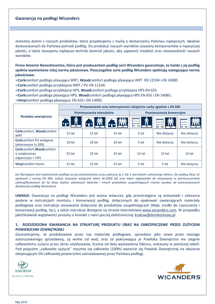 Gwarancja na podłogi Wicanders Jesteśmy dumni z naszych produktów, które projektujemy z myślą o dostarczaniu Państwu najlepszych, idealnie dostosowanych do Państwa potrzeb podłóg. Do produkcji naszych wyrobów używany komponentów o najwyższej jakości, a także stosujemy najlepsze techniki kontroli jakości, aby zapewnić trwałość oraz niezawodność naszych wyrobów. Firma Amorim Revestimentos, która jest producentem podłóg serii Wicanders gwarantuje, że każda z jej podłóg spełnia wymienione niżej normy jakościowe. Poszczególne serie podłóg Wicanders spełniają następujące normy jakościowe: • Corkcomfort podłoga pływająca WRT, Woodcomfort podłoga pływająca WRT EN 12104 i EN 14085 • Corkcomfort podłoga przyklejana WRT / PU EN 12104; • Corkcomfort podłoga przyklejana HPS, Woodcomfort podłoga przyklejana HPS EN 655 • Corkcomfort podłoga pływająca HPS, Woodcomfort podłoga pływająca HPS EN 655 i EN 14085; • Vinylcomfort podłoga pływająca: EN 652 i EN 14085. Przeznaczenie oraz intensywność natężenia ruchy zgodnie z EN 685 Pomieszczenia mieszkalne Pomieszczenia komercyjne Powłoka zewnętrzna Corkcomfort, Woodcomfort WRT Corkcomfort PU wstępnie lakierowane (s.200) Corkcomfort,Woodcomfort o zwiększonej odporności + HPS Vinylcomfort Home 15 lat 15 lat 15 lat 5 lat Nie dotyczy Nie dotyczy 10 lat 10 lat 10 lat 5 lat Nie dotyczy Nie dotyczy 25 lat 25 lat 25 lat 15 lat 15 lat 15 lat 15 lat 15 lat 15 lat 5 lat 5 lat Nie dotyczy (a) Wymagane jest wykończenie podłogi po jej zamontowaniu przez pokrycie ją 1 lub 2 warstwami zalecanego lakieru. Do podług klasy 31 zgodnych z normą EN 685, należy stosować wyłącznie lakier W-2000 lub inny lakier odpowiedni do stosowania w pomieszczeniach zaklasyfikowanych do tej klasy (wykaz zalecanych lakierów i innych produktów uzupełniających można uzyskać od autoryzowanych dostawców podłóg Wicanders). UWAGA: Gwarancja na podłogi Wicanders jest ważna wówczas, gdy przestrzegane są wskazówki i zalecenia podane w instrukcjach montażu i konserwacji podłóg, dołączonych do opakowań zawierających materiały podłogowe oraz instrukcje stosowania dołączone do produktów uzupełniających (kleje, środki do czyszczenia i konserwacji podłóg, itp.), a także instrukcje dostępne na stronie internetowej www.wicanders.com. W przypadku jakichkolwiek wątpliwości prosimy o kontakt z nami pocztą elektroniczną: [email protected] 1. ROZSZERZONA GWARANCJA NA STRUKTURĘ PRODUKTU ORAZ NA ZABEZPIECZENIE PRZED ZUŻYCIEM POWIERZCHNI ZEWNĘTRZNEJ Gwarantujemy, że produkowane przez nas materiały podłogowe, sprzedane jako nowe przez naszego autoryzowanego sprzedawcę, są wolne od wad, oraz że pokrywająca je Powłoka Zewnętrzna nie ulegnie całkowitemu zużyciu przez okres użytkowania, liczony od daty wystawienia faktury, wskazany w poniższej tabeli: Pod pojęciem „całkowite zużycie” rozumie się całkowite (100%) wytarcie się Powłoki Zewnętrznej na obszarze obejmującym 5% całkowitej powierzchni zainstalowanej przez Państwa podłogi. Maj 2010 Gwarancja na podłogi Wicanders 2. WARUNKI ROZSZERZONEJ GWARANCJI W mało prawdopodobnym przypadku, gdyby nasze produkty zakupione przez Państwa nie spełniały warunków określonych w odpowiedniej gwarancji, zobowiązujemy się do (zgodnie z naszym uznaniem) naprawy, odnowienia lub wymiany wadliwej partii towaru na towar taki sam lub równorzędny (według naszego wyboru), lub do zwrotu kosztów zakupu, jeśli wymiana lub narawa nie będzie możliwa w uzgodnionym terminie lub ze względów praktycznych. A) W ciągu pierwszych pięciu (5) lat trwania okresu gwarancyjnego ponosimy pełną odpowiedzialność związaną z usunięciem wadliwego produktu oraz instalacją produktu zamiennego, BEZ ŻADNYCH DODATKOWYCH KOSZTÓW Z PAŃSTWA STRONY. Po upływie tego okresu (gdy będzie to dotyczyło kwestionowanego produktu), nasza odpowiedzialność z tytułu gwarancji ogranicza się wyłącznie do zapewnienia towaru na wymianę, zgodnie z okresem użytkowania podanym w poniższej tabeli. 2 B) Wartość każdego m wymienianych elementów podłogowych wynosi: Okres (lata) 0-5 6-10 11-20 21-25 Pokrycie 100% + koszty wymiany 100% 50% 25% 3. WYJĄTKI NIE OBJĘTE GWARANCJĄ Gwarancja dotyczy wyłącznie materiałów podłogowych sprzedanych jako „pierwszy gatunek”. Żaden instalator, sprzedawca, agent lub pracownik nie jest upoważniony do wprowadzania jakichkolwiek zmian dotyczących zobowiązań oraz ograniczeń określonych w niniejszej gwarancji. Niniejsza gwarancja: 1) jest ważna od daty zakupu, 2) dotyczy tylko materiałów podłogowych w pierwotnym miejscu zainstalowania, 3) rozciąga się tylko na końcowego użytkownika i zarazem nabywcę wymienionego w fakturze, 4) nie przenosi się na inne osoby, 5) traci ważność z chwilą odsprzedania produktu innej osobie lub zamontowania go w innym niż pierwotne miejscu. Gwarancja nie obejmuje następujących przypadków: 3.1. Montaż nie został wykonany zgodnie z odpowiednimi procedurami lub wykonano go przy użyciu materiałów uzupełniających nie posiadających akceptacji – montaż wykonany niezgodnie z instrukcjami montażu i konserwacji podłóg Wicanders. 3.2. Nieprawidłowo lub nieodpowiednio przygotowane podłoże lub podkład. Informacje na ten temat podane są w instrukcjach montażu i konserwacji podłóg Wicanders. 3.3. Dobór produktu nieprawidłowy lub nieodpowiedni do natężenia ruchu pieszego w miejscu zainstalowania podłogi. Informacje na ten temat podane są w instrukcjach montażu i konserwacji podłóg Wicanders. 3.4. Nieprawidłowa konserwacja podłogi lub użycie materiałów uzupełniających nie posiadających akceptacji. Informacje na ten temat podane są w instrukcjach montażu i konserwacji podłóg Wicanders. 3.5. Niedozwolona modyfikacja lub naprawa. Dotyczy sytuacji, gdy prace związane z modyfikacją, renowacją lub naprawą zostały wykonane, mimo iż nie s