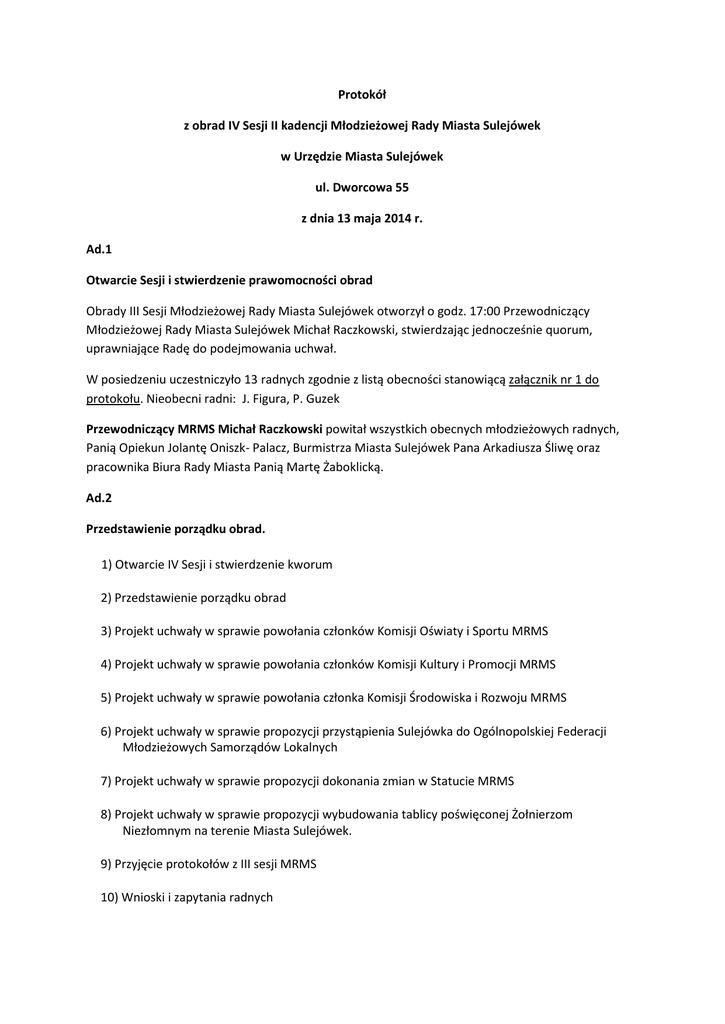 Protokół z obrad IV Sesji II kadencji Młodzieżowej Rady Miasta Sulejówek w Urzędzie Miasta Sulejówek ul. Dworcowa 55 z dnia 13 maja 2014 r. Ad.1 Otwarcie Sesji i stwierdzenie prawomocności obrad Obrady III Sesji Młodzieżowej Rady Miasta Sulejówek otworzył o godz. 17:00 Przewodniczący Młodzieżowej Rady Miasta Sulejówek Michał Raczkowski, stwierdzając jednocześnie quorum, uprawniające Radę do podejmowania uchwał. W posiedzeniu uczestniczyło 13 radnych zgodnie z listą obecności stanowiącą załącznik nr 1 do protokołu. Nieobecni radni: J. Figura, P. Guzek Przewodniczący MRMS Michał Raczkowski powitał wszystkich obecnych młodzieżowych radnych, Panią Opiekun Jolantę Oniszk- Palacz, Burmistrza Miasta Sulejówek Pana Arkadiusza Śliwę oraz pracownika Biura Rady Miasta Panią Martę Żaboklicką. Ad.2 Przedstawienie porządku obrad. 1) Otwarcie IV Sesji i stwierdzenie kworum 2) Przedstawienie porządku obrad 3) Projekt uchwały w sprawie powołania członków Komisji Oświaty i Sportu MRMS 4) Projekt uchwały w sprawie powołania członków Komisji Kultury i Promocji MRMS 5) Projekt uchwały w sprawie powołania członka Komisji Środowiska i Rozwoju MRMS 6) Projekt uchwały w sprawie propozycji przystąpienia Sulejówka do Ogólnopolskiej Federacji Młodzieżowych Samorządów Lokalnych 7) Projekt uchwały w sprawie propozycji dokonania zmian w Statucie MRMS 8) Projekt uchwały w sprawie propozycji wybudowania tablicy poświęconej Żołnierzom Niezłomnym na terenie Miasta Sulejówek. 9) Przyjęcie protokołów z III sesji MRMS 10) Wnioski i zapytania radnych 11) Sprawy różne 12) Zamknięcie IV Sesji. Przewodniczący MRMS Michał Raczkowski: czy ktoś z radnych ma jakieś uwagi do porządku obrad? Przewodniczący MRMS Michał Raczkowski wniósł o wniesienie do porządku obrad w punkcie 9 Stanowiska w sprawie uczczenia rocznic śmierci i urodzin Witolda Pileckiego. Przewodniczący MRMS Michał Raczkowski: kto jest za włączeniem tego do porządku obrad? Młodzieżowa Rada Miasta Sulejówek w głosowaniu jawnym 10 głosów ,,za” włączeniem Stanowiska w sprawie uczczenia rocznic śmierci i urodzin Witolda Pileckiego do porządku obrad, 0 głosów ,,przeciw” i przy 3 głosach ,,wstrzymujących się” przyjęła wniosek Przewodniczącego Michała Raczkowskiego o włączenie do porządku obrad w punkcie 9 w/w stanowiska. Wobec tego punkt 9 to Stanowisko, 10 to 11, 11 to 12 i 12 to 13. Ad. 3 Projekt uchwały w sprawie: powołania członka Komisji Oświaty i Sportu Młodzieżowej Rady Miasta Sulejówek. Przewodniczący MRMS Michał Raczkowski odczytał projekt uchwały, a następnie poddał go pod głosowanie. Młodzieżowa Rada Miasta Sulejówek w głosowaniu jawnym 13 głosów ,,za” jednogłośnie podjęła uchwałę nr IV/ 11/2014 w sprawie powołania członka Komisji Oświaty i Sportu Młodzieżowej Rady Miasta Sulejówek. Obecnych 13 radnych. Uchwała stanowi załącznik nr 2 do protokołu. Ad. 4 Projekt uchwały w sprawie: powołania członków Komisji Kultury i Promocji Młodzieżowej Rady Miasta Sulejówek. Przewodniczący MRMS Michał Raczkowski odczytał projekt uchwały, a następnie poddał go pod głosowanie. Młodzieżowa Rada Miasta Sulejówek w głosowaniu jawnym 13 głosów ,,za” jednogłośnie podjęła uchwałę nr IV/ 12/2014 w sprawie powołania członków Komisji Kultury i Promocji Młodzieżowej Rady Miasta Sulejówek. Obecnych 13 radnych. Uchwała stanowi załącznik nr 3 do protokołu. Ad. 5 Projekt uchwały w sprawie: powołania członka Komisji Środowiska i Rozwoju Młodzieżowej Rady Miasta Sulejówek. Przewodniczący MRMS Michał Raczkowski odczytał projekt uchwały, a następnie poddał go pod głosowanie. Młodzieżowa Rada Miasta Sulejówek w głosowaniu jawnym 13 głosów ,,za” jednogłośnie podjęła uchwałę nr IV/ 13/2014 w sprawie powołania członka Komisji Środowiska i Rozwoju Młodzieżowej Rady Miasta Sulejówek. Obecnych 13 radnych. Uchwała stanowi załącznik nr 4 do protokołu. Ad. 6 Projekt uchwały w sprawie: propozycji przystąpienia Sulejówka do Ogólnopolskiej Federacji Młodzieżowych Samorządów Lokalnych. Przewodniczący MRMS Michał Raczkowski odczytał projekt uchwały i uzasadnienie. Ogólnopolska Federacja Młodzieżowych Samorządów Lokalnych jest niedochodowym stowarzyszeniem gmin i powiatów, w których funkcjonują młodzieżowe samorządy lokalne. Federacja wspiera działalność młodzieżowych samorządów lokalnych, które powstają od 1990 roku, tj. od chwili odrodzenia polskiego samorządu terytorialnego. Ich celem jest partnerskie współuczestniczenie młodzieży w życiu społeczności lokalnej. Samorządy te skupiają młodych ludzi, którzy cieszą się ogólnym zaufaniem rówieśników, są aktywni w swoim środowisku lokalnym oraz dążą do partnerskiej współpracy z władzami samorządowymi. Ta specyficzna i nowatorska forma aktywności młodzieży uczy młodych współodpowiedzialności za jakość funkcjonowania społeczności lokalnej. Działania te są jedną z form umacniania postaw demokratycznych przemian zapoczątkowanych w 1990 roku w dziedzinie samorządu terytorialnego. O ich skuteczności decydują takie czynniki jak wiedza, umiejętności oraz partnerskie relacje z dorosłymi. Federacja dąży do zapewnienia tych warunków. Obecnie Federacja zrzesza 24 członków z całej Polski, głównie gminy miejskie. Przystąpienie Miasta Sulejówek do Ogólnopolskiej Federacji Młodzieżowych Samorządów Lokalnych mogłoby stworzyć Młodzieżowej Radzie Miasta Sulejówek wymierne korzyści wynikające z możliwości wymiany doświadczeń z młodzieżowymi radami innych miast, które są już zrzeszone w tym stowarzyszeniu. Jest to szczególnie istotne ze względu na to, że Młodzieżowa Rada Miasta Sulejówek jest młodym stażem młodzieżowym samorządem lokalnym. Możliwość współpracy z innymi młodzieżowymi radami, dzięki obecności miasta w tej organ