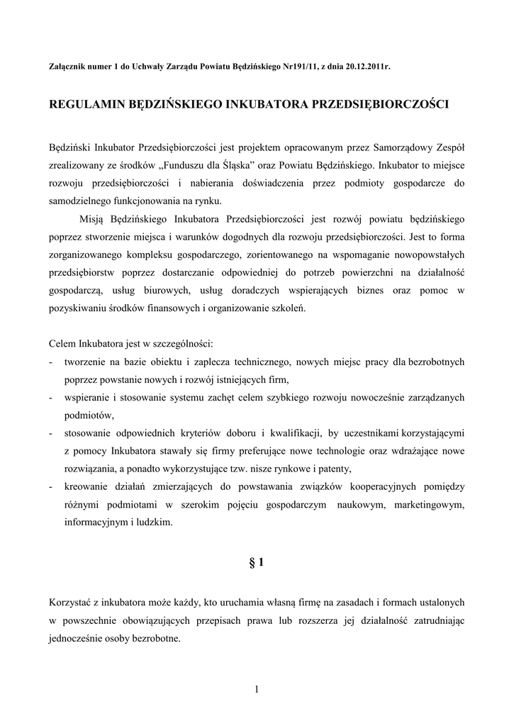 Załącznik numer 1 do Uchwały Zarządu Powiatu Będzińskiego Nr191/11, z dnia 20.12.2011r. REGULAMIN BĘDZIŃSKIEGO INKUBATORA PRZEDSIĘBIORCZOŚCI Będziński Inkubator Przedsiębiorczości jest projektem opracowanym przez Samorządowy Zespół zrealizowany ze środków „Funduszu dla Śląska” oraz Powiatu Będzińskiego. Inkubator to miejsce rozwoju przedsiębiorczości i nabierania doświadczenia przez podmioty gospodarcze do samodzielnego funkcjonowania na rynku. Misją Będzińskiego Inkubatora Przedsiębiorczości jest rozwój powiatu będzińskiego poprzez stworzenie miejsca i warunków dogodnych dla rozwoju przedsiębiorczości. Jest to forma zorganizowanego kompleksu gospodarczego, zorientowanego na wspomaganie nowopowstałych przedsiębiorstw poprzez dostarczanie odpowiedniej do potrzeb powierzchni na działalność gospodarczą, usług biurowych, usług doradczych wspierających biznes oraz pomoc w pozyskiwaniu środków finansowych i organizowanie szkoleń. Celem Inkubatora jest w szczególności: - tworzenie na bazie obiektu i zaplecza technicznego, nowych miejsc pracy dla bezrobotnych poprzez powstanie nowych i rozwój istniejących firm, - wspieranie i stosowanie systemu zachęt celem szybkiego rozwoju nowocześnie zarządzanych podmiotów, - stosowanie odpowiednich kryteriów doboru i kwalifikacji, by uczestnikami korzystającymi z pomocy Inkubatora stawały się firmy preferujące nowe technologie oraz wdrażające nowe rozwiązania, a ponadto wykorzystujące tzw. nisze rynkowe i patenty, - kreowanie działań zmierzających do powstawania związków kooperacyjnych pomiędzy różnymi podmiotami w szerokim pojęciu gospodarczym naukowym, marketingowym, informacyjnym i ludzkim. §1 Korzystać z inkubatora może każdy, kto uruchamia własną firmę na zasadach i formach ustalonych w powszechnie obowiązujących przepisach prawa lub rozszerza jej działalność zatrudniając jednocześnie osoby bezrobotne. 1 §2 Pierwszeństwo mają przedsięwzięcia: - wdrażające nowoczesne technologie, patenty, innowacyjność, zajmujące się transferem technologii do gospodarki itp.; - podejmowane przez osoby bezrobotne; - podejmowane przez osoby rozpoczynające prowadzenie działalności gospodarczej lub gdy działalność ta nie trwa dłużej niż jeden rok; - podejmowane przez mieszkańców Powiatu Będzińskiego. §3 Będziński Inkubator Przedsiębiorczości oferuje podmiotom podejmującym działalność gospodarczą preferencyjne stawki od wynajmowanej powierzchni, doradztwo, dostęp do infrastruktury internetowej, usługi biurowe, szkolenia, korzystanie z parkingu i ochronę obiektu. §4 1. Podstawą wyboru i uczestnictwa danego podmiotu w Inkubatorze jest złożenie wniosku o przystąpienie do Będzińskiego Inkubatora Przedsiębiorczości, który stanowi załącznik nr 1 do Regulaminu, wraz z oświadczeniem o braku podstaw do wykluczenia i dokumentami dotyczącymi prowadzonej działalności gospodarczej (zał. nr 2). Oceny złożonych wniosków dokonuje Pełnomocnik Zarządu d/s Będzińskiego Inkubatora Przedsiębiorczości, który ma prawo zażądać od ubiegającego się o przystąpienie biznes planu. Pisemna opinia Pełnomocnika jest przedstawiana Zarządowi Powiatu w terminie nie dłuższym niż 30 dni od daty zakończenia składania wniosków na wolne powierzchnie. 2. Podmioty, które rozszerzają swoją działalność dodatkowo zobowiązane są do przedłożenia aktualnego: a. zaświadczenia z Urzędu Skarbowego o nie zaleganiu w zapłacie zobowiązań podatkowych (ważne przez okres jednego miesiąca od daty wystawienia); b. zaświadczenia z Zakładu Ubezpieczeń Społecznych o nie zaleganiu ze składkami na ubezpieczenie społeczne (ważne przez okres jednego miesiąca od daty wystawienia); 2 c. sprawozdania finansowego z ostatniego półrocza przed terminem przystąpienia do Inkubatora. 3. W przypadku rozszerzenia lub zmiany profilu działalności na inny niż deklarowany we wniosku (załącznikach) o przyjęcie do Będzińskiego Inkubatora Przedsiębiorczości, podmiot jest zobowiązany do pisemnego poinformowania Pełnomocnika, który ma prawo ponownej oceny zasadności przyjęcia podmiotu w poczet Inkubatora. 4. Każdorazowo, gdy podmiot dołącza potwierdzone przez siebie kopie dokumentów koniecznym jest okazanie Pełnomocnikowi ich oryginałów. §5 1. Nadzór nad funkcjonowaniem Będzińskiego Inkubatora Przedsiębiorczości sprawuje Pełnomocnik Zarządu d/s zarządzania Będzińskim Inkubatorem Przedsiębiorczości powołany uchwałą Zarządu Powiatu Będzińskiego. 2. Pełnomocnik wypełnia obowiązki polegające na bieżącym zarządzaniu Inkubatorem, a w szczególności: a. dobór kandydatów do Będzińskiego Inkubatora Przedsiębiorczości, b. oferowanie powierzchni przygotowanej do prowadzenia działalności biurowej, usługowej, produkcyjnej, i magazynowej nowopowstających firm na terenie Powiatu Będzińskiego do czasu usamodzielnienia się na rynku, c. nadzór nad funkcjonowaniem podmiotów przyjętych w poczet Inkubatora, d. prowadzenia usług doradczych w zakresie prowadzenia działalności, e. pozyskiwania środków finansowych oraz organizowanie w tym zakresie szkoleń, f. pomoc przy tworzeniu miejsc pracy, g. zawierania umów najmu sali konferencyjnej na okres do jednego miesiąca kalendarzowego lub do 30 dni roboczych. §6 O przyjęciu podmiotu gospodarczego do Inkubatora decyduje Pełnomocnik Zarządu Powiatu Będzińskiego d/s zarządzania Będzińskim Inkubatorem Przedsiębiorczości, w wypadku gdy 3 podpisywana jest również umowa najmu decyzja w sprawie przyjęcia, może nastąpić tylko po uzyskaniu zgody Zarządu Powiatu Będzińskiego na podpisanie umowy najmu. §7 1. Z uczestnictwa w Inkubatorze wykluczone są podmioty, które prowadzą działalność: a. stanowiącą zagrożenie dla środowiska naturalnego, b. uciążliwą dla pozostałych podmiotów działających w Inkubatorze, c. sprzeczną z powszechnie przyjętymi no