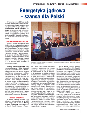 WYDARZENIA ● POGLĄDY ● OPINIE ● KOMENTARZE Energetyka jądrowa - szansa dla Polski Czytelne stanowisko rządu RP Pragnąc sprostać rosnącemu zapotrzebowaniu na energię elektryczną oraz wywiązać się z międzynarodowych zobowiązań zakładających ograniczanie źródeł energii powodujących szkodliwe emisje, rząd Polski zatwierdził Polski Program Energetyki Jądrowej, z którego wynika, że począwszy od roku 2023 będziemy wytwarzać energię elektryczną w naszej pierwszej elektrowni jądrowej. Kolejna elektrownia w Polsce o podobnej mocy ok. 3 tys. MW ma zostać zbudowana w terminie późniejszym. Zdaniem Hanny Trojanowskiej, Pełnomocnik Rządu ds. Polskiej Energetyki Jądrowej i Podsekretarz Stanu w Ministerstwie Gospodarki, uruchomienie łącznie 6 tys. MW mocy zainstalowanej w polskich elektrowniach atomowych umożliwi redukcję emisji CO2, aż o 47 milionów ton rocznie, w porównaniu do energii uzyskiwanej z paliw kopalnych. „Energetyka jądrowa nie jest panaceum na nasze wszystkie problemy energetyczne, ale stanowi oczywiście bardzo ważną część ich rozwiązania” – stwierdziła Hanna Trojanowska. Dodała też, że „program budowy w Polsce elektrowni jądrowej może stać się kołem zamachowym rozwoju kraju oraz poprawić innowacyjność i konkurencyjność całej polskiej gospodarki”. Tertium non datur? W swoim ciekawym referacie zatytułowanym „Europejski sen o czystej i taniej energii” prof. dr hab. inż. Andrzej Grzegorz Chmielewski, dyrektor Instytutu Chemii i Techniki Jądrowej w Warsza- Foto Wojciech Głuszewski W zorganizowanym 29 listopada br. w Hotelu Sheraton przez PowerMeetings. pl oraz magazyn The Warsaw Voice, przy współpracy z PGE Energia Jądrowa Międzynarodowym Forum Energetyki Jądrowej udział wzięło prawie 200 uczestników, reprezentujących świat biznesu, polityki, nauki i mediów. Obecni byli także dyplomaci z USA, Wielkiej Brytanii, Japonii i Francji oraz eksperci z wielu krajów świata. Otwarcie Forum, w imieniu organizatorów uczestników Forum wita prof. Andrzej Kraszewski (w środku z mikrofonem) wie, z jednej strony rozwiał wiele mitów związanych funkcjonowaniem sektora energetyki i nadmiernymi oczekiwaniami społeczeństwa, w tym też polityków, co do wydatnego w najblizszych latach zwiększenia ilości produkowanej energii ze źródeł odnawialnych. Z drugiej profesor A. G. Chmielewski zaproponował szereg konkretnych rozwiązań technologicznych, których zastosowanie może sprzyjać samodzielności energetycznej Polski oraz produkcji energii po relatywnie niskich kosztach. W swe konkluzji prelegent zaznaczył, iż trzeba dokonać nie tylko rachunków kosztów związanych z wprowadzeniem energetyki jądrowej. Należy zrobić też rachunek kosztów i dokładnie policzyć straty w wypadku, jeślibyśmy w Polsce zrezygnowali ze wzmocnienia krajowej energetyki blokami jądrowymi. „Nie mamy wyjścia. Przyszłością jest dla nas jedynie węgiel i energetyka jądrowa” – ocenił w czasie Forum. Jednym słowem chciałoby nsie w tym miejscu przywołać maksyme starożytnych: Tertium non datur. Andrzej Boroń, Sekretarz Generalny Stowarzyszenia Elektryków Polskich przedstawił w kwestii energetyki jądrowej stanowisko swej organizacji. Stwierdził, że energetyka jądrowa to przyjazne środowisku źródło energii elektrycznej. Według niego to także energia tania, znacznie tańsza niż ta otrzymywana z wiatru i słońca. Andrzej Boroń określił program inwestycji w energetykę jądrową jako racjonalne strategiczne rozwiązanie, zapewniające naszemu krajowi bezpieczeństwo energetyczne na okres stu lat. Nadmieniając, że zasoby węgla wystarczą Polsce na około 40 lat, po czym trzeba będzie znaleźć jakieś inne źródło energii. „Obecnie światowa opinia publiczna dzieli się na zwolenników i przeciwników energetyki jądrowej. Przeciwnicy energetyki jądrowej wskazują m.in. na skażenie środowiska, wzrost zachorowalności na choroby nowotworowe czy niebezpieczeństwo związane z utylizacją odpadów promieniotwórczych. Opinia taka jest podtrzymywana przez nagłaśnianie i wyMagazyn Energetyki Jądrowej pro Atom, nr 4/2012 11 olbrzymianie dotychczasowych awarii w elektrowniach jądrowych. Nowoczesne rozwiązania technologiczne stosowane obecnie w energetyce jądrowej zapewniają zdecydowanie większą niż wcześniej niezawodność, ekonomiczność i bezpieczeństwo ludzi oraz lepszą ochronę środowiska” – stwierdził na Forum dr inż. Krzysztof Rzymkowski, Sekretarz Generalny Stowarzyszenia Ekologów na Rzecz Energii Jądrowej (SEREN). Przytoczył przy tym opinię James’a Ephraim’a Lovelock’a, brytyjskiego naukowca, ekologa, członka stowarzyszenia Environmentalists For Nuclear Energy (Ekolodzy na Rzecz Energii Nuklearnej), który uważa wręcz, że tylko energia jądrowa może wstrzymać proces globalnego ocieplenia i jest jedynym realnym alternatywnym i bezpiecznym źródłem energii dla paliw kopalnych, dostarczającym w sposób stabilny energię na wielką skalę przy jednoczesnym braku emisji gazów cieplarnianych. Uczestnicy Forum w sali konferencyjnej w Hotelu Sheraton płynąć pod prąd w sytuacji, gdy sąsiadujące z Polską Niemcy, podobnie jak Szwajcaria i Belgia, zdecydowały o zamknięciu swoich elektrowni atomowych i skierowaniu wydatków na odnawialne źródła energii. Francja z kolei zamierza zredukować udział energetyki jądrowej w swoim bilansie energetycznym do 50% w roku 2025. Opinię, że nowoczesne technologie nuklearne są w pełni bezpieczne wyraził natomiast Robert Pearce, Dyrektor Międzynarodowego Projektu Budowy reaktora AP1000 w amerykańskiej fir- Foto Wojciech Głuszewski „Rządowa nowomowa”? Dariusz Szwed, Przewodniczący Partii Zielonych 2004, jako jedyny uczestnik panelu dyskusyjnego wyrażał sprzeciw wobec energii atomowej. Jego zdaniem, wbrew „rządowej propagandzie”, społeczeństwo polskie jest przeciwne energetyce jądrowe