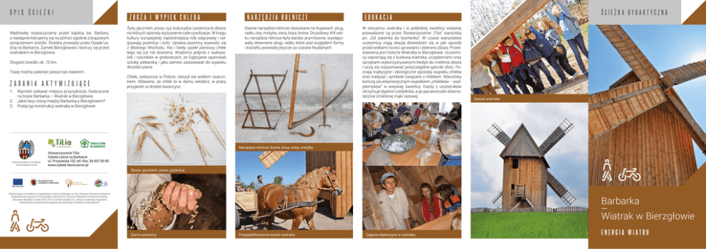 OPIS ŚCIEŻKI Wędrówkę rozpoczynamy przed kaplicą św. Barbary, a następnie kierujemy się na północ zgodnie z brązowym oznaczeniem ścieżki. Ścieżka prowadzi przez Osadę Leśną na Barbarce, Zamek Bierzgłowski i kończy się przed wiatrakiem w Bierzgłowie. Długość ścieżki: ok. 12 km. Trasę można pokonać pieszo lub rowerem. ZADANIA AKTYWIZUJĄCE 1. Wymień ciekawe miejsca przyrodnicze, historyczne na trasie Barbarka – Wiatrak w Bierzgłowie. 2. Jakie lasy rosną między Barbarką a Bierzgłowem? 3. Podaj typ konstrukcji wiatraka w Bierzgłowie. ZBOŻA I WYPIEK CHLEBA Żyto, jęczmień, proso, ryż, kukurydza i pszenica to zboża, na których opierały wyżywienie całe cywilizacje. W kręgu kultury europejskiej najistotniejszą rolę odgrywały i odgrywają pszenica i żyto. Uprawa pszenicy wywodzi się z Bliskiego Wschodu. Kto i kiedy upiekł pierwszy chleb tego się już nie dowiemy. Wiadomo jedynie z wykopalisk i rysunków w grobowcach, że Egipcjanie opanowali sztukę piekarską i jako pierwsi zastosowali do wypieku drożdże piwne. NARZĘDZIA ROLNICZE Dawne narzędzia rolnicze stosowane na Kujawach: pług, radło, cep, motyka, sierp, kosa, brona. Do połowy XIX wieku narzędzia rolnicze były bardzo prymitywne, występowały drewniane pługi, radła, które pod względem formy i kształtu powstały jeszcze za czasów feudalnych. Chleb, zwłaszcza w Polsce, cieszył się wielkim szacunkiem. Mówiono, że chleb to w domu włodarz, w pracy przyjaciel, w drodze towarzysz. ŚCIEŻKA DYDAKTYCZNA EDUKACJA W otoczeniu wiatraka i w pobliskiej świetlicy wiejskiej prowadzone są przez Stowarzyszenie „Tilia” warsztaty pn. „Od ziarenka do bochenka”. W czasie warsztatów uczestnicy mają okazję dowiedzieć się w jaki sposób przed wiekami na wsi uprawiano i zbierano zboża. Przedstawiana jest historia Wiatraka w Bierzgłowie. Uczestnicy zapoznają się z budową wiatraka, urządzeniami oraz sprzętami wykorzystywanymi kiedyś do mielenia zboża i uczą się rozpoznawać poszczególne gatunki zbóż. Poznają tradycyjne i ekologiczne sposoby wypieku chleba oraz tradycje i symbole związane z chlebem. Warsztaty kończą się własnoręcznym wypiekiem „chlebków – podpłomyków” w wiejskiej świetlicy. Każdy z uczestników otrzymuje dyplom czeladnika, a grupa woreczek własnoręcznie zmielonej mąki razowej. EDUKACJA Zadania aktywizujące: 1. Wymień ciekawe miejsca przyrodnicze, historyczne na trasie Barbarka – Wiatrak w Bierzgłowie. 2. Jakie lasy rosną między Barbarką, a Bierzgłowem? 3. Podaj typ konstrukcji wiatraka w Bierzgłowie. Dyszel wiatraka Narzędzia rolnicze: brona, kosa, sierp, motyka Dofinansowano ze środków Gminy Miasta Toruń Stowarzyszenie Tilia Szkoła Leśna na Barbarce ul. Przysiecka 132, tel./fax: 56 657 60 85 www.szkola-lesna.torun.pl Zboża: jęczmień, owies, pszenica Sfinansowano ze środków Europejskiego Funduszu Rolnego na rzecz Rozwoju Obszarów Wiejskich, Województwa Kujawsko-Pomorskiego, Krajowej Sieci Obszarów Wiejskich, Programu Rozwoju Obszarów Wiejskich na lata 2007-2013 w ramach projektu pn. „Aktywna edukacja regionalna mieszkańców województwa kujawsko-pomorskiego w wiatraku w Bierzgłowie”. Barbarka – Wiatrak w Bierzgłowie Ziarno pszenicy Przejażdżka konna wokół wiatraka Zajęcia edykacyjne w wiatraku ENERGIA WIATRU M ŁYN NA BARBARCE BRĄCHNOWO Barbarka to dawna osada młyńska. W okresie średniowiecza należała do Komturstwa Bierzgłowo. W 1299 roku w księgach Komturii Krzyżackiej na Zamku Bierzgłowskim pojawiła się pierwsza pisemna wzmianka o osadzie nazywanej Bormol co znaczyło „młyn w borze”, w której zbudowano kaplicę pod wezwaniem św. Barbary. BIERZGŁOWO ŁUBIANKA Była to jak na owe czasy wielka osada z młynem. Młyn napędzany był wodą wypływającą kilkoma źródłami z pobliskiego zalesionego stoku. PIGŻA WIATRAK BIERZGŁOWSKI Wiatrak to młyn wietrzny, który wykorzystuje siłę wiatru do napędu kamieni młyńskich, które mielą wsypywane pomiędzy nie zboże. Głównym elementem wiatraka są cztery skrzydła zwane śmigami, które napędzają wał zakończony wielkim kołem palecznym. Koło to przekazywało poziomy ruch obrotowy wału na pionowy, który obracał kamienie młyńskie. Żarna Historia wiatraka bierzgłowskiego liczy ponad sto pięćdziesiąt lat. Podczas inwentaryzacji dokonanej przed rozpoczęciem prac konserwatorskich odnaleziono belkę z napisem: „Piotr Jasinowski 1867 rok”. Właścicielem wiatraka była rodzina Walterów. Władysław Walter, ostatni z młynarzy, obsługiwał młyn do 1958 roku. W następnych latach wiatrak był nieczynny. W 2007 roku rodzina Walterów przekazała swoja własność Parafii Wniebowzięcia NMP w Bierzgłowie. Parafia rozpoczęła starania o odbudowę. Do 1415 roku młyn należał do Komturstwa Bierzgłowo, a następnie do Komturstwa Toruń. ZAMEK BIERZGŁOWSKI LESZCZ ŚWIERCZYNKI RÓŻANKOWO Wiatrak bierzgłowski, a właściwie młyn wiatrowy swój stan zachowania zawdzięcza ukończonej w 2011 roku rekonstrukcji. Jest jednym z najcenniejszych zabytków dawnej kultury wiejskiej na terenie gminy Łubianka oraz na całej dawnej ziemi chełmińskiej. LEGENDA Ryc. Barbarka – dawna osada młyńska Czarne Błoto Trasa ścieżki W XV wieku król Kazimierz Jagiellończyk nadał prawo podstawowe nad młynem Toruniowi. Wypożyczalnia rowerów Trasa rowerowa Parking Stacja benzynowa CEGIELNIK Leśniczówka Pomnik CZARNE BŁOTO Grodzisko Zamek Miejsce martyrologii BARBARKA Kapliczka zabytkowa ŚCIEŻKA Ścieżka dydaktyczna Barbarka – Wiatrak w Bierzgłowie obejmuje interesujące pod względem historycznym i przyrodniczym miejsca pomiędzy Barbarką, Zamkiem Bierzgłowskim i Wiatrakiem w Bierzgłowie. Ścieżka powstała w celu zapoznania z lokalnymi zasobami historycznymi, kulturowymi oraz turystycznymi wyremontowanego wiatraka w Bierzgłowie. W wiatraku i w świetlicy wiejskiej w Bierzgłowie pracownicy Stowarzys