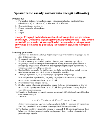 Sprawdzenie zasady zachowania energii całkowitej Przyrządy: 1. Przyrząd do badania ruchu obrotowego , z trzema szpulami do nawijania linki, o średnicach: d1 23,4 mm , d 2 33,6 mm , d 3 45,6 mm . 2. Obciążniki tarczy obrotowej. 3. Zestaw ciężarków z haczykami. 4. Linka. 5. Stoper. Uwaga: Przyrząd do badania ruchu obrotowego jest urządzeniem delikatnym. Ćwiczenia wykonujemy z dużą ostrożnością – tak, by nie uszkodzić przyrządu. W szczególności tarczę należy zatrzymywać chwytając delikatnie za podstawę lub wierzch szpuli do nawijania linki. Przebieg pomiarów: 1. Zapoznać się z instrukcją obsługi stopera używanego w ćwiczeniu, znajdującą się na stole ćwiczeniowym. 2. Wyznaczyć masę ciężarka m . 3. Umieścić na tarczy obciążniki, zgodnie z instrukcjami prowadzącego zajęcia. 4. Do jednego z końców linki podwiesić ciężarek. Linkę przewiesić przez bloczek i zaczepić jej drugi koniec do uchwytu znajdującego się przy szpuli o promieniu r , wskazanej przez prowadzącego zajęcia. 5. Nawinąć linkę na szpulę. Zwrócić uwagę, aby linka nawijała się na krążek tworząc pojedynczą warstwę oraz nie dotykała stołu poniżej bloczka. 6. Zmierzyć wysokość h0 na jakiej znajduje się ciężarek nad podłogą. 7. Dokonać pomiaru wysokości hn na jakiej znajduje się ciężarek nad podłogą, gdy tarcza obróci się o kąt 2π n n 1,2,3,4 . 8. Ponownie nawinąć linkę na szpulę. 9. Zwolnić tarczę, włączając jednocześnie stoper. Dokonać pomiaru czasu, w którym tarcza obróci się o kąt 2π n n 1,2,3,4 . Zatrzymać stoper i tarczę. Zapisać wszystkie zmierzone czasy t . 10. Powtórzyć dwukrotnie czynności opisane w punktach 8 i 9. Obliczyć wartość średnią czasu obrotu tarczy t . 11. Z równań: 12 t 2 , N m( g r ) i M N rN , t , V r obliczyć przyspieszenie kątowe , siłę naprężenia linki N , moment siły naprężenia linki M N , prędkość kątową tarczy oraz prędkość liniową ciężarka V . 12. Trzykrotnie powtórzyć czynności opisane w punktach 2–11, nawijając linkę na drugi bęben oraz dla innych mas ciężarków napinających linkę, zgodnie z instrukcjami prowadzącego zajęcia. 13. Przedstawić na jednym wykresie zależność wartości przyspieszenia kątowego od przyłożonego momentu siły M N dla wszystkich badanych przypadków. Metodą regresji liniowej, biorąc pod uwagę jednocześnie wszystkie punkty pomiarowe, wyznaczyć moment bezwładności tarczy wraz z obciążnikami I oraz wypadkowy moment sił oporu M T : M 1 MN T I I ya x b, 14. Dla każdego badanego przypadku obliczyć : energię potencjalną ciężarka: U c mgh , energię kinetyczną ciężarka: K c 12 mV 2 , energię kinetyczną tarczy: K tar 12 I 2 , zmianę energii wewnętrznej układu: U wew M T , energię całkowitą układu w chwili początkowej oraz po każdym obrocie tarczy. 15. Przedstawić na wykresie zależność wartości każdej energii w funkcji liczby obrotów tarczy, osobno dla każdego z czterech badanych przypadków. Tabele pomiarowe: m .......... kg , r .......... m , h0 .......... m n h [m] [rad] ti t [s] [s] N -2 [rads ] [N] MN [Nm] V -1 [rads ] [ms-1] 1 2 3 4 n Uc Kc K tar U wew Ecałk [J] [J] [J] [J] [J] 0 1 2 3 4 Uwaga: obie tabele należy skopiować czterokrotnie.