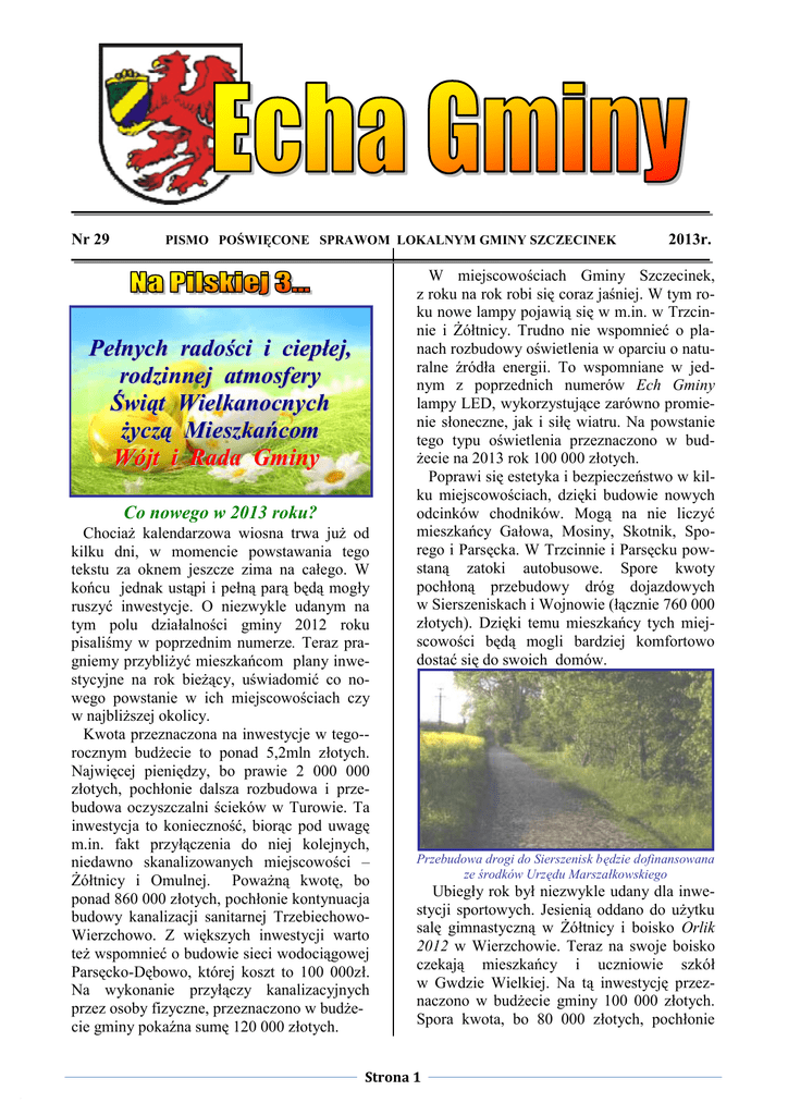 Nr 29 PISMO POŚWIĘCONE SPRAWOM LOKALNYM GMINY SZCZECINEK Pełnych radości i ciepłej, rodzinnej atmosfery Świąt Wielkanocnych życzą Mieszkańcom Wójt i Rada Gminy Co nowego w 2013 roku? Chociaż kalendarzowa wiosna trwa już od kilku dni, w momencie powstawania tego tekstu za oknem jeszcze zima na całego. W końcu jednak ustąpi i pełną parą będą mogły ruszyć inwestycje. O niezwykle udanym na tym polu działalności gminy 2012 roku pisaliśmy w poprzednim numerze. Teraz pragniemy przybliżyć mieszkańcom plany inwestycyjne na rok bieżący, uświadomić co nowego powstanie w ich miejscowościach czy w najbliższej okolicy. Kwota przeznaczona na inwestycje w tego-rocznym budżecie to ponad 5,2mln złotych. Najwięcej pieniędzy, bo prawie 2 000 000 złotych, pochłonie dalsza rozbudowa i przebudowa oczyszczalni ścieków w Turowie. Ta inwestycja to konieczność, biorąc pod uwagę m.in. fakt przyłączenia do niej kolejnych, niedawno skanalizowanych miejscowości – Żółtnicy i Omulnej. Poważną kwotę, bo ponad 860 000 złotych, pochłonie kontynuacja budowy kanalizacji sanitarnej TrzebiechowoWierzchowo. Z większych inwestycji warto też wspomnieć o budowie sieci wodociągowej Parsęcko-Dębowo, której koszt to 100 000zł. Na wykonanie przyłączy kanalizacyjnych przez osoby fizyczne, przeznaczono w budżecie gminy pokaźna sumę 120 000 złotych. 2013r. W miejscowościach Gminy Szczecinek, z roku na rok robi się coraz jaśniej. W tym roku nowe lampy pojawią się w m.in. w Trzcinnie i Żółtnicy. Trudno nie wspomnieć o planach rozbudowy oświetlenia w oparciu o naturalne źródła energii. To wspomniane w jednym z poprzednich numerów Ech Gminy lampy LED, wykorzystujące zarówno promienie słoneczne, jak i siłę wiatru. Na powstanie tego typu oświetlenia przeznaczono w budżecie na 2013 rok 100 000 złotych. Poprawi się estetyka i bezpieczeństwo w kilku miejscowościach, dzięki budowie nowych odcinków chodników. Mogą na nie liczyć mieszkańcy Gałowa, Mosiny, Skotnik, Sporego i Parsęcka. W Trzcinnie i Parsęcku powstaną zatoki autobusowe. Spore kwoty pochłoną przebudowy dróg dojazdowych w Sierszeniskach i Wojnowie (łącznie 760 000 złotych). Dzięki temu mieszkańcy tych miejscowości będą mogli bardziej komfortowo dostać się do swoich domów. Przebudowa drogi do Sierszenisk będzie dofinansowana ze środków Urzędu Marszałkowskiego Ubiegły rok był niezwykle udany dla inwestycji sportowych. Jesienią oddano do użytku salę gimnastyczną w Żółtnicy i boisko Orlik 2012 w Wierzchowie. Teraz na swoje boisko czekają mieszkańcy i uczniowie szkół w Gwdzie Wielkiej. Na tą inwestycję przeznaczono w budżecie gminy 100 000 złotych. Spora kwota, bo 80 000 złotych, pochłonie Strona 1 kontynuacja budowy zaplecza sportowego na boisku w Turowie. W budżecie gminy część środków przeznaczono na inwestycje kulturalne. Najwięcej, bo 250 000 złotych, pochłonie wykończenie świetlicy w Jeleninie. Za 60 000 złotych wykonany zostanie remont dachu i elewacji świetlicy w Gwdzie Wielkiej. Planuje się tez wykonanie i wyposażenie placu rekreacyjnosportowego w Omulnej. Na część zaplanowanych inwestycji gmina Szczecinek uzyskała dofinansowanie, zarówno ze środków Unii Europejskiej, jak i funduszy krajowych. Dotyczy to m.in. przebudowy dróg oraz budowy kanalizacji. Oczywiście powyższy artykuł nie wyczerpuje listy inwestycji zawartych w budżecie Gminy Szczecinek w 2013 roku. Teraz pozostaje liczyć na sprawną realizację wszystkich tegorocznych planów, bowiem każda z nowych inwestycji wpływa na poprawę warunków życia mieszkańców naszej gminy. Gmina zaprezentuje się w Niemczech W dniach 6-7 kwietnia, zaprzyjaźniona Gmina Gellersen organizuje targi regionalne. Wśród kilkudziesięciu wystawców znajdzie się również Gmina Szczecinek, która zaprezentuje przede wszystkim swoje walory turystyczne. Okazję do przyciągnięcia gości zza Odry, mieć będą między innymi właściciele gospodarstw agroturystycznych, których w naszej gminie z roku na rok przybywa. Ich właściciele są coraz bardziej pomysłowi, starając się zapewnić odwiedzającym coś więcej niż tylko miejsce do spania. Na targach zaprezentują się również lokalni producenci zdrowej żywności. Nasza gmina weźmie udział w targach organizowanych w Gellersen Obfitujące w ryby jeziora, grzybne lasy, liczne szlaki kajakowe, rowerowe i piesze, zabytkowe kościoły, dworki czy pozostałości Wału Pomorskiego – wszystko to może przyciągnąć spragnionych odpoczynku gości z kra- ju i zagranicy. Aby do nas przyjechali, trzeba ich do tego zachęcić, chociażby poprzez udział w tego typu imprezach, jak targi w Gellersen. W Gwdzie rywalizowano o puchary Wójta Gminy Szczecinek W hali sportowej szkoły w Gwdzie Wielkiej rozegrano czwarty już Otwarty Turniej Badmintona o Puchar Wójta Gminy Szczecinek. Turniej miał liczną i dobrą obsadę. Łącznie w imprezie udział wzięło 95 zawodniczek i zawodników z takich miejscowości jak Szczecin, Chojnice, Sianów, Sławno, Złotów, Szczecinek, Miastko i Gwda Wielka. Ogółem w 14 różnych kategoriach stoczono aż 220 pojedynków, co zajęło rekordowy czas ponad 12 i pół godziny, tak więc zawody zakończyły się dopiero o godz. 22.30. Wielu z uczestników odwiedziło Gwdę Wielką nie po raz pierwszy, chwaląc atmosferę i dobrą organizacje turnieju. Kategorie najmłodszych zdominowane zostały przez gospodarzy, zawodników UKS Gwda Wielka, w kategoriach starszych do głosu dochodzili badmintoniści przyjezdni. Wszyscy walczyli o puchary i medale ufundowane przez Wójta Gminy Szczecinek Janusza Babińskiego. Wspólne zdjęcie uczestników imprezy Na najwyższym stopniu podium znaleźli się następujący zawodnicy UKS Gwda Wielka: Łukasz Jasionas / Karol Jasionas w grach podwójnych dziewcząt i chłopców (rocznik 2000 i młodsi),Jakub Lenik - gry pojedyncze chłopców (rocznik 2002 i młod