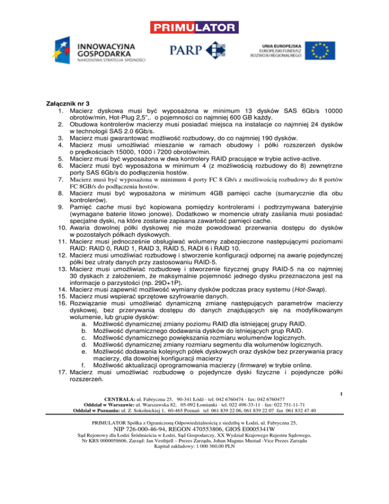 Załącznik nr 3 1. Macierz dyskowa musi być wyposażona w minimum 13 dysków SAS 6Gb/s 10000 obrotów/min, Hot-Plug 2,5”,. o pojemności co najmniej 600 GB każdy. 2. Obudowa kontrolerów macierzy musi posiadać miejsca na instalacje co najmniej 24 dysków w technologii SAS 2.0 6Gb/s. 3. Macierz musi gwarantować możliwość rozbudowy, do co najmniej 190 dysków. 4. Macierz musi umożliwiać mieszanie w ramach obudowy i półki rozszerzeń dysków o prędkościach 15000, 1000 i 7200 obrotów/min. 5. Macierz musi być wyposażona w dwa kontrolery RAID pracujące w trybie active-active. 6. Macierz musi być wyposażona w minimum 4 (z możliwością rozbudowy do 8) zewnętrzne porty SAS 6Gb/s do podłączenia hostów. 7. Macierz musi być wyposażona w minimum 4 porty FC 8 Gb/s z możliwością rozbudowy do 8 portów FC 8GB/s do podłączenia hostów. 8. Macierz musi być wyposażona w minimum 4GB pamięci cache (sumarycznie dla obu kontrolerów). 9. Pamięć cache musi być kopiowana pomiędzy kontrolerami i podtrzymywana bateryjnie (wymagane baterie litowo jonowe). Dodatkowo w momencie utraty zasilania musi posiadać specjalne dyski, na które zostanie zapisana zawartość pamięci cache. 10. Awaria dowolnej półki dyskowej nie może powodować przerwania dostępu do dysków w pozostałych półkach dyskowych. 11. Macierz musi jednocześnie obsługiwać wolumeny zabezpieczone następującymi poziomami RAID: RAID 0, RAID 1, RAID 3, RAID 5, RADI 6 i RAID 10. 12. Macierz musi umożliwiać rozbudowę i stworzenie konfiguracji odpornej na awarię pojedynczej półki bez utraty danych przy zastosowaniu RAID-5. 13. Macierz musi umożliwiać rozbudowę i stworzenie fizycznej grupy RAID-5 na co najmniej 30 dyskach z założeniem, że maksymalnie pojemność jednego dysku przeznaczona jest na informacje o parzystości (np. 29D+1P). 14. Macierz musi zapewnić możliwość wymiany dysków podczas pracy systemu (Hot-Swap). 15. Macierz musi wspierać sprzętowe szyfrowanie danych. 16. Rozwiązanie musi umożliwiać dynamiczną zmianę następujących parametrów macierzy dyskowej, bez przerywania dostępu do danych znajdujących się na modyfikowanym wolumenie, lub grupie dysków: a. Możliwość dynamicznej zmiany poziomu RAID dla istniejącej grupy RAID. b. Możliwość dynamicznego dodawania dysków do istniejących grup RAID. c. Możliwość dynamicznego powiększania rozmiaru wolumenów logicznych. d. Możliwość dynamicznej zmiany rozmiaru segmentu dla wolumenów logicznych. e. Możliwość dodawania kolejnych półek dyskowych oraz dysków bez przerywania pracy macierzy, dla dowolnej konfiguracji macierzy f. Możliwość aktualizacji oprogramowania macierzy (firmware) w trybie online. 17. Macierz musi umożliwiać rozbudowę o pojedyncze dyski fizyczne i pojedyncze półki rozszerzeń. 1 CENTRALA: ul. Fabryczna 25, 90-341 Łódź · tel. 042 6760474 · fax: 042 6760477 Oddział w Warszawie: ul. Warszawska 82, 05-092 Łomianki · tel. 022 498-33-11 · fax: 022 751-11-71 Oddział w Poznaniu: ul. Z. Sokolnickiej 1, 60-465 Poznań tel 061 839 22 06, 061 839 22 07 fax 061 832 47 40 PRIMULATOR Spółka z Ograniczoną Odpowiedzialnością z siedzibą w Łodzi, ul. Fabryczna 25, NIP 726-000-46-94, REGON 470553806, GIOŚ E0005341W Sąd Rejonowy dla Łodzi Śródmieścia w Łodzi, Sąd Gospodarczy, XX Wydział Krajowego Rejestru Sądowego, Nr KRS 0000058606, Zarząd: Jan Vesthjell – Prezes Zarządu, Johan Magnus Mustad -Vice Prezes Zarządu Kapitał zakładowy: 1 000 360,00 PLN 18. Macierz dyskowa musi umożliwiać dedykowanie dowolnego dysku fizycznego jako globalny dysk typu Hot-Spare. Musi istnieć możliwość definiowania min 5 globalnych dysków typu HotSpare. 19. Macierz musi być wyposażona w funkcjonalność wykonywania natychmiastowej kopii danych (point-in-time copy). Funkcjonalność ta powinna być realizowana w trybie copy-on-write. Licencja na wykonywanie natychmiastowej kopii danych powinna obejmować całą przestrzeń dyskową oferowaną przez macierz. 20. Macierz musi być wyposażona w funkcjonalność wykonywania pełnej kopii lokalnych wolumenów logicznych z wykorzystaniem jedynie kontrolerów macierzy. Licencja na wykonywanie kopii lokalnego wolumenu powinna obejmować całą przestrzeń dyskową oferowaną przez macierz. 21. Macierz musi mieć możliwość rozbudowy o replikację danych do FC z druga macierzą w sposób synchroniczny i asynchroniczny z wykorzystaniem jedynie kontrolerów macierzy. Musi istnieć możliwość dynamicznej zmiany trybu i kierunku replikacji, bez potrzeby ponownej pełnej synchronizacji. 22. Macierz dyskowa musi obsługiwać następujące systemy operacyjne: Microsoft Windows 2003, RedHat, SUSE, VMware, Microsoft Cluster Services, AIX, HP-UX. 23. Dane zapisywane w wewnętrznej pamięci cache jednego z kontrolerów muszą być także powielane w pamięci cache pozostałych kontrolerów, tak aby w przypadku uszkodzenia dowolnego kontrolera zachowana była spójność danych. 24. Wszystkie krytyczne komponenty macierzy takie jak: kontrolery dyskowe, pamięć cache, zasilacze i wentylatory muszą być zdublowane, tak, aby awaria pojedynczego elementu nie wpływała na funkcjonowanie całego systemu. Komponenty te muszą być wymienialne w trakcie pracy macierzy. 25. Macierz musi mieć możliwość jednoczesnego zasilania z dwóch niezależnych źródeł zasilania. Zanik jednego z nich nie może powodować przerwy w pracy urządzenia ani zmniejszenia jego wydajności lub utraty danych. 26. Macierz musi oferować zarządzanie poprzez sieć LAN oraz port szeregowy. 27. Macierz musi być wyposażona w zestaw do montażu w szafie przemysłowej rack 19”. Obudowa z kontrolerami macierzy oraz półki dyskowe muszą mieć wysokość nie większą niż 2U. 28. Na macierz dyskową Oferent musi udzielić 3 lata gwarancji z co najmniej 4-godzinnym gwarantowanym czasie naprawy z możliwością rozszerzenia do 5 lat. Oprogramowanie do zarządzania musi posiad