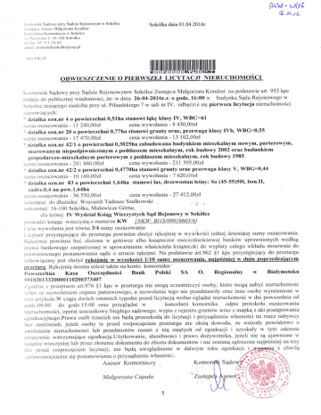p.r#n- u(tt % ,o\,t 6, ]!rllllrlrtlik Sąclowy przy Sądzie Rejonowyrn w Sokółoe Ąsesor Małgorzata Kondrat it;lcclaria Kcllnonltoza w Sokółce Sokółka dnia 01.04'20 1 6r. ,/.lLsLę1lca lr il] iL:L l)tltlzltlwzt 3. l 6- l 0() Sokółka lrLr: E5 7li-24-li3 cnrail ; [email protected] i(nr 9'16r l3 OBWIESZCZENIE O PIERWSZEJ LICYTACJI NIERUCHOMOSCI lrtltntlrnik Sąclowy pyzy Sądzię Rejonowymw Sokółce ZastępcaMałgorzata Kondrat na podstawie art" 953 kpc Rejonowego w ])()Clajc do publicznej wiadomoścl', Że." w dniu 26-04-Ż076r.r. o godz. 10:00 w budynku Sądu nięruchomoścl pierwsza licytacja się odbędzie nr fV, Stlk(lłcc mającego siedzibę przy uL Piłsudskiego 7 w sali stallowiących: działka ozn.nr 4 o powierzchni 0,51ha stanowi łąkę klasy IV' WBG:61 cena W}'wołania - B 430,0Ozł )Lrrrra ()srac(rwania - 11 240,0021 j. działka ozn.nr 20 o powierzchni 0'77ha Stanowi grłrnty orne' przewaga klasy fVb, WBG:0,55 cena wywołania - 13 |0Ż,00zl itlll}il ()SZAcowania - l1 410,00zł j. zabudowana budynkiem mieszkalnym nowym' parterowym' 0,3025ha ciziałka ozl.nr 42l1 o powierzchni nlurowanym niepodpiwniczonym Z poddaszem mieszkalnym' rok budowy 200Ż oraz budunkiem gospodarczo-mieszkalnym parterowym z poddaszem mieszkalnym' rok budowy 1985 cena wyr'vołania - 2lI 395,00zł sLLlna oszacowania - 281 860,00zł stanowi grunty orn€ przewaga klasy V, WBG:0'44 powierzchni0,477}ha '. clziałka ozn.nr 4212 o ',. Sll1na ()Szaoowania - 10 160,00zł cena w}rlvołania - 7 620,00zł clziałka ozn.nr 83 o powierzchni 1,64ha stanowi las, drzewostan leśny: So (45-55)50l, bon.Il, t.adrz.0,4 na pow.1,64ha oena wywołania - 27 4I2,Q0zł 5Llllla ()Szacowania '36 550,00zł llaicząccj do dłuznika: WojciechTadeusz Szalkowski ' ., ,;l , ;ltli'tlzrlncj : i 6-1 00 Sokółka' Malawicze Gónre' cl1a której IV Wydziat Ksiąg Wieczystych Sąd Rejonowy W Sokółce BI]S/0Q0]6603/6J 1lro\vac1zi księgę wieczystąo numerze KW INKW. ('ct'tlt wywołania jest równa 3/4 sumy oszacoWania l 1cytant przystępujący do przetargu powinien złożycrękojmię \Ą' wysokc)Scijednej dziesiątej Sumy oszacowania' lię[t1nria powinna blyć złoŻ'ona w gotówce albo książeczce oszcz\',dnościowej banków uprawnionych według książeczkj do wypłaty całego wkładu stosownie do i]fawŹl bankowego zaopatrzonej w upowaznienie właściciela podstawie drt.962 $1 kpc przystępujący do przetargu ])rawomocnego postanowienia sądu o utracie rękojmi. Na ztlbtlwiązany 1est złoŻy6 rekoimię w wvsokości 1/10 -sumY oszacowania. naipÓŹniei w dniu DoDrzedzalacYm ']. przctarg. Rękojmię mozna uiśció także na konto komornika: ' o. l)owszcchna Kasa oszczędności Bank Polski SA Regionalny w Białymstoku se 1 020133200001 10200373407 li]tl(1llic z przcpiscm ar1'.976 $1 kpc w przetargu nie mogą uczestniczyć osoby, które mogąnabyć nieruchomość państwowego, azezwo\enia tego nie przedstawiły oraz inne osoby wymienione w ,']lku ,o zezwoleniem organu tl''ll artyku1e.W ciągu c1wóch ostatnich tygodni przedlic5Ąacjąwolno oglądać nieruchomośó w dni powszednie od kancelarii komornika odpis protokołu oszacowania gtx]z.gś:00 do godz.15:00 oraz przeglądać w ,ricriLchomości' operat szacunkowy biegłego sądowego, wypis z rejestru gruntów wTa7, z mapką z akt postępowania cg,zcklrcyjnego.Prawa osób trzecich nie będą przeszkodą do licytacji l przysądzenia własnościna rzęcz naby'wcy b'rr' 1o"tir"ieit, 1eŻell' osoby te przed rozpoczęciem przetargu nte złoŻą dowodu, że wniosĘ powództwo o zr'volnicnie niętuchomości lub przedmiotów tazem z nią zajętych od egzekucji i uzyskały w tym zakresie tlrzcczcnic wstrzymujące egzekucję.Uzy.tkowanie, słuzebnościi prawa dożywotnii<a, jeŻeli nie są ujawnione w iisręcizc wieczystej \ub przez złożenlę dokumentu do zbioru dokumentów i nie zostaną zgłc,szone najpózniej natrzy i rll#eesłra z chwilą _"'-_J"- toku '-- -' egzekucii tinl przcd .ozpoczęcicm licytacji, nie będą uwzględnione w dalszym ;^_;. oiA nrr<'ląnrrrrzicniq n nrzrucnr]zenill własności{yłrYonl'';\t i ) ra W () 1nocnleni a się postanowięnia o przy sądzeniu własnośc Komo Komorniczy Asesor " i ! " ] l Mctłgorzata Capała ? <! I i.fn "l .ał',J',$" }: h "--*-ą1 (':"' t..lo:.:oKo' ''1- -.', : Małgorzata I{ondrat