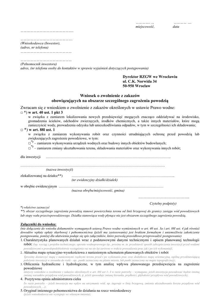 ………….. .., miejscowość, ………… …. data ………………………………………….. …………………………………………. (Wnioskodawca (Inwestor), (adres, nr telefonu) ………………………………………… ………………………………………… (Pełnomocnik inwestora) adres, (nr telefonu osoby do kontaktów w sprawie wyjaśnień dotyczących postępowania) Dyrektor RZGW we Wrocławiu ul. C.K. Norwida 34 50-950 Wrocław Wniosek o zwolnienie z zakazów obowiązujących na obszarze szczególnego zagrożenia powodzią Zwracam się z wnioskiem o zwolnienie z zakazów określonych w ustawie Prawo wodne: □ *) w art. 40 ust. 1 pkt 3 w związku z zamiarem lokalizowania nowych przedsięwzięć mogących znacząco oddziaływać na środowisko, gromadzenia ścieków, odchodów zwierzęcych, środków chemicznych, a także innych materiałów, które mogą zanieczyścić wody, prowadzenia odzysku lub unieszkodliwiania odpadów, w tym w szczególności ich składowania; □ *) w art. 88l ust. 1 w związku z zamiarem wykonywania robót oraz czynności utrudniających ochronę przed powodzią lub zwiększających zagrożenie powodziowe, w tym: □*) – zamiarem wykonywania urządzeń wodnych oraz budowy innych obiektów budowlanych; □*) – zamiarem zmiany ukształtowania terenu, składowania materiałów oraz wykonywania innych robót; dla inwestycji ………………………………………………………………………………………….. ………………………………………………………………………………………………………… (nazwa inwestycji) zlokalizowanej na działce**) ………………………………………………………………………….. (nr ewidencyjny działki/działek) w obrębie ewidencyjnym …………………………………………………………………………… (nazwa obrębu/miejscowość, gmina) .……………………………….. Czytelny podpis(y) *) właściwe zaznaczyć **) obszar szczególnego zagrożenia powodzią stanowi powierzchnia terenu od linii brzegowej do granicy zasięgu wód powodziowych lub stopy wału przeciwpowodziowego. Działka stanowiąca wody płynące nie jest obszarem szczególnego zagrożenia powodzią. Załączniki do wniosku: (nie dołączenie do wniosku dokumentów wymaganych ustawą Prawo wodne wymienionych w art. 40 ust. 3a i art. 88l ust. 4 jak również dowodów wpłaty opłaty skarbowej i pełnomocnictwa (jeżeli ma zastosowanie) jest brakiem formalnym i uniemożliwia zakończenie postępowania, poniżej dla ułatwienia podaje się spis załączników, które pozwolą prawidłowo przeprowadzić postępowanie) 1. Charakterystyka planowanych działań wraz z podstawowymi danymi technicznymi i opisem planowanej technologii robót: (np. wyciąg z projektu technicznego, operatu wodnoprawnego itp., prosimy m. in. przedstawić sposób zabezpieczenia inwestycji przed wodami powodziowymi o prawdopodobieństwie wystąpienia raz na sto lat zarówno w trakcie prowadzenia prac jak i po ich wykonaniu); 2. Aktualna mapa sytuacyjno-wysokościowa z naniesionym schematem planowanych obiektów i robót (prosimy dostarczyć mapę z naniesionymi rzędnymi terenu przed i po wykonaniu prac oraz dodatkowo mapę orientacyjną, ogólną przedstawiającą położenie inwestycji w stosunku do rzeki – np.. punkt zaznaczony na planie miasta, lub punkt zaznaczony na mapie topograficznej); 3. Obliczenia hydrauliczne i hydrologiczne, w tym analizę wpływu planowanego przedsięwzięcia na zagrożenie powodziowe (dotyczy wniosków o zwolnienie z zakazów określonych w art. 88l ust 1- 3 w razie potrzeby – wymagane, jeżeli inwestycja powodować będzie istotną zmianę warunków przepływu wód powodziowych, tj. jeżeli spowoduje zmianę kierunku, prędkości, głębokości przepływu wód powodziowych); 4. Pozytywna opinia administratora cieku (w razie potrzeby – jeżeli inwestycja ma wpływ na utrzymanie wód, np. ingeruje w linię brzegową, zmienia ukształtowanie koryta przepływu wód powodziowych, ...); 5. Oryginał imiennego pełnomocnictwa do działania na rzecz wnioskodawcy (jeżeli wnioskodawca nie występuje we własnym imieniu); 6. Oryginały dowodów wpłaty opłaty skarbowej (z podaniem tytułu przelewu) dokonanej na konto nr 82 1020 5226 0000 6102 0417 7895 Urzędu Miasta Wrocławia zgodnie z Ustawą o opłacie skarbowej z dnia 16 listopada 2006 r. (Dz. U. z 2012 r. poz. 1282 z późn. zm.) w wysokości: a) 10 zł od dokonania czynności urzędowej polegającej na rozpatrzeniu wniosku o wydanie decyzji zwalniającej, b) 17 zł za złożenie pełnomocnictwa (jeżeli ma zastosowanie). (Dowód uiszczenia opłaty skarbowej może mieć formę wydruku potwierdzającego dokonanie operacji bankowej przez Internet) Do rozpatrzenia sprawy przydatne są również: wypis i wyrys z aktualnie obowiązującego miejscowego planu zagospodarowania przestrzennego (mpzp) lub informacja o jego braku; wypisy z rejestru gruntów dla działek objętych inwestycją; rysunki i profile (dla obiektów liniowych) pomocne przy ocenie wpływu przedsięwzięcia na ochronę przeciwpowodziową; decyzja o środowiskowych uwarunkowaniach zgody na realizację przedsięwzięcia, Karta Informacyjna Przedsięwzięcia (pomocna dla zwolnień z art. 40 ust 3 z lokalizowania nowych przedsięwzięć mogących znacząco oddziaływać na środowisko zgodnie z Rozporządzeniem Rady Ministrów w sprawie przedsięwzięć mogących znacząco oddziaływać na środowisko z dnia 9 listopada 2010 r. Dz. U nr 21, poz. 197 z późn. zm.)