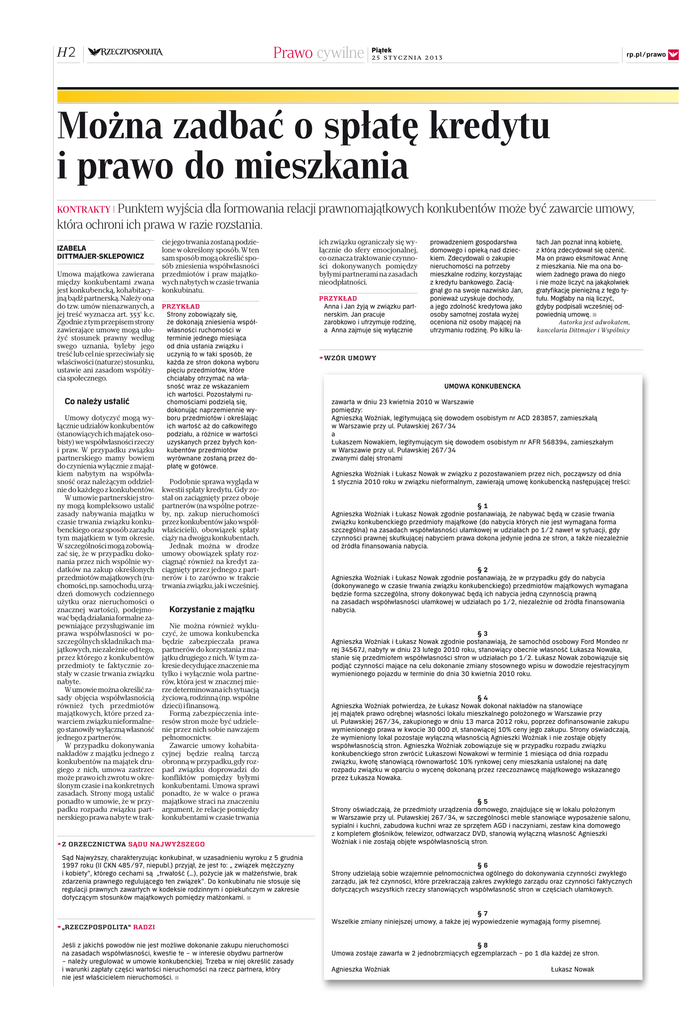 Prawo cywilne H2 Piątek rp.pl/prawo ◊ 25 stycznia 2013 Można zadbać o spłatę kredytu i prawo do mieszkania KONTRAKTY | Punktem wyjścia dla formowania relacji prawnomajątkowych konkubentów może być zawarcie umowy, która ochroni ich prawa w razie rozstania. IZABELA DITTMAJER-SKLEPOWICZ Umowa majątkowa zawierana między konkubentami zwana jest konkubencką, kohabitacyjną bądź partnerską. Należy ona do tzw. umów nienazwanych, a jej treść wyznacza art. 3531 k.c. Zgodnie z tym przepisem strony zawierające umowę mogą ułożyć stosunek prawny według swego uznania, byleby jego treść lub cel nie sprzeciwiały się właściwości (naturze) stosunku, ustawie ani zasadom współżycia społecznego. Co należy ustalić Umowy dotyczyć mogą wyłącznie udziałów konkubentów (stanowiących ich majątek osobisty) we współwłasności rzeczy i praw. W przypadku związku partnerskiego mamy bowiem do czynienia wyłącznie z majątkiem nabytym na współwłasność oraz należącym oddzielnie do każdego z konkubentów. W umowie partnerskiej strony mogą kompleksowo ustalić zasady nabywania majątku w czasie trwania związku konkubenckiego oraz sposób zarządu tym majątkiem w tym okresie. W szczególności mogą zobowiązać się, że w przypadku dokonania przez nich wspólnie wydatków na zakup określonych przedmiotów majątkowych (ruchomości, np. samochodu, urządzeń domowych codziennego użytku oraz nieruchomości o znacznej wartości), podejmować będą działania formalne zapewniające przysługiwanie im prawa współwłasności w poszczególnych składnikach majątkowych, niezależnie od tego, przez którego z konkubentów przedmioty te faktycznie zostały w czasie trwania związku nabyte. W umowie można określić zasady objęcia współwłasnością również tych przedmiotów majątkowych, które przed zawarciem związku nieformalnego stanowiły wyłączną własność jednego z partnerów. W przypadku dokonywania nakładów z majątku jednego z konkubentów na majątek drugiego z nich, umowa zastrzec może prawo ich zwrotu w określonym czasie i na konkretnych zasadach. Strony mogą ustalić ponadto w umowie, że w przypadku rozpadu związku partnerskiego prawa nabyte w trak- cie jego trwania zostaną podzielone w określony sposób. W ten sam sposób mogą określić sposób zniesienia współwłasności przedmiotów i praw majątkowych nabytych w czasie trwania konkubinatu. ich związku ograniczały się wyłącznie do sfery emocjonalnej, co oznacza traktowanie czynności dokonywanych pomiędzy byłymi partnerami na zasadach nieodpłatności. PRZYKŁAD PRZYKŁAD Strony zobowiązały się, że dokonają zniesienia współwłasności ruchomości w terminie jednego miesiąca od dnia ustania związku i uczynią to w taki sposób, że każda ze stron dokona wyboru pięciu przedmiotów, które chciałaby otrzymać na własność wraz ze wskazaniem ich wartości. Pozostałymi ruchomościami podzielą się, dokonując naprzemiennie wyboru przedmiotów i określając ich wartość aż do całkowitego podziału, a różnice w wartości uzyskanych przez byłych konkubentów przedmiotów wyrównane zostaną przez dopłatę w gotówce. Podobnie sprawa wygląda w kwestii spłaty kredytu. Gdy został on zaciągnięty przez oboje partnerów (na wspólne potrzeby, np. zakup nieruchomości przez konkubentów jako współwłaścicieli), obowiązek spłaty ciąży na dwojgu konkubentach. Jednak można w drodze umowy obowiązek spłaty rozciągnąć również na kredyt zaciągnięty przez jednego z partnerów i to zarówno w trakcie trwania związku, jak i wcześniej. Korzystanie z majątku Nie można również wykluczyć, że umowa konkubencka będzie zabezpieczała prawa partnerów do korzystania z majątku drugiego z nich. W tym zakresie decydujące znaczenie ma tylko i wyłącznie wola partnerów, która jest w znacznej mierze determinowana ich sytuacją życiową, rodzinną (np. wspólne dzieci) i finansową. Formą zabezpieczenia interesów stron może być udzielenie przez nich sobie nawzajem pełnomocnictw. Zawarcie umowy kohabitacyjnej będzie realną tarczą obronną w przypadku, gdy rozpad związku doprowadzi do konfliktów pomiędzy byłymi konkubentami. Umowa sprawi ponadto, że w walce o prawa majątkowe straci na znaczeniu argument, że relacje pomiędzy konkubentami w czasie trwania > Z ORZECZNICTWA SĄDU NAJWYŻSZEGO Sąd Najwyższy, charakteryzując konkubinat, w uzasadnieniu wyroku z 5 grudnia 1997 roku (II CKN 485/97, niepubl.) przyjął, że jest to: „ związek mężczyzny i kobiety”, którego cechami są „trwałość (…), pożycie jak w małżeństwie, brak zdarzenia prawnego regulującego ten związek”. Do konkubinatu nie stosuje się regulacji prawnych zawartych w kodeksie rodzinnym i opiekuńczym w zakresie dotyczącym stosunków majątkowych pomiędzy małżonkami. ∑ > „RZECZPOSPOLITA” RADZI Jeśli z jakichś powodów nie jest możliwe dokonanie zakupu nieruchomości na zasadach współwłasności, kwestie te – w interesie obydwu partnerów – należy uregulować w umowie konkubenckiej. Trzeba w niej określić zasady i warunki zapłaty części wartości nieruchomości na rzecz partnera, który nie jest właścicielem nieruchomości. ∑ Anna i Jan żyją w związku partnerskim. Jan pracuje zarobkowo i utrzymuje rodzinę, a Anna zajmuje się wyłącznie prowadzeniem gospodarstwa domowego i opieką nad dzieckiem. Zdecydowali o zakupie nieruchomości na potrzeby mieszkalne rodziny, korzystając z kredytu bankowego. Zaciągnął go na swoje nazwisko Jan, ponieważ uzyskuje dochody, a jego zdolność kredytowa jako osoby samotnej została wyżej oceniona niż osoby mającej na utrzymaniu rodzinę. Po kilku la- tach Jan poznał inną kobietę, z którą zdecydował się ożenić. Ma on prawo eksmitować Annę z mieszkania. Nie ma ona bowiem żadnego prawa do niego i nie może liczyć na jakąkolwiek gratyfikację pieniężną z tego ty
