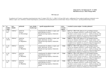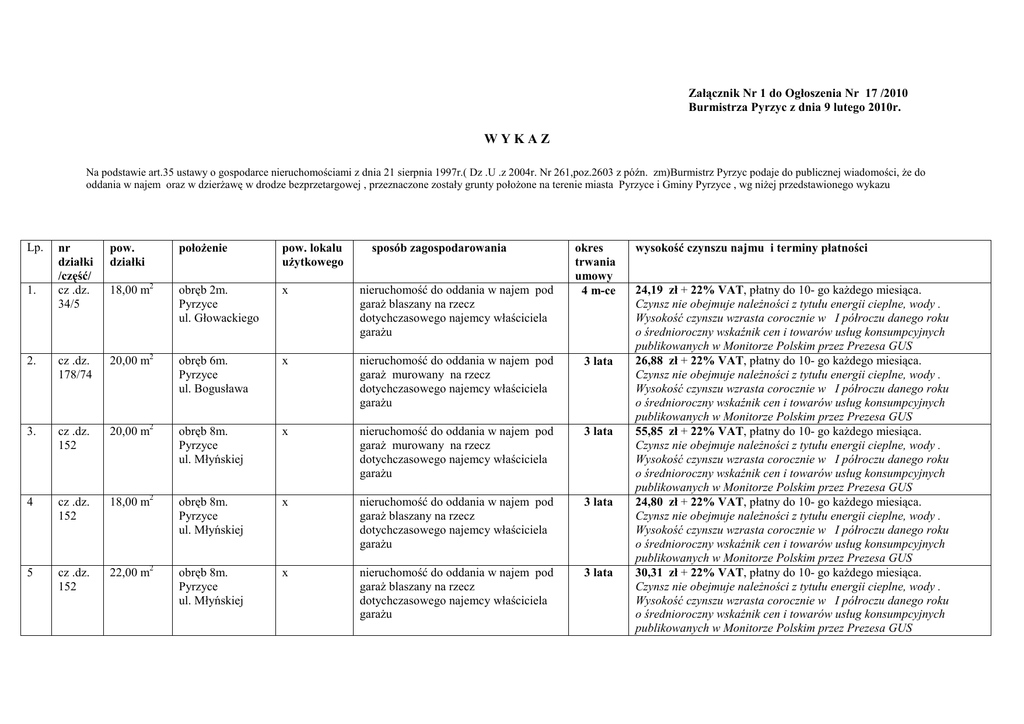 Załącznik Nr 1 do Ogłoszenia Nr 17 /2010 Burmistrza Pyrzyc z dnia 9 lutego 2010r. WYKAZ Na podstawie art.35 ustawy o gospodarce nieruchomościami z dnia 21 sierpnia 1997r.( Dz .U .z 2004r. Nr 261,poz.2603 z późn. zm)Burmistrz Pyrzyc podaje do publicznej wiadomości, Ŝe do oddania w najem oraz w dzierŜawę w drodze bezprzetargowej , przeznaczone zostały grunty połoŜone na terenie miasta Pyrzyce i Gminy Pyrzyce , wg niŜej przedstawionego wykazu Lp. nr działki /część/ cz .dz. 34/5 pow. działki połoŜenie pow. lokalu uŜytkowego 18,00 m2 obręb 2m. Pyrzyce ul. Głowackiego x nieruchomość do oddania w najem pod garaŜ blaszany na rzecz dotychczasowego najemcy właściciela garaŜu 2. cz .dz. 178/74 20,00 m2 obręb 6m. Pyrzyce ul. Bogusława x nieruchomość do oddania w najem pod garaŜ murowany na rzecz dotychczasowego najemcy właściciela garaŜu 3 lata 3. cz .dz. 152 20,00 m2 obręb 8m. Pyrzyce ul. Młyńskiej x nieruchomość do oddania w najem pod garaŜ murowany na rzecz dotychczasowego najemcy właściciela garaŜu 3 lata 4 cz .dz. 152 18,00 m2 obręb 8m. Pyrzyce ul. Młyńskiej x nieruchomość do oddania w najem pod garaŜ blaszany na rzecz dotychczasowego najemcy właściciela garaŜu 3 lata 5 cz .dz. 152 22,00 m2 obręb 8m. Pyrzyce ul. Młyńskiej x nieruchomość do oddania w najem pod garaŜ blaszany na rzecz dotychczasowego najemcy właściciela garaŜu 3 lata 1. sposób zagospodarowania okres trwania umowy 4 m-ce wysokość czynszu najmu i terminy płatności 24,19 zł + 22% VAT, płatny do 10- go kaŜdego miesiąca. Czynsz nie obejmuje naleŜności z tytułu energii cieplne, wody . Wysokość czynszu wzrasta corocznie w I półroczu danego roku o średnioroczny wskaźnik cen i towarów usług konsumpcyjnych publikowanych w Monitorze Polskim przez Prezesa GUS 26,88 zł + 22% VAT, płatny do 10- go kaŜdego miesiąca. Czynsz nie obejmuje naleŜności z tytułu energii cieplne, wody . Wysokość czynszu wzrasta corocznie w I półroczu danego roku o średnioroczny wskaźnik cen i towarów usług konsumpcyjnych publikowanych w Monitorze Polskim przez Prezesa GUS 55,85 zł + 22% VAT, płatny do 10- go kaŜdego miesiąca. Czynsz nie obejmuje naleŜności z tytułu energii cieplne, wody . Wysokość czynszu wzrasta corocznie w I półroczu danego roku o średnioroczny wskaźnik cen i towarów usług konsumpcyjnych publikowanych w Monitorze Polskim przez Prezesa GUS 24,80 zł + 22% VAT, płatny do 10- go kaŜdego miesiąca. Czynsz nie obejmuje naleŜności z tytułu energii cieplne, wody . Wysokość czynszu wzrasta corocznie w I półroczu danego roku o średnioroczny wskaźnik cen i towarów usług konsumpcyjnych publikowanych w Monitorze Polskim przez Prezesa GUS 30,31 zł + 22% VAT, płatny do 10- go kaŜdego miesiąca. Czynsz nie obejmuje naleŜności z tytułu energii cieplne, wody . Wysokość czynszu wzrasta corocznie w I półroczu danego roku o średnioroczny wskaźnik cen i towarów usług konsumpcyjnych publikowanych w Monitorze Polskim przez Prezesa GUS 6 cz .dz. 152 21,00 m2 obręb 8m. Pyrzyce ul. Młyńskiej x nieruchomość do oddania w najem pod garaŜ blaszany na rzecz dotychczasowego najemcy właściciela garaŜu 7 cz .dz. 335 9,00 m2 obręb 9m. Pyrzyce ul. Stargardzkiej x nieruchomość do oddania w najem pod pawilon handlowy na rzecz dotychczasowego najemcy właściciela pawilonu 8 cz .dz. 335 22,00 m2 obręb 9m. Pyrzyce ul. Jana Pawła II x nieruchomość do oddania w najem pod garaŜ blaszany na rzecz dotychczasowego najemcy właściciela garaŜu 3 lata 9 cz .dz. 335 21,00 m2 obręb 9m. Pyrzyce ul. Jana Pawła II x nieruchomość do oddania w najem pod garaŜ blaszany na rzecz dotychczasowego najemcy właściciela garaŜu 3 lata 10 cz .dz. 324/14 17,00 m2 obręb 9m. Pyrzyce ul. Stargardzkiej x nieruchomość do oddania w najem pod garaŜ murowany na rzecz dotychczasowego najemcy właściciela garaŜu 3 lat 11 cz. dz. 334/3 18,00m2 obręb 9m. Pyrzyce ul. Stargardzkiej x nieruchomość do oddania w najem pod garaŜ blaszany na rzecz dotychczasowego najemcy właściciela garaŜu 3 lat 12 cz .dz. 73 600 m2 obręb 9 m. Pyrzyce ul. Ogrodowa x nieruchomość do oddania w dzierŜawę na uprawy ogrodnicze, na rzecz dotychczasowego dzierŜawcy 3 lat 3 lata 28,94 zł + 22% VAT, płatny do 10- go kaŜdego miesiąca. Czynsz nie obejmuje naleŜności z tytułu energii cieplne, wody . Wysokość czynszu wzrasta corocznie w I półroczu danego roku o średnioroczny wskaźnik cen i towarów usług konsumpcyjnych publikowanych w Monitorze Polskim przez Prezesa GUS 53,17 zł + 22% VAT, płatny do 10- go kaŜdego miesiąca. Czynsz nie obejmuje naleŜności z tytułu energii cieplne, wody . Wysokość czynszu wzrasta corocznie w I półroczu danego roku o średnioroczny wskaźnik cen i towarów usług konsumpcyjnych publikowanych w Monitorze Polskim przez Prezesa GUS 29,57 zł + 22% VAT, płatny do 10- go kaŜdego miesiąca. Czynsz nie obejmuje naleŜności z tytułu energii cieplne, wody . Wysokość czynszu wzrasta corocznie w I półroczu danego roku o średnioroczny wskaźnik cen i towarów usług konsumpcyjnych publikowanych w Monitorze Polskim przez Prezesa GUS 28,94 zł + 22% VAT, płatny do 10- go kaŜdego miesiąca. Czynsz nie obejmuje naleŜności z tytułu energii cieplne, wody . Wysokość czynszu wzrasta corocznie w I półroczu danego roku o średnioroczny wskaźnik cen i towarów usług konsumpcyjnych publikowanych w Monitorze Polskim przez Prezesa GUS 22,85 zł +22%VAT, płatny do 10 kaŜdego miesiąca Czynsz nie obejmuje naleŜności z tytułu energii cieplne, wody . Wysokość czynszu wzrasta corocznie w I półroczu danego roku o średnioroczny wskaźnik cen i towarów usług konsumpcyjnych publikowanych w Monitorze Polskim przez Prezesa GUS 24,20 zł + 22% VAT, płatny do 10- go kaŜdego miesiąca. Czynsz nie obejmuje naleŜności z tytułu energii cieplne, wody . Wysokość czynszu wzrasta corocznie w I półroczu danego roku o średnioroczny