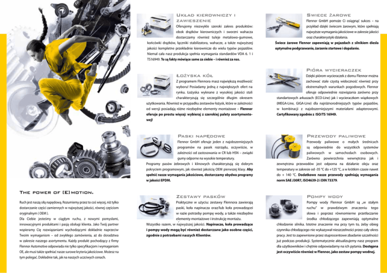 Układ kierowniczy i zawieszenie Oferujemy niezwykle szeroki zakres produktów: obok drążków kierowniczych i sworzni wahacza dostarczamy również tuleje metalowo-gumowe, końcówki drążków, łączniki stabilizatora, wahacze, a także najwyższej jakości kompletne przekładnie kierownicze do wielu typów pojazdów. Niemal cała nasz produkcja spełnia wymagania standardów VDA 6. 1 i TS16949. To są fakty mówiące same za siebie – i również za nas. Łożyska kół Z programem Flennora masz największą możliwość wyboru! Posiadamy jedną z największych ofert na rynku. Łożyska wyknane z wysokiej jakości stali charakteryzują się szczególnie długim okresem użytkowania. Również w przypadku zestawów łożysk, które w zależności od wersji posiadają różne niezbędne elementy montażowe – Flennor oferuje po prostu więcej: wybieraj z szerokiej palety asortymentowej! Paski napĘdowe Flennor GmbH oferuje jeden z najobszerniejszych programów na pasek rozrządu, oczywiście, w zależności od zastosowania w CR lub HSN – związki gumy odporne na wysokie temperatury. Programy pasów żebrowych i klinowych charakteryzują się dobrym pokryciem programowym, jak również jakością OEM pierwszej klasy. Aby spełnić nasze wymagania jakościowe, dostarczamy obydwa programy w jakości EPDM. The power of [E] motion. Ruch jest naszą siłą napędową. Rozumiemy przez to coś więcej, niż tylko dostarczanie części zamiennych w najwyższej jakości, równej częściom oryginalnym ( OEM ). Dla Ciebie jesteśmy w ciągłym ruchu, z nowymi pomysłami, innowacyjnymi produktami i pasją obsługi klienta. Jako Twój partner wspieramy Cię rozwiązaniami wychodzącymi dokładnie naprzeciw Twoim wymaganiom – od zwykłego zamówienia, aż do doradztwa w zakresie naszego asortymentu. Każdy produkt pochodzący z firmy Flennor Automotive odpowiada nie tylko specyfikacjom i wymaganiom OE, ale musi także spełniać nasze surowe kryteria jakościowe. Możesz na tym polegać. Dokładnie tak, jak na naszych uczciwych cenach. Zestawy pasków Praktyczne w użyciu: zestawy Flennora zawierają paski, koła napinacza oraz/lub koła prowadzącei w razie potrzeby pompę wody, a także niezbędne elementy montażowe i instrukcję montażu. Wszystko razem, w najwyższej jakości. Napinacze, koła prowadzące i pompy wody mogą być również dostarczane jako osobne części, zgodnie z potrzebami naszych Klientów. Swiece żarowe Flennor GmbH pomoże Ci osiągnąć sukces – na przykład dzięki świecom żarowym, które spełniają najwyższe wymagania jakościowe w zakresie jakości oraz charakterystyki działania. Świece żarowe Flennor zapewniają w pojazdach z silnikiem diesla optymalne podgrzewanie, żarzenie startowe i dopalanie. Pióra wycieraczek Dzięki piórom wycieraczek z domu Flennor można zachować stale czystą widoczność również przy ekstremalnych warunkach pogodowych. Flennor oferuje odpowiednie rozwiązania zarówno przy standartowych arkuszach (ECO-Line) jak i wycieraczkom wiązkowych (MEGA-Line, GIGA-Line) dla najróżnorodniejszych typów pojazdów, w kombinacji z najobszerniejszymi materiałami adapterowymi. Certyfikowany zgodnie z ISO/TS 16949. Przewody paliwowe Przewody paliwowe o małych średnicach są odpowiednie do wszystkich systemów paliwowych w samochodach osobowych. Zarówno powierzchnia wewnętrzna jak i zewnętrzna przewodów jest odporna na działanie oleju oraz temperatury w zakresie od -35 °C do +125 °C, a w krótkim czasie nawet do + 140 °C. Dodatkowo nasze przewody spełniają wymagania norm SAE J30R7, ISO4639-2 i DIN 73379. Pompy wody Pompy wody Flennor GmbH są „w stałym ruchu” w prawdziwym znaczeniu tego słowa i poprzez równomierne przetłaczanie środka chłodzącego zapewniają optymalne chłodzenie silnika. Istotne znaczenie ma przy tym to, żeby obieg czynnika chłodzącego nie wykazywał nieszczelności przez cały okres pracy. Jest to zapewnione przez stuprocentowe zbadanie szczelności już podczas produkcji. Systematycznie aktualizujemy nasz program dla użytkowników i chętnie odpowiadamy na ich pytania. Dostępna jest oczywiście również w Flennor, jako zestaw pompy wodnej. Flennor GmbH Spójrz na to globalnie! Flennor GmbH koncentruje się na kompleksowym dostarczaniu części zamiennych na cały świat, do wszystkich modeli samochodów. Szeroka paleta naszych produktów obejmuje paski rozrządu, zestawy rozrządu, koła napinające i prowadzące, pompy wody, paski klinowe i wielorowkowe, części zawieszenia i układu kierowniczego, zestawy łożysk kół, świece żarowe, pióra wycieraczek a także przewody paliwowe. Schwarzer Weg 100 –107 D-40593 Düsseldorf Tel. +49 (0) 211–70 07–04 Fax +49 (0) 211–70 07–396 [email protected] www.flennor.de www.flennor-automotive.com Zarządzanie jakością na dwóch poziomach pozwoliło naszej firmie odnieść sukces: szczególną uwagę kierujemy nie tylko na nasze produkty, ale również na doskonałą obsługę klientów. Partnerskie stosunki łączą nas zarówno z lokalnymi dystrybutorami, jak i z zagranicznymi przedstawicielami w wielu krajach. Dodać do tego należy nasze ukierunkowane doradztwo i konsultacje z partnerami oraz wsparcie udzielane przez kompetentny zespół pracowników obsługi. Również jakość produkcji oceniana jest według najwyższych kryteriów. Nasze produkty odpowiadają wymaganiom certyfikatuDIN EN ISO 9001 i są w jakości OEM. Trzymaj nas za słowo. Wspieramy Cię poprzez najwyższej klasy obsługę, na której możesz zawsze polegać. Dzięki wydajnemu zarządzaniu oraz sprawnemu systemowi logistycznemu możemy zagwarantować najlepszą dostępność wszystkich produktów oraz usług. Nasi doradcy o każdej porze są dostępni przez telefon lub internet, aby zadbać o Twoje indywidualne potrzeby. Chętnie przygotujemy Twój indywidualny pakiet potrzebnych informacji lub zaaranżujemy bezpośrednie s potkanie z naszym doradcą. www.f