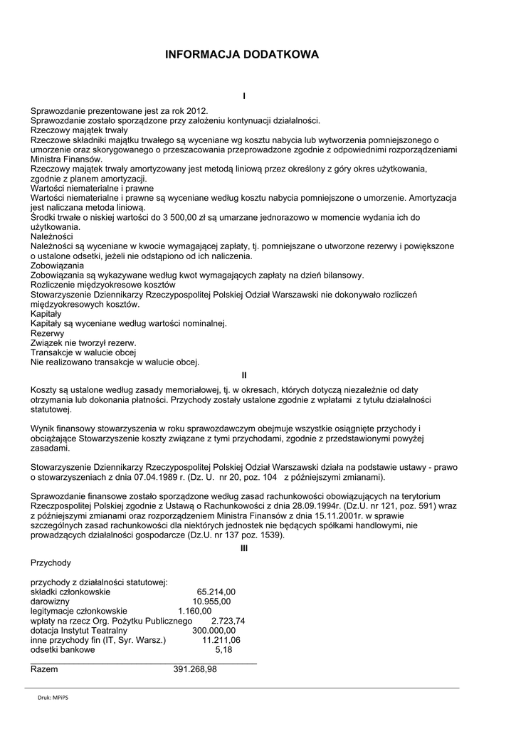 INFORMACJA DODATKOWA I Sprawozdanie prezentowane jest za rok 2012. 6SUDZR]GDQLH]RVWDáRVSRU]ąG]RQHSU]\]DáRĪHQLXNRQW\QXDFMLG]LDáDOQRĞFL 5]HF]RZ\PDMąWHNWUZDá\ 5]HF]RZHVNáDGQLNLPDMąWNXWUZDáHJRVąZ\FHQLDQHZJNRV]WXQDE\FLDOXEZ\WZRU]HQLDSRPQLHMV]RQHJRR XPRU]HQLHRUD]VNRU\JRZDQHJRRSU]HV]DFRZDQLDSU]HSURZDG]RQH]JRGQLH]RGSRZLHGQLPLUR]SRU]ąG]HQLDPL Ministra Finansów. 5]HF]RZ\PDMąWHNWUZDá\DPRUW\]RZDQ\MHVWPHWRGąOLQLRZąSU]H]RNUHĞORQ\]JyU\RNUHVXĪ\WNRZDQLD zgodnie z planem amortyzacji. :DUWRĞFLQLHPDWHULDOQHLSUDZQH :DUWRĞFLQLHPDWHULDOQHLSUDZQHVąZ\FHQLDQHZHGáXJNRV]WXQDE\FLDSRPQLHMV]RQHRXPRU]HQLH$PRUW\]DFMD MHVWQDOLF]DQDPHWRGDOLQLRZą ĝURGNLWUZDáHRQLVNLHMZDUWRĞFLGR3 500,00]áVąXPDU]DQHMHGQRUD]RZRZPRPHQFLHZ\GDQLDLFKGR XĪ\WNRZDQLD 1DOHĪQRĞFL 1DOHĪQRĞFLVąZ\FHQLDQHZNZRFLHZ\PDJDMąFHM]DSáDW\WMSRPQLHMV]DQHRXWZRU]RQHUH]HUZ\LSRZLĊNV]RQH RXVWDORQHRGVHWNLMHĪHOLQLHRGVWąSLRQRRGLFKQDOLF]HQLD =RERZLą]DQLD =RERZLą]DQLDVąZ\ND]\ZDQHZHGáXJNZRWZ\PDJDMąF\FK]DSáDW\QDG]LHĔELODQVRZ\ 5R]OLF]HQLHPLĊG]\RNUHVRZHNRV]WyZ 6WRZDU]\V]HQLH']LHQQLNDU]\5]HF]\SRVSROLWHM3ROVNLHM2G]LDá:DUV]DZVNLQLHGRNRQ\ZDáRUR]OLF]HĔ PLĊG]\RNUHVRZ\FKNRV]WyZ .DSLWDá\ .DSLWDá\VąZ\FHQLDQHZHGáXJZDUWRĞFLQRPLQDOQHM Rezerwy =ZLą]HNQLHWZRU]\áUH]HUZ Transakcje w walucie obcej Nie realizowano transakcje w walucie obcej. II .RV]W\VąXVWDORQHZHGáXJ]DVDG\PHPRULDáRZHMWMZRNUHVDFKNWyU\FKGRW\F]ąQLH]DOHĪQLHRGGDW\ RWU]\PDQLDOXEGRNRQDQLDSáDWQRĞFL3U]\FKRG\]RVWDá\XVWDORQH]JRGQLH]ZSáDWDPL]W\WXáXG]LDáDOQRĞFL statutowej. :\QLNILQDQVRZ\VWRZDU]\V]HQLDZURNXVSUDZR]GDZF]\PREHMPXMHZV]\VWNLHRVLąJQLĊWHSU]\FKRG\L REFLąĪDMąFH6WRZDU]\V]HQLHNRV]W\]ZLą]DQH]W\PLSU]\FKRGDPL]JRGQLH]SU]HGVWDZLRQ\PLSRZ\ĪHM zasadami. 6WRZDU]\V]HQLH']LHQQLNDU]\5]HF]\SRVSROLWHM3ROVNLHM2G]LDá:DUV]DZVNLG]LDáDQDSRGVWDZLHXVWDZ\SUDZR o stowarzyszeniach z dnia 07.04.1989 r. (Dz. U. nr 20, poz. 104]SyĨQLHMV]\PL]PLDQDPL 6SUDZR]GDQLHILQDQVRZH]RVWDáRVSRU]ąG]RQHZHGáXJ]DVDGUDFKXQNRZRĞFLRERZLą]XMąF\FKQDWHU\WRULXP 5]HF]SRVSROLWHM3ROVNLHM]JRGQLH]8VWDZąR5DFKXQNRZRĞFL]GQLD28.09.1994r. (Dz.U. nr 121, poz. 591) wraz ]SyĨQLHMV]\PL]PLDQDPLRUD]UR]SRU]ąG]HQLHP0LQLVWUD)LQDQVyZ]GQLD15.11.2001r. w sprawie V]F]HJyOQ\FK]DVDGUDFKXQNRZRĞFLGODQLHNWyU\FKMHGQRVWHNQLHEĊGąF\FKVSyáNDPLKDQGORZ\PLQLH SURZDG]ąF\FKG]LDáDOQRĞFLJRVSRGDUF]H']8QU137 poz. 1539). III Przychody SU]\FKRG\]G]LDáDOQRĞFLVWDWXWRZHM VNáDGNLF]áRQNRZVNLH65.214,00 darowizny 10.955,00 OHJLW\PDFMHF]áRQNRZVNLH1.160,00 ZSáDW\QDU]HF]2UJ3RĪ\WNX3XEOLF]QHJR2.723,74 dotacja Instytut Teatralny 300.000,00 inne przychody fin (IT, Syr. Warsz.) 11.211,06 odsetki bankowe 5,18 _______________________________________________ Razem 391.268,98 Druk: MPiPS IV KOSZTY ]XĪ\FLHPDWHULDáyZLHQHUJLL28.539,06 XVáXJLREFH243.718,53 SRGDWNLLRSáDW\820,00 wynagrodzenia osobowe i bezosobowe (w tym:osobowe:28.448,40 bezosobowe:79.134,42) 107.582,82 narzuty na wynagrodzenia osobowe 5.834,26 zapomogi 2.800,00 umorzenia i amortyzacja 0,00 SR]RVWDáHNRV]W\21.204,01 ________________________________________________________ Razem 410.498,68 V )XQGXV]VWDWXWRZ\ZFDáRĞFLSU]H]QDF]RQ\MHVWQDFHOHVWDWXWRZH6WRZDU]\V]HQLD']LHQQLNDU]\ 5]HF]\SRVSROLWHM3ROVNLHM2GG]LDá:DUV]DZVNL VI 6'532:ZRNUHVLHVSUDZR]GDZF]\PQLHRWU]\PDáRLQLHXG]LHODáRJZDUDQFMLSRUĊF]HĔLLQQ\FK]DEH]SLHF]HĔ ]ZLą]DQ\FK]G]LDáDOQRĞFLąVWDWXWRZą VII W roku 20126'532:RVLąJQĊáRVWUDWĊ3RZRGHPMHVW]PQLHMV]RQDOLF]EDVWDWXWRZ\FKF]áRQNyZSáDFąF\FK VNáDGNL6'53FRZSá\ZDQD]PQLHMV]HQLHSU]\FKRyZVWDWXWRZ\FKVWRZDU]\V]HQLD 'UXJąSU]\F]\QąVSDGNXSU]\FKRGyZMHVW]ZLĊNV]RQDOLF]EDF]áRQNyZ6'53SU]HFKRG]ąF\FKQDHPHU\WXUĊL Z]ZLą]NX]W\PSáDFąF\FK]PQLHMV]RQąZ\VRNRĞüVNáDGNL .RV]W\SURZDG]HQLD6'532:QLH]QDF]QLHXOHJá\]ZLĊNV]HQLXZVWRVXQNXGRURNX2011. :áDG]H6'532:VWDOHPRQLWRUXMąV\WXDFMĊILQDQVRZąVWUXNWXUĊNRV]WyZLSU]\FKRGyZDE\G]LDáDOQRĞü VWRZDU]\V]HQLDQLHE\áD]DJURĪRQDLZSHáQLZ\SHáQLDáDFHOHVWDWXWRZH 6SRU]ąG]RQRGQLD Druk: MPiPS