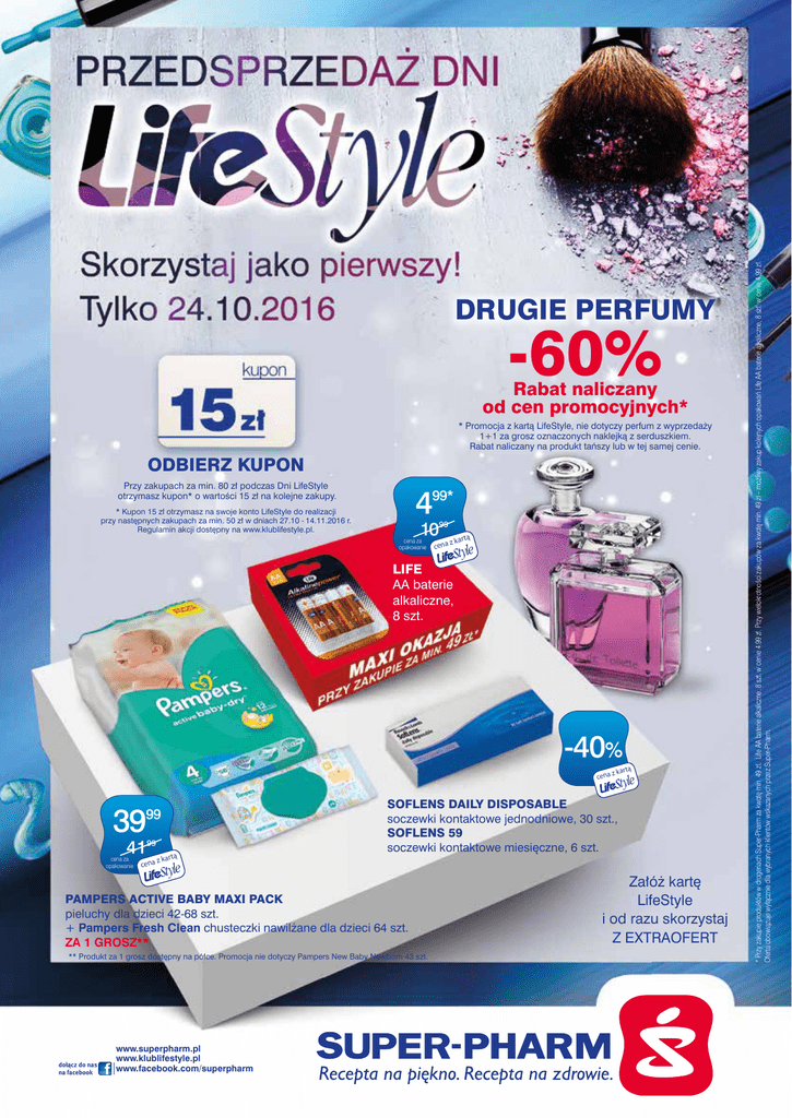 -60% Rabat naliczany od cen promocyjnych* * Promocja z kartą LifeStyle, nie dotyczy perfum z wyprzedaży 1+1 za grosz oznaczonych naklejką z serduszkiem. Rabat naliczany na produkt tańszy lub w tej samej cenie. ODBIERZ KUPON Przy zakupach za min. 80 zł podczas Dni LifeStyle otrzymasz kupon* o wartości 15 zł na kolejne zakupy. 499* * Kupon 15 zł otrzymasz na swoje konto LifeStyle do realizacji przy następnych zakupach za min. 50 zł w dniach 27.10 - 14.11.2016 r. Regulamin akcji dostępny na www.klublifestyle.pl. 1099 cena za opakowanie z cena kartą LIFE AA baterie alkaliczne, 8 szt. -40% z cena 39 99 4199 cena za opakowanie z cena kartą SOFLENS DAILY DISPOSABLE soczewki kontaktowe jednodniowe, 30 szt., SOFLENS 59 soczewki kontaktowe miesięczne, 6 szt. PAMPERS ACTIVE BABY MAXI PACK pieluchy dla dzieci 42-68 szt. + Pampers Fresh Clean chusteczki nawilżane dla dzieci 64 szt. ZA 1 GROSZ** ** Produkt za 1 grosz dostępny na półce. Promocja nie dotyczy Pampers New Baby Newborn 43 szt. dołàcz do nas na facebook www.superpharm.pl www.klublifestyle.pl www.facebook.com/superpharm kartą Załóż kartę LifeStyle i od razu skorzystaj Z EXTRAOFERT * Przy zakupie produktów w drogeriach Super-Pharm za kwotę min. 49 zł, Life AA baterie alkaliczne, 8 szt. w cenie 4.99 zł. Przy wielokrotności zakupów za kwotę min. 49 zł – możliwy zakup kolejnych opakowań Life AA baterie alkaliczne, 8 szt. w cenie 4.99 zł. Oferta obowiązuje wyłącznie dla wybranych klientów wskazanych przez Super-Pharm. DRUGIE PERFUMY OFERTA WAŻNA W PONIEDZIAŁEK 24.10.2016 r. kosmetyki do pielęgnacji twarzy i ciała kosmetyki do makijażu kosmetyki do makijażu kosmetyki do pielęgnacji twarzy i ciała kosmetyki do pielęgnacji ciała i włosów kosmetyki do pielęgnacji twarzy, ciała i włosów* kosmetyki do pielęgnacji twarzy i ciała* kosmetyki do pielęgnacji twarzy i ciała * Nie dotyczy serii AHS i Derma Spa. * Nie dotyczy mini produktów i zestawów. kosmetyki do pielęgnacji i oczyszczania twarzy żele pod prysznic i antyperspiranty dla mężczyzn kosmetyki do pielęgnacji i stylizacji włosów produkty do higieny jamy ustnej* * Nie dotyczy zestawów, miniproduktów szczoteczek bateryjnych oraz pena wybielającego. produkty do golenia i po goleniu* kosmetyki do pielęgnacji włosów * Nie dotyczy wkładów. kosmetyki do pielęgnacji i stylizacji włosów produkty do stylizacji włosów produkty do pielęgnacji stóp wszystkie produkty * Nie dotyczy kremu przeciwgrzybiczego 15 ml. A partner for people. For life. produkty do stylizacji włosów ręczniki kuchenne, papiery toaletowe odświeżacze powietrza, olejki zapachowe, dyfuzery, saszetki i kadzidełka kosmetyki do pielęgnacji twarzy, ciała i włosów, do makijażu oraz suplementy diety* * Nie dotyczy pieluch i dermokosmetyków. ciśnieniomierze, termometry, inhalatory oraz inny sprzęt medyczny produkty do higieny intymnej dla kobiet suplementy diety wspomagające prawidłowe funkcjonowanie organizmu* suplementy diety wspomagające prawidłowe funkcjonowanie organizmu* * Nie dotyczy produktów dla sportowców. orzeszki, bakalie, snacki i batony zbożowe * Nie dotyczy toników. * Promocja -50% na produkty marek pokazanych na tej stronie obowiązuje wyłącznie 24.10.2016 r. (lub do wyczerpania zapasów) w drogeriach i perfumeriach Super-Pharm, nie dotyczy aptek. Promocje nie łączą się i nie dotyczą zestawów. Limit zakupowy produktów promocyjnych, przypadający na jednego klienta (kartę LifeStyle), wynosi po 5 sztuk produktów z każdej promocji przez cały okres trwania akcji promocyjnej. W czasie trwania akcji nie obowiązuje formularz Promocyjnej Ceny Gwarantowanej (PCG). W przypadku wyczerpania zapasów nie ma możliwości nabycia produktów w cenach promocyjnych w późniejszym terminie. Regulamin promocji dostępny na stronie www.klublifestyle.pl. Oferta obowiązuje wyłącznie dla wybranych klientów wskazanych przez Super-Pharm. OFERTA WAŻNA W PONIEDZIAŁEK 24.10.2016 r. kosmetyki do pielęgnacji twarzy, ciała i włosów kosmetyki do makijażu kosmetyki do pielęgnacji i oczyszczania twarzy i ciała* * Nie dotyczy produktów do higieny jamy ustnej oraz mini produktów. kosmetyki do pielęgnacji twarzy i ciała kosmetyki do pielęgnacji twarzy, ciała i włosów* kosmetyki do pielęgnacji twarzy i ciała* * Nie dotyczy serii AHS i Derma Spa. * Nie dotyczy mini produktów i zestawów. kosmetyki do pielęgnacji twarzy i ciała kosmetyki do pielęgnacji i oczyszczania twarzy kosmetyki do pielęgnacji włosów kosmetyki do pielęgnacji i stylizacji włosów produkty do higieny jamy ustnej* * Nie dotyczy zestawów, miniproduktów szczoteczek bateryjnych oraz pena wybielającego. produkty do golenia i po goleniu* kosmetyki do pielęgnacji włosów * Nie dotyczy wkładów. kosmetyki do pielęgnacji i stylizacji włosów produkty do stylizacji włosów produkty do pielęgnacji stóp wszystkie produkty * Nie dotyczy kremu przeciwgrzybiczego 15 ml. A partner for people. For life. produkty do stylizacji włosów ręczniki kuchenne, papiery toaletowe odświeżacze powietrza, olejki zapachowe, dyfuzery, saszetki i kadzidełka kosmetyki do pielęgnacji twarzy, ciała i włosów, do makijażu oraz suplementy diety* * Nie dotyczy pieluch i dermokosmetyków. ciśnieniomierze, termometry, inhalatory oraz inny sprzęt medyczny produkty do higieny intymnej dla kobiet suplementy diety wspomagające prawidłowe funkcjonowanie organizmu* suplementy diety wspomagające prawidłowe funkcjonowanie organizmu* * Nie dotyczy produktów dla sportowców. orzeszki, bakalie, snacki i batony zbożowe * Nie dotyczy toników. * Promocja -50% na produkty marek pokazanych na tej stronie obowiązuje wyłącznie 24.10.2016 r. (lub do wyczerpania zapasów) w drogeriach i perfumeriach Super-Pharm, nie dotyczy aptek. Promocje nie łączą się i nie dotyczą zestawów. Limit zakupowy produktów promocyjnych, przypadający na jednego klienta (kartę LifeStyle), wynosi