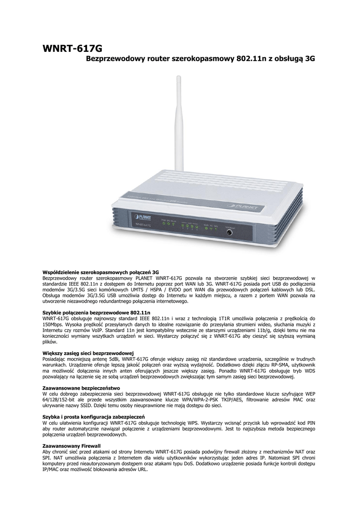 WNRT-617G Bezprzewodowy router szerokopasmowy 802.11n z obsługą 3G Współdzielenie szerokopasmowych połączeń 3G Bezprzewodowy router szerokopasmowy PLANET WNRT-617G pozwala na stworzenie szybkiej sieci bezprzewodowej w standardzie IEEE 802.11n z dostępem do Internetu poprzez port WAN lub 3G. WNRT-617G posiada port USB do podłączenia modemów 3G/3.5G sieci komórkowych UMTS / HSPA / EVDO port WAN dla przewodowych połączeń kablowych lub DSL. Obsługa modemów 3G/3.5G USB umożliwia dostęp do Internetu w każdym miejscu, a razem z portem WAN pozwala na utworzenie niezawodnego redundantnego połączenia internetowego. Szybkie połączenia bezprzewodowe 802.11n WNRT-617G obsługuje najnowszy standard IEEE 802.11n i wraz z technologią 1T1R umożliwia połączenia z prędkością do 150Mbps. Wysoka prędkość przesyłanych danych to idealne rozwiązanie do przesyłania strumieni wideo, słuchania muzyki z Internetu czy rozmów VoIP. Standard 11n jest kompatybilny wstecznie ze starszymi urządzeniami 11b/g, dzięki temu nie ma konieczności wymiany wszytkach urządzeń w sieci. Wystarczy połączyć się z WNRT-617G aby cieszyć się szybszą wymianą plików. Większy zasięg sieci bezprzewodowej Posiadając mocniejszą antenę 5dBi, WNRT-617G oferuje większy zasięg niż standardowe urządzenia, szczególnie w trudnych warunkach. Urządzenie oferuje lepszą jakość połączeń oraz wyższą wydajność. Dodatkowo dzięki złączu RP-SMA, użytkownik ma możliwość dołączenia innych anten oferujących jeszcze większy zasięg. Ponadto WNRT-617G obsługuje tryb WDS pozwalający na łączenie się ze sobą urządzeń bezprzewodowych zwiększając tym samym zasięg sieci bezprzewodowej. Zaawansowane bezpieczeństwo W celu dobrego zabezpieczenia sieci bezprzewodowej WNRT-617G obsługuje nie tylko standardowe klucze szyfrujące WEP 64/128/152-bit ale przede wszystkim zaawansowane klucze WPA/WPA-2-PSK TKIP/AES, filtrowanie adresów MAC oraz ukrywanie nazwy SSID. Dzięki temu osoby nieuprawnione nie mają dostępu do sieci. Szybka i prosta konfiguracja zabezpieczeń W celu ułatwienia konfiguracji WNRT-617G obsługuje technologię WPS. Wystarczy wcisnąć przycisk lub wprowadzić kod PIN aby router automatycznie nawiązał połączenie z urządzeniami bezprzewodowymi. Jest to najszybsza metoda bezpiecznego połączenia urządzeń bezprzewodowych. Zaawansowany Firewall Aby chronić sieć przed atakami od strony Internetu WNRT-617G posiada podwójny firewall złożony z mechanizmów NAT oraz SPI. NAT umożliwia połączenia z Internetem dla wielu użytkowników wykorzystując jeden adres IP. Natomiast SPI chroni komputery przed nieautoryzowanym dostępem oraz atakami typu DoS. Dodatkowo urządzenie posiada funkcje kontroli dostępu IP/MAC oraz możliwość blokowania adresów URL. Zaawansowane funkcje WNRT-617G jako uniwersalny router posiada różne tryby połączeń z dostawcą usług internetowych tak aby mógł być zainstalowany w dowolnym środowisku. Ponadto urządzenie obsługuje funkcje wirtualnego serwera oraz DMZ, które umożliwiają na dostęp użytkownikom zewnętrznym do serwerów sieci LAN. Wbudowany menadżer pasma umożliwia optymalizację ruchu dla aplikacji wymagających dużej przepustowości takich jak VoIP, wideokonferencje czy P2P. Łatwa konfiguracja Dołączony do urządzenia kreator konfiguracji Smart Setup! pozwla na szybką konfigurację urządzenia krok po kroku. Dzięki temu bezprzewodowe środowisko sieciowe w domu lub biurze można zbudować w ciągu kilku minut. Podstawowe cechy Zgodność ze standardami Zgodne z bezprzewodowym standardem IEEE 802.11n o przepustowości do 150Mbps Wsteczna zgodność ze standardami 802.11b/g Cztery porty LAN (10/100Mbps) oraz port WAN (10/100Mbps), obsługa Auto MDI/MDI-X Obsługa połączeń mobilnych 3G / 3.75G Dwa interfejsy: port WAN dla połączeń przewodowych oraz złącze modemu 3G Kompatybilny z sieciami UMTS / HSPA / EVDO Łączność z Internetem i routowanie Typy połączeń: Dynamiczny IP/ Statyczny IP / PPPoE / Telstra Big Pond / L2TP / PPTP Statyczne routowanie, WDS, UPnP, Dynamiczny DNS Zabezpieczenia Obsługa Wi-Fi Protected Setup (WPS) Zaawansowane szyfrowanie: 64/128/152-bit WEP, WPA/WPA2, WPA-PSK/WPA2-PSK z TKIP/AES oraz autoryzacja 802.1x Obsługa firewalla NAT oraz SPI z zabezpieczeniem przed atakami DoS Kontrola dostępu w oparciu o IP/protokoły oraz filtrowanie MAC Zaawansowane funkcje sieciowe Obsługa IPSec, L2TP oraz PPTP VPN pass-through Wirtualny Serwer, ALG, DMZ oraz UPnP Serwer DHCP Łatwa instalacja i zarządzanie Sieciowy interfejs użytkownika ułatwiający konfigurację Zdalne zarządzanie Monitorowanie statusu systemu oraz System Log Zastosowanie Szerokopasmowa zabezpieczona sieć WLAN z mobilnym dostępem do Internetu Po podłączeniu modemu USB 3G, WNRT-617G pozwala na natychmiastowy dostęp do Internetu w każdym miejscu. Port WAN nie tylko zapewnia łączność przewodową poprzez modem kablowy lub DSL ale również gwarantuje alternatywny dostęp w razie awarii łącza. WNRT-617G wyposażono w technologię 802.11n oferującą wyższą przepustowość i zasięg w porównaniu z 802.11g. Co więcej, zaawansowane zabezpieczenia i firewall chronią sieć przed nieautoryzowanym dostępem i atakami z zewnątrz. Dane techniczne Model WNRT-617G Sprzętowe Interfejs WAN: 1 x 10/100Mbps Auto MDI/MDI-X RJ45 LAN: 4 x 10/100Mbps Auto MDI/MDI-X RJ45 USB: 1 x USB 2.0 Antena 1 x złącze RP-SMA 1 x dookólna antena 5dBi SMA Przycisk zasilania Na tylnym panelu Przyciski WPS / Reset Na przednim panelu Diody LED PWR, SYS, WLAN, LAN x 4, WAN, 3G, WPS Obudowa Plastikowa Wymiary 174 x 110 x 23 mm Waga 200g Zasilanie 12V DC, 1A Interfejs bezprzewodowy Standard IEEE 802.11b/g/n Pasmo 2.4~2.4835GHz Modulacja DBPSK, DQPSK, QPSK, CCK and OFDM (BPSK/QPSK/16-QAM/ 64-QAM) Przepustowość 802.11n: 135/121.5/108/81/54/40.5/27/13.5Mbps 130/117/104/78/52/39/26/13Mbps 65/58.5/52/39/26/19.5/13/6.5Mbps 802.11g: 54