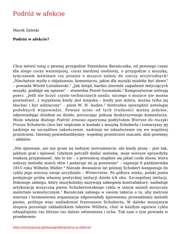 Podróż w afekcie Marek Zaleski Podróż w afekcie? Chcę mówić tutaj o pewnej przygodzie Stanisława Barańczaka, od pewnego czasu dla niego coraz ważniejszej, coraz bardziej osobistej, o przygodzie z muzyką, tymczasem mówienie czy pisanie o muzyce należy do rzeczy arcytrudnych! „Niechętnie myślę o objaśnieniu, komentarzu, jakim dla muzyki miałoby być słowo” – powiada Witold Lutosławski.1 „Jak dotąd, bardzo niewiele zagadnień dotyczących muzyki, poddaje się opisowi” – stwierdza Paweł Szymański.2 Kompozytorom wtórują poeci: „Jeśli nie liczyć czysto technicznych analiz, niczego o muzyce nie można powiedzieć, z wyjątkiem kiedy jest kiepska – kiedy jest dobra, można tylko jej słuchać i być wdzięczny” – pisze W. H. Auden. 3 Nietrudno sporządzić antologię podobnych wypowiedzi. Pewnie uciec od tych trudności można jedynie, odpowiadając dziełem na dzieło, porzucając pokusę dyskursywnego komentarza. Może właśnie dlatego Podróż zimowa opatrzona podtytułem Wiersze do muzyki Franza Schuberta chce być wejściem w kontakt z muzyką Schuberta i towarzyszy jej nadzieja na szczęśliwe zakończenie, nadzieja na odnalezienie się we wspólnej przestrzeni. Dawniej powiedzielibyśmy: wspólnej przestrzeni znaczeń, dziś powiemy – afektów. „Nie śpiewam, ani nie gram na żadnym instrumencie, ale kiedy piszę – jest tak, jakbym grał i śpiewał. Gdybym potrafił dodać melodię, moje wiersze sprawiłyby większą przyjemność. Ale to nic – z pewnością znajdzie się jakaś czuła dusza, która usłyszy melodię moich słów i podaruje mi ją ponownie” – zapisuje 8 października 1815 roku Wilhelm Müller.4 Niecałe dwanaście lat później Schubert komponuje do cyklu jego wierszy swoje arcydzieło – Winterreise. Po półtora wieku, polski poeta podejmuje próbę własnej poetyckiej imitacji dzieła ich obu. Szczególnej imitacji. Dokonuje zabiegu, który muzykolodzy nazywają zabiegiem kontrafaktury: naśladuje artykulację muzyczną pieśni Schubertowskiego cyklu w innym aniżeli muzyczny materiale semiotycznym.5 Barańczak zabiega w swoim tekście o to, aby metrum wiersza i brzmieniowa organizacja odpowiadały śpiewnemu prowadzeniu melodii pieśni, próbuje więc naśladować frazowanie Schuberta. W daleko mniejszym stopniu pozostaje zakładnikiem tekstów Müllera, choć w każdym ogniwie cyklu odnajdujemy raz bliższe raz dalsze odniesienia i echa. Tak sam o tym powiada w przedmowie: http://stronypoezji.pl/monografie/podroz-w-afekcie/ Wiersze zawarte w tym zbiorze są, z jednym wyjątkiem [mowa o piąty utworze cyklu – Die Lindebaum (Lipa)], utworami oryginalnymi – n i e przekładami liryków romantycznych poety Wilhelma Müllera […]. Niewątpliwie jednak moje wiersze, pisane przede wszystkim do melodii kompozytora, a nie usiłujące przekładać ani parafrazować liryka, zawdzięczają Müllerowi sporo inspiracji sytuacyjnych, tematycznych a nawet fonetycznych – choćby ostatecznym wynikiem był utwór całkowicie różny od wiersza niemieckiego romantyka albo i wobec niego polemiczny. Choć związek między moimi utworami a muzyką Schuberta jest bardziej intymny i ścisły, moją ambicją było napisanie takich tekstów, które można byłoby zaśpiewać do określonej melodii, a zarazem – przeczytać również w oderwaniu od muzyki, jako samodzielne wiersze. Do przeczytania niniejszego tomu nie jest więc bezwzględnie konieczna wcześniejsza znajomość lub równoczesne słuchanie Schubertowskiego cyklu. Nie ukrywam jednak, że najwięcej – jak mi się wydaje – skorzysta na lekturze Czytelnik, który przed nią albo w jej trakcie – wysłucha któregoś z dostępnych nagrań Winterreise.6 Rzec by można, że Barańczak, tworząc swoją kontrafakturę dzieła Schuberta, dokonuje sztuki intertekstualnej parafrazy czy, jak się niegdyś pisało, przekodowania semiotycznego – i tak właśnie krytycy, literaturoznawcy i muzykolodzy pisali o tym przedsięwzięciu. Ale można też powiedzieć, wydobywając to, co jest zamaskowane a może nawet eskamotowane przez autora w przedmowie (przedmowy pisze się zawsze ex post! – gdy bierze górę racjonalna kalkulacja), można więc powiedzieć, że Barańczak odpowiada afektem na afekt. W długim łańcuchu pokoleń jest kolejną „czułą duszą”, która uznaje za konieczne kontrasygnować dzieło Schuberta własnym komentarzem. Jako poeta robi to własnym głosem i własnym tekstem. Czy zrobiłby to, gdyby u źródeł jego przedsięwzięcia leżał tylko beznamiętny podziw dla wirtuozerii poprzednika i chęć sprawdzenia się w poetyckim rzemiośle? Podróż zimowa nie jest wypracowaniem stylistycznym, jak nie jest nim Winterreise. Schubert skomponował Winterreise, kiedy wiedział już o swojej chorobie (cierpiał na syfilis), która była wtedy wyrokiem śmierci. Wybrał też bardziej pesymistyczną w wymowie redakcję kolejności tekstów, niż zrobił to sam poeta. Podczas słynnego autorskiego prawykonania cyklu – 4 marca 1827 roku – zapowiedział zgromadzonym przyjaciołom, że usłyszą „pieśni straszliwe”.7 I cykl Winterreise, będący rozłożoną na 24 epizody piosenką niekochanego, odtrąconego przez dziewczynę i jej rodziców, wreszcie bliźnich, opowiada zarazem o samotności wędrowca w zimnym, obcym http://stronypoezji.pl/monografie/podroz-w-afekcie/ świecie; o samotności, która zyskuje wymiar kosmiczny. „Wkroczyłem jako obcy / Odchodzę taki sam” – tak otwiera się Schubertowski cykl, a zamyka go pytanie o szansę na odnalezienie się we wspólnocie bliźnich za sprawą sztuki. U autora Winterreise finalne pytanie – jak podkreśla Susan Youens, wybitna znawczyni muzyki Schuberta, w książeczce dołączonej do płyty z wykonaniem Thomasa Hamptona (EMI Records) – pozostaje bez odpowiedzi. Odpowiada na nie tylko echo muzyki kataryniarza, która – zdaniem Youens – jest „muzyką w stanie elementarnym”. Czy 