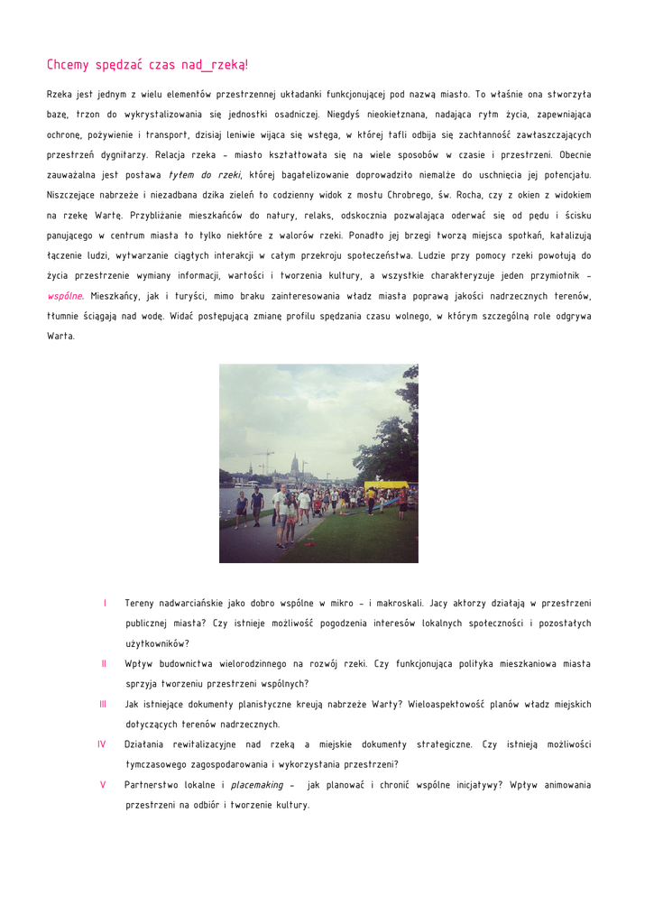 Chcemy spędzać czas nad_rzeką! Rzeka jest jednym z wielu elementów przestrzennej układanki funkcjonującej pod nazwą miasto. To właśnie ona stworzyła bazę, trzon do wykrystalizowania się jednostki osadniczej. Niegdyś nieokiełznana, nadająca rytm życia, zapewniająca ochronę, pożywienie i transport, dzisiaj leniwie wijąca się wstęga, w której tafli odbija się zachłanność zawłaszczających przestrzeń dygnitarzy. Relacja rzeka - miasto kształtowała się na wiele sposobów w czasie i przestrzeni. Obecnie zauważalna jest postawa tyłem do rzeki, której bagatelizowanie doprowadziło niemalże do uschnięcia jej potencjału. Niszczejące nabrzeże i niezadbana dzika zieleń to codzienny widok z mostu Chrobrego, św. Rocha, czy z okien z widokiem na rzekę Wartę. Przybliżanie mieszkańców do natury, relaks, odskocznia pozwalająca oderwać się od pędu i ścisku panującego w centrum miasta to tylko niektóre z walorów rzeki. Ponadto jej brzegi tworzą miejsca spotkań, katalizują łączenie ludzi, wytwarzanie ciągłych interakcji w całym przekroju społeczeństwa. Ludzie przy pomocy rzeki powołują do życia przestrzenie wymiany informacji, wartości i tworzenia kultury, a wszystkie charakteryzuje jeden przymiotnik wspólne. Mieszkańcy, jak i turyści, mimo braku zainteresowania władz miasta poprawą jakości nadrzecznych terenów, tłumnie ściągają nad wodę. Widać postępującą zmianę profilu spędzania czasu wolnego, w którym szczególną role odgrywa Warta. I Tereny nadwarciańskie jako dobro wspólne w mikro - i makroskali. Jacy aktorzy działają w przestrzeni publicznej miasta? Czy istnieje możliwość pogodzenia interesów lokalnych społeczności i pozostałych użytkowników? II Wpływ budownictwa wielorodzinnego na rozwój rzeki. Czy funkcjonująca polityka mieszkaniowa miasta sprzyja tworzeniu przestrzeni wspólnych? III Jak istniejące dokumenty planistyczne kreują nabrzeże Warty? Wieloaspektowość planów władz miejskich dotyczących terenów nadrzecznych. IV Działania rewitalizacyjne nad rzeką a miejskie dokumenty strategiczne. Czy istnieją możliwości tymczasowego zagospodarowania i wykorzystania przestrzeni? V Partnerstwo lokalne i placemaking - jak planować i chronić wspólne inicjatywy? Wpływ animowania przestrzeni na odbiór i tworzenie kultury. Burza_mózgów Przestrzenie wspólne w mieście, znaczenie i status. Identyfikacja użytkowników przestrzeni: lokalna społeczność, pozostali mieszkańcy miasta, turyści, przedsiębiorcy, inwestorzy, artyści, NGO-sy, spółki, zarządcy itp. Mikroskala miasta - rady osiedli a makroskala - wszyscy użytkownicy. Administratorzy, przedstawiciele przestrzeni w kontekście powyższego podziału. Stary Rynek, ulica św. Marcin, Stare ZOO, rzeka z nabrzeżem – przykłady miejsc wspólnych, w których stykają się różne potrzeby i różni użytkownicy przestrzeni. Współpraca miasta i firm deweloperskich. Zmiana przeznaczenia terenów rekreacyjnych i terenów zieleni publicznej pod zabudowę wielorodzinną i biurową. Blokowanie kreatywności, swobody spędzania wolnego czasu i potencjału przestrzeni poprzez ciągłą zabudowę. Wykluczenia w zapisach dotyczących zagospodarowania przestrzeni wzdłuż rzeki Warty na przykładzie konkretnych dokumentów. Ułomność gospodarowania i planowania miejsc wspólnych w mieście, brak wyznaczenia takich obszarów. Długookresowe plany strategiczne implikują blokowanie możliwości tymczasowego zagospodarowania. Czy tymczasowe zagospodarowanie terenu może stać się stałym elementem krajobrazu rzeki? Sytuacja obecna rzeki Warty a plany perspektywiczne. Plany i strategie miasta dotyczące rzeki Warty a rzeczywiste potrzeby mieszkańców. Wzrost zainteresowania społeczeństwa terenami nadrzecznymi, a potrzeba adaptacji przestrzeni dla mieszkańców. Szeląg, cypel przy ulicy Szyperskiej, Stara Gazownia, KontenerART, teren Domu Kultury nr 1 – przykłady funkcjonujących przestrzeni wspólnych. Jak wesprzeć istniejące potencjalne przestrzenie nad Wartą w dalszym funkcjonowaniu?. Szybko zmieniające się potrzeby społeczeństwa, weryfikacja rzeczywistości, śledzenie zapotrzebowań i trendów w spędzaniu wolnego czasu. Rekomendacja - miejsca dla życia publicznego, wyznaczenie przykładowych stref dla działalności społecznej, kulturalnej, artystycznej itp. Sytuacja obecna nabrzeża_Warty a plany odległe Teraźniejszość _wzrost liczby osób odwiedzających nadbrzeże Warty _wzrost zainteresowania społeczeństwa stanem rzeki, jej zagospodarowaniem _pojedyncze wydarzenia kulturalne, spływy rzeczne _brak wystarczającej infrastruktury drogowej i pieszo - rowerowej _niedostateczna ilość zejść nad rzekę _brak elementów małej architektury: ławek, koszy na śmieci, oświetlenia _brak zaplecza usługowego _skromny program artystyczny, brak animacji wydarzeń i ofert aktywności _postępujące przybliżanie się zabudowy do brzegów rzeki _brak miejsca na bulwary _brak miejscowych planów zagospodarowania przestrzennego _dezinformacja _brak działań rewitalizacyjnych VS. Przyszłość według dokumentów planistycznych _bulwary nadwarciańskie _kładki pieszo-rowerowe _przystań z komunikacją rzeczną _zmniejszenie obciążenia komunikacyjnego dróg _wprowadzenie funkcji komercyjnych _brak „kubaturowych zabudowań” _sporty wodne na rzece _przestrzenie dla wydarzeń artystycznych _rezydencjalne budownictwo nad wodą