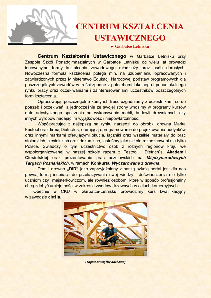 CENTRUM KSZTAŁCENIA USTAWICZNEGO w Garbatce Letnisku Centrum Kształcenia Ustawicznego w Garbatce Letnisku przy Zespole Szkół Ponadgimnazjalnych w Garbatce Letnisku od wielu lat prowadzi innowacyjne formy kształcenia zawodowego młodzieży oraz osób dorosłych. Nowoczesna formuła kształcenia polega min. na uzupełnianiu opracowanych i zatwierdzonych przez Ministerstwo Edukacji Narodowej podstaw programowych dla poszczególnych zawodów w treści zgodne z potrzebami lokalnego i ponadlokalnego rynku pracy oraz oczekiwaniami i zainteresowaniami uczestników poszczególnych form kształcenia. Opracowując poszczególne kursy ich treść uzgadniamy z uczestnikami co do potrzeb i oczekiwań, a jednocześnie ze swojej strony wnosimy w programy kursów nutę artystycznego spojrzenia na wykonywanie mebli, budowli drewnianych czy innych wyrobów nadając im wyjątkowość i niepowtarzalność. Współpracując z najlepszą na rynku narzędzi do obróbki drewna Marką Festool oraz firmą Dietrich`s, oferującą oprogramowanie do projektowania budynków oraz innymi markami oferującymi okucia, łączniki oraz wszelkie materiały do prac stolarskich, ciesielskich oraz dekarskich, jesteśmy jako szkoła rozpoznawani nie tylko Polsce. Świadczy o tym uczestnictwo osób z różnych regionów kraju we współorganizowanej w naszej szkole razem z Festool i Dietrich`s, Akademii Ciesielskiej oraz prezentowanie prac uczniowskich na Międzynarodowych Targach Poznańskich. w ramach Konkursu Wyczarowane z drewna. Dom i drewno „DID” jako zaprzyjaźniony z naszą szkołą portal jest dla nas pewną formą inspiracji do przekazywania swej wiedzy i doświadczenia nie tylko uczniom czy majsterkowiczom, ale również osobom, które w sposób profesjonalny chcą zdobyć umiejętności w zakresie zwodów drzewnych w celach komercyjnych. Obecnie w CKU w Garbatce-Letnisku prowadzimy kurs kwalifikacyjny w zawodzie cieśla. Fragment więźby dachowej Kurs ten jest BEZPŁATNY realizowany w zjazdach sobotnio-niedzielnych co 2 tygodnie. Kurs ten trwa 3 semestry. Część zajęć teoretycznych realizowana jest przez Internet, natomiast wszystkie zajęcia praktyczne odbywają się w warsztatach szkolnych w Garbatce. Po konsultacji z uczestnikami zajęcia ułożone zostały tak, aby skumulować zjazdy w czasie jesienno zimowym unikając w ten sposób kolizji z pracami zawodowymi na placu budowy. Oprócz wymaganych programem treści nauczania organizujemy spotkania kursantów z architektami, przedstawicielami handlowymi łączników i okuć ciesielskich, pokryć dachowych i dociepleń, producentami budynków drewnianych, przedstawicielem firmy Dietrich`s, oferującej program do projektowania budynków drewnianych i innymi. Od września rozpoczynamy nowe kursy kwalifikacyjne w zawodach; cieśla, dekarz i stolarz na takich samych warunkach jak kurs cieśli prowadzony obecnie. Istnieje możliwość skrócenia kursów do 12-15 miesięcy. Uczniowie przy pracach stolarskich i renowacyjnych W CKU prowadzimy również Szkołę Policealną w zawodzie technik bezpieczeństwa i higieny pracy. Zawód technika BHP jest bardzo odpowiedzialnym i zarazem popłatnym zawodem Jest to 1,5 roczna szkoła zaoczna BEZPŁATNA w której słuchacze zdobywają wiedzę w zakresie bezpiecznych i higienicznych warunków pracy, ochrony środowiska oraz ochrony przeciwpożarowej niezwykle przydatną podczas swojej kariery zawodowej. Innymi formami kształcenia zawodowego wdrażanymi od września 2014r. będą kursy i szkolenia umożliwiające nabycie umiejętności w projektowaniu i wykonywaniu mebli skrzyniowych, mebli do zabudowy, wykonywania mebli w oparciu o systemy przesuwne. Przygotowujemy również programy na potrzeby kursów: Snycerstwa Intarsji i mozaiki Elementy snycerki na nóżce taboretu Mozaika podłogowa wykonana metodą intarsji Wykonywania witraży Pozłotnictwa i politury Fragment ramy złoconej Wypełnienie ramy witrażu CKU w Garbatce w ramach kształcenia zawodowego razem Marką profesjonalnych narzędzi Festool oraz właścicielem profesjonalnego oprogramowania do projektowania budynków drewnianych firmy Dietrich`s, zaprasza na nasze kursy wszystkich zainteresowanych kształceniem zawodowym w kierunkach drzewnych. Wspólnie możemy pomóc wielu osobom w uzyskaniu kwalifikacji zawodowych, osobom posiadającym doświadczenie zawodowe w zdobyciu w krótkim czasie potwierdzenia tych kwalifikacji oraz przyczynić się do podniesienia świadomości technicznej w zakresie wykonywanego zawodu. Dla osób chcących uzyskać kwalifikacje w drodze egzaminów eksternistycznych, organizujemy seminaria na których doświadczeni wykładowcy prowadzą zajęcia z zakresu przygotowania słuchaczy do tej formy egzaminu. Na miejscu posiadamy możliwość zakwaterowania i całodziennego wyżywienia uczestników w schronisku młodzieżowym oraz bardzo ciekawą bogatą zabytki i inne ciekawe miejsca okolicę Garbatki. Na wszystkie Państwa pytania oraz formy współpracy z Centrum Kształcenia Ustawicznego w Garbatce-Letnisku odpowiem pod numerem (48)6210047; kom. 608-844-948, lub e-mail: [email protected] www.drzewna.com W imieniu własnym i całej społeczności szkolnej zapraszamy do Garbatki Bogusław Szumilas