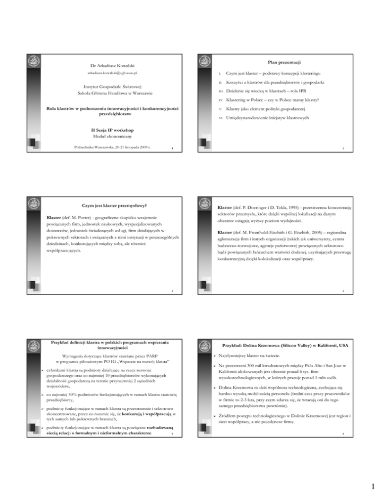 Plan prezentacji Dr Arkadiusz Kowalski [email protected] Instytut Gospodarki Światowej Szkoła Główna Handlowa w Warszawie Rola klastrów w podnoszeniu innowacyjności i konkurencyjności przedsiębiorstw I. Czym jest klaster – podstawy koncepcji klasteringu II. Korzyści z klastrów dla przedsiębiorstw i gospodarki III. Dzielenie się wiedzą w klastrach – rola IPR IV. Klastering w Polsce – czy w Polsce mamy klastry? V. Klastry jako element polityki gospodarczej VI. Umiędzynarodowienie inicjatyw klastrowych II Sesja IP workshop Moduł ekonomiczny Politechnika Warszawska, 20-21 listopada 2009 r. 1 2 Czym jest klaster przemysłowy? Klaster (def. P. Doeringer i D. Tekla, 1995) - przestrzenna koncentrację sektorów przemysłu, które dzięki wspólnej lokalizacji na danym obszarze osiągają wyższy poziom wydajności. Klaster (def. M. Porter) - geograficzne skupisko wzajemnie powiązanych firm, jednostek naukowych, wyspecjalizowanych dostawców, jednostek świadczących usługi, firm działających w pokrewnych sektorach i związanych z nimi instytucji w poszczególnych dziedzinach, konkurujących między sobą, ale również współpracujących. Klaster (def. M. Fromhold-Eisebith i G. Eisebith, 2005) – regionalna aglomeracja firm i innych organizacji (takich jak uniwersytety, centra badawczo-rozwojowe, agencje państwowe) powiązanych sektorowo bądź powiązanych łańcuchem wartości dodanej, uzyskujących przewagę konkurencyjną dzięki kolokalizacji oraz współpracy. 3 4 Przykład definicji klastra w polskich programach wspierania innowacyjności Wymagania dotyczące klastrów stawiane przez PARP w programie pilotażowym PO IG „Wsparcie na rozwój klastra” członkami klastra są podmioty działające na rzecz rozwoju gospodarczego oraz co najmniej 10 przedsiębiorców wykonujących działalność gospodarczą na terenie przynajmniej 2 sąsiednich województw, co najmniej 50% podmiotów funkcjonujących w ramach klastra stanowią przedsiębiorcy, podmioty funkcjonujące w ramach klastra są przestrzennie i sektorowo skoncentrowane, przez co rozumie się, że konkurują i współpracują w tych samych lub pokrewnych branżach, podmioty funkcjonujące w ramach klastra są powiązane rozbudowaną siecią relacji o formalnym i nieformalnym charakterze. 5 Przykład: Dolina Krzemowa (Silicon Valley) w Kalifornii, USA Najsłynniejszy klaster na świecie. Na przestrzeni 300 mil kwadratowych między Palo Alto i San Jose w Kalifornii ulokowanych jest obecnie ponad 6 tys. firm wysokotechnologicznych, w których pracuje ponad 1 mln osób. Dolina Krzemowa to dziś wspólnota technologiczna, cechująca się bardzo wysoką mobilnością personelu (średni czas pracy pracowników w firmie to 2-3 lata, przy czym zdarza się, że wracają oni do tego samego przedsiębiorstwa powtórnie). Źródłem postępu technologicznego w Dolinie Krzemowej jest region i sieci współpracy, a nie pojedyncze firmy. 6 1 Źródła koncepcji klasteringu: Klastering jako nowe podejście do polityki rozwoju regionalnego teorie lokalizacji przedsiębiorstw przemysłowych => (A. Webera) kryterium optymalnej lokalizacji - punkt minimalnych kosztów czynników wyborów lokalizacyjnych (transportu, pracy) Tendencje w UE i OECD: => (A. Löscha) - maksymalizacja zysku czyli punkt zapewniający maksymalny dochód przy minimalnych kosztach wytwarzania => (teoria W. Isarda) - zasada substytucji czynników produkcji (np. substytucja nakładów na transport w miejsce nakładów na surowce). teoria A. Marshalla (marshalowski dystrykt przemysłowy) => zlokalizowane efekty zewnętrzne (korzyści lokalizacji, korzyści aglomeracji), w tym przede wszystkim dyfuzja wiedzy teoria biegunów wzrostu F. Perroux => polaryzacja rozwoju coraz większa waga przywiązywana do lokalnej koncentracji określonych branż i zachodzących w nich dyfuzji innowacji Wzrost zainteresowania klastrami przemysłowymi, których koncepcja nawiązuje do marschallowskich okręgów przemysłowych Klastering obecny w ponadnarodowych (UE) i narodowych politykach/strategiach rozwoju gospodarczego Szczególny nacisk kładzie się na klastry w sektorach wysokich technologii (wg OECD: przemysł lotniczy i kosmiczny, farmaceutyczny, komputerowy i urządzeń biurowych, wyposażenia radiowego, telewizyjnego, i telekomunikacyjnego oraz instrumentów precyzyjnych, medycznych i optycznych) 7 8 Kluczowe aspekty funkcjonowania klastrów Jaka skala przestrzenna jest optymalna dla wzmacniania procesów innowacyjnych? polaryzacja rozwoju Koncentracja przestrzenna Poziom lokalny? Poziom krajowy? Poziom regionalny? Poziom Wspólnotowy? (wymiar geograficzny) nacisk (push) i ssanie (pull) innowacyjne Doświadczenia państw wysoko rozwiniętych wskazują na regionalizację zdolności innowacyjnych Bliskość efekty synergii i spillovers (proximity) Definicja regionu: Region – geograficznie zdefiniowana i administracyjnie wyodrębniona przestrzeń, czy Region – jednorodna gospodarczo i kulturowo przestrzeń, posiadająca swoją specyfikę i wewnętrzną spójność. od linearnego do interakcyjnego modelu procesu innowacyjnego Innowacje koncentrują się w mniejszej strukturze przestrzennej niż region administracyjny – w regionie ekonomicznym (kategoria przestrzenno-ekonomiczna, w którą wpisuje się koncepcja klastra) 9 Partnerzy Interakcje Powiązania (linkages) Klaster a inicjatywa klastrowa Koncentracja sektorowa10 Plan prezentacji Inicjatywa klastrowa - mniej lub bardziej zinstytucjonalizowane działanie grupy aktorów lokalnych mające na celu zainicjowanie funkcjonowania danego klastra bądź rozwiązanie istotnych problemów już funkcjonującego klastra. => celowe działanie mające na celu budowę sformalizowanej struktury wspomagającej sieciowanie partnerów gospodarczych i naukowych należących do spontanicznie zainicjowanego klastra lub jego zalążka. I. Czym jest klaster – podstawy koncepcji klasteringu II. Korzyści z klastrów dla przedsiębi