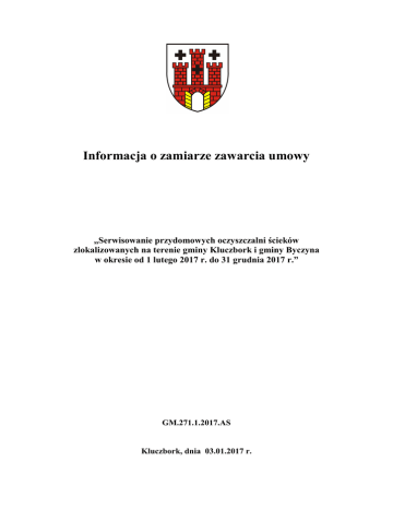 Informacja o zamiarze zawarcia umowy „Serwisowanie przydomowych oczyszczalni ścieków zlokalizowanych na terenie gminy Kluczbork i gminy Byczyna w okresie od 1 lutego 2017 r. do 31 grudnia 2017 r.” GM.271.1.2017.AS Kluczbork, dnia 03.01.2017 r. I. Nazwa oraz adres Zamawiającego Zamawiającym jest : GMINA KLUCZBORK, ul. Katowicka 1, 46-200 KLUCZBORK, tel./fax. 077 418 22 30 II. Określenie przedmiotu zamówienia i wielkości lub zakresu zamówienia Przedmiot zamówienia obejmuje kompleksowe usługi serwisowe świadczone przez Wykonawcę mające na celu utrzymanie we właściwym stanie technicznym 417 przydomowych oczyszczalni ścieków wybudowanych w następujących miejscowościach: 1) Gmina Kluczbork - Smardy Górne, Nowa Bogacica, Smardy Dolne, Bogacka Szklarnia, Unieszów, śabiniec, KręŜel i Bogacica, Borkowice, BaŜany i Maciejów, Biadacz, Krzywizna; (365 przydomowych oczyszczalni ścieków) 2) Gmina Byczyna – Kostów, Janówka, Jakubowice, Miechowa, Ciecierzyn; (52 przydomowe oczyszczalnie ścieków) Kod zamówienia według Wspólnego Słownika Zamówień CPV: 90480000-5 Usługi gospodarki ściekowej III. Szacunkowa wartość zamówienia Wartość bez VAT: 290.000,00 zł. IV. Nazwa i adres wykonawcy, któremu zamawiający zamierza udzielić zamówienia Wodociągi i Kanalizacja HYDROKOM Sp. z o.o. ul. Kołłątaja 7 46-203 Kluczbork V. Podstawa prawna i uzasadnienie wyboru trybu udzielenia zamówienia z wolnej ręki Postępowanie wszczęte zostało na podstawie art. 67 ust. 1 pkt 12 Zamówienie polegające na serwisowaniu przydomowych oczyszczalni ścieków jest zadaniem własnym Gminy. Gmina jako Zamawiający działając na podstawie art. 67 ust. 1 pkt 12 ustawy z dnia 29 stycznia 2004 roku Prawo zamówień publicznych (Dz. U. z 2015 r. poz. 2164 z poźn. zm.) udziela zamówienia z wolnej ręki. Zamówienie moŜe być udzielone Wykonawcy tj. Wodociągi i Kanalizacja HYDROKOM Sp. z o.o. z siedziba w Kluczborku ul. Kołłątaja 7 poniewaŜ spełnione są łącznie następujące warunki: 2 a) zamawiający sprawuje nad tą osobą prawną kontrolę, odpowiadającą kontroli sprawowanej nad własnymi jednostkami, polegającą na dominującym wpływie na cele strategiczne oraz istotne decyzje dotyczące zarządzania sprawami tej osoby prawnej; b) ponad 90% działalności kontrolowanej osoby prawnej dotyczy wykonywania zadań powierzonych jej przez zamawiającego sprawującego kontrolę; c) w kontrolowanej osobie prawnej nie ma bezpośredniego udziału kapitału prywatnego. VI. Planowany termin realizacji zamówienia i czas trwania umowy Planowany termin wykonania zamówienia: Od 01.02.2017 r. do 31.12.2017 r. VII. Informacja o terminie i odpowiednio zamieszczeniu lub opublikowaniu ogłoszenia o zamiarze zawarcia umowy. Ogłoszenie o zamiarze zawarcia umowy zostało zamieszczone na stronie podmiotowej BIP w dniu 04.01.2017 r. /-/ Jarosław Kielar Burmistrz Miasta Kluczborka 3