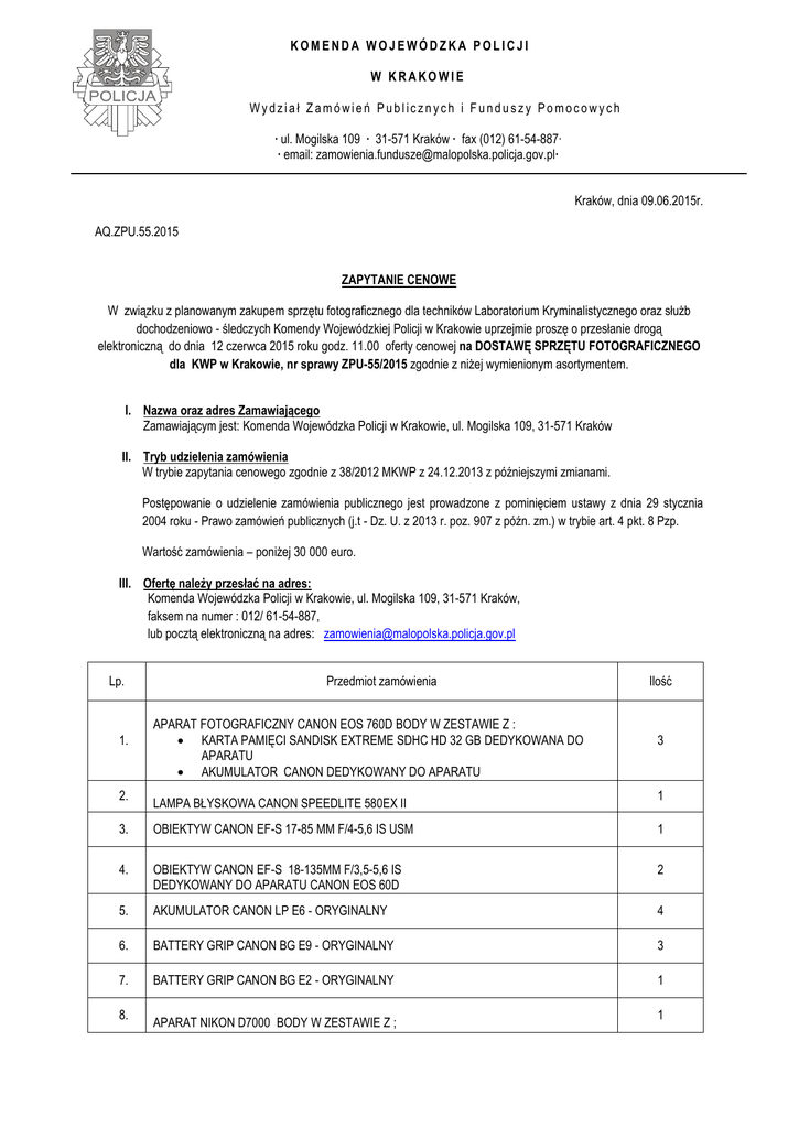 KOMENDA WOJEWÓDZKA POLICJI W KRAKOWIE Wydział Zamówień Publicznych i Funduszy Pomocowych ∙ ul. Mogilska 109 ∙ 31-571 Kraków ∙ fax (012) 61-54-887∙ ∙ email: [email protected]∙ Kraków, dnia 09.06.2015r. AQ.ZPU.55.2015 ZAPYTANIE CENOWE W związku z planowanym zakupem sprzętu fotograficznego dla techników Laboratorium Kryminalistycznego oraz służb dochodzeniowo - śledczych Komendy Wojewódzkiej Policji w Krakowie uprzejmie proszę o przesłanie drogą elektroniczną do dnia 12 czerwca 2015 roku godz. 11.00 oferty cenowej na DOSTAWĘ SPRZĘTU FOTOGRAFICZNEGO dla KWP w Krakowie, nr sprawy ZPU-55/2015 zgodnie z niżej wymienionym asortymentem. I. Nazwa oraz adres Zamawiającego Zamawiającym jest: Komenda Wojewódzka Policji w Krakowie, ul. Mogilska 109, 31-571 Kraków II. Tryb udzielenia zamówienia W trybie zapytania cenowego zgodnie z 38/2012 MKWP z 24.12.2013 z późniejszymi zmianami. Postępowanie o udzielenie zamówienia publicznego jest prowadzone z pominięciem ustawy z dnia 29 stycznia 2004 roku - Prawo zamówień publicznych (j.t - Dz. U. z 2013 r. poz. 907 z późn. zm.) w trybie art. 4 pkt. 8 Pzp. Wartość zamówienia – poniżej 30 000 euro. III. Ofertę należy przesłać na adres: Komenda Wojewódzka Policji w Krakowie, ul. Mogilska 109, 31-571 Kraków, faksem na numer : 012/ 61-54-887, lub pocztą elektroniczną na adres: [email protected] Lp. 1. 2. Przedmiot zamówienia APARAT FOTOGRAFICZNY CANON EOS 760D BODY W ZESTAWIE Z : KARTA PAMIĘCI SANDISK EXTREME SDHC HD 32 GB DEDYKOWANA DO APARATU AKUMULATOR CANON DEDYKOWANY DO APARATU LAMPA BŁYSKOWA CANON SPEEDLITE 580EX II Ilość 3 1 3. OBIEKTYW CANON EF-S 17-85 MM F/4-5,6 IS USM 1 4. OBIEKTYW CANON EF-S 18-135MM F/3,5-5,6 IS DEDYKOWANY DO APARATU CANON EOS 60D 2 5. AKUMULATOR CANON LP E6 - ORYGINALNY 4 6. BATTERY GRIP CANON BG E9 - ORYGINALNY 3 7. BATTERY GRIP CANON BG E2 - ORYGINALNY 1 8. APARAT NIKON D7000 BODY W ZESTAWIE Z ; 1 9. 10. 11. KARTA PAMIĘCI SANDISK EXTREME SDHC HD 32 GB DEDYKOWANA DO APARATU AKUMULATOR NIKON DEDYKOWANY DO APARATU OBIEKTYW NIKON 18-105 DEDYKOWANY DO APARATU NIKON D7000 FILTR KRAWĘDZIOWY DŁUGOFALOWY 52 MM DEDYKOWANY DO OBIEKTYWU NIKON D700O FILTR POMARAŃCZOWY FILTR CZERWONY APARAT FOTOGRAFICZNY NIKON BODY D5200 W ZESTAWIE : KARTA PAMIĘCI SANDISK EXTREME SDHC HD 32 GB DEDYKOWANA DO APARATU AKUMULATOR NIKON DEDYKOWANY DO APARATU 1 1 1 1 12. OBIEKTYW NIKON AF-S DX 18-105MM ED VR DEDYKOWANY DO APARATU NIKON D5200 1 13. APARAT NIKON COOLPIX S9700 CZARNY W ZESTAWIE Z : AKUMULATOR, KABEL USB, PASEK, ŁADOWARKA 1 14. TORBA FOTOGRAFICZNA RACAM ALPHA 30 4 15. CZYTNIK KART PAMIECI ESPERANZA TITANUM 101K SD/SDHC/MMC 10 1. Dostawca zobowiązuje się dostarczyć przedmiot zamówienia na swój koszt do Komendy Wojewódzkiej Policji w Krakowie, ul. Mogilska 109. 2. Zamawiający określa termin dostawy do 7 dni kalendarzowych od daty przesłania zamówienia, 3. Zamawiający zastrzega sobie prawo do ograniczenia zakresu zamówienia w stosunku do ilości zamówienia podanej w ofercie (załącznik nr 1) w przypadku gdyby ilości te nie znalazły w pełni pokrycia w bieżących wydatkach Policji w tym zakresie. 4. Oferta nie musi dotyczyć wszystkich pozycji, Zamawiający dopuszcza możliwość składania ofert częściowych (na jedno wybrane zadanie). 5. Zamawiający zastrzega sobie prawo do wyboru części asortymentu danego wykonawcy, 6. Zamawiający zastrzega sobie wybór oferty, która będzie gwarantowała wydatkowanie środków w sposób celowy, oszczędny z zachowaniem zasady uzyskiwania najlepszych efektów z danych nakładów. 7. Zapłata nastąpi w terminie 21 dni od daty otrzymania prawidłowo wystawionej faktury – przelewem na wskazane przez Dostawcę konto. 8. Okres związania ofertą wynosi 30 dni od daty jej złożenia. 9. Zamawiający udzieli zamówienia Wykonawcy, którego oferta odpowiada asortymentowi określonemu w niniejszym zapytaniu oraz zostanie uznana za najkorzystniejszą w danej pozycji wykazu. 10. okres gwarancji oferowanego asrotymentu ma być zgodny z zaleceniami producenta. 11. Opis sposobu przygotowywania oferty Ofertę należy sporządzić zgodnie z formularzem ofertowym. 12. Informacja o sposobie porozumiewania się Zamawiającego z Wykonawcami, a także wskazanie osób uprawnionych do porozumiewania się z Wykonawcami. Z Zamawiającym można porozumiewać się pisemnie, na adres: Komenda Wojewódzka Policji w Krakowie, ul. Mogilska 109, 31-571 Kraków, faksem na numer : 012/ 61-54-887, lub pocztą elektroniczną na adres: [email protected] 13. W razie konieczności uzyskania dodatkowych informacji, osobą upoważnioną do kontaktów w przedmiotowej sprawie będzie: Beata Krypciak – tel. 12 61 54 661, e-mail: [email protected] Zał. nr 1 do ZPU-55/2015 .………………………………………………………. pieczęć firmowa Wykonawcy ..………..…………………………………………….. miejscowość, data Komenda Wojewódzka Policji w Krakowie ul. Mogilska 109 31-571 Kraków FORMULARZ OFERTOWY ………………………………………………………………………………….……………………………………… …………………………………………………………………………………………..…………………………….. pełna nazwa Wykonawcy …………………………………………………………….…………………………………………………………… ………………………………………………….……………………………………………………………………… dokładny adres Wykonawcy REGON: ………………..………………………… NIP: ……………………………………… Internet: http://.…………… ……………………… e-mail: ……………………………………… numer kierunkowy: ….…………………………… tel. ………………………………… faks. ……..…