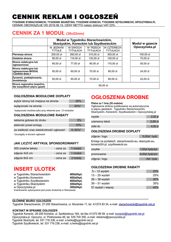 CENNIK REKLAM I OGŁOSZEŃ TYGODNIK STARACHOWICKI, TYGODNIK SKARŻYSKI, TYGODNIK KONECKI, TYGODNIK SZYDŁOWIECKI, OPOCZYŃSKA.PL CENNIK OBOWIĄZUJE OD 2016.06.15, CENY NETTO należy doliczyć VAT 23% CENNIK ZA 1 MODUŁ (38x52mm) Moduł w Tygodniku Starachowickim, Skarżyskim, Koneckim lub Szydłowieckim Moduł w gazecie Opoczyńska.pl W JEDNYM TYTULE 200,00 zł 90,00 zł W DWÓCH TYTUŁACH 260,00 zł 114,00 zł W TRZECH TYTUŁACH 310,00 zł 132,00 zł W CZTERECH TYTUŁACH 350,00 zł 145,00 zł Strona redakcyjna lub ogłoszeniowa 65,00 zł 77,00 zł 90,00 zł 115,00 zł 50,00 zł Strona redakcyjna lub ogłoszeniowa MODUŁ CZARNO-BIAŁY 50,00 zł 60,00 zł 70,00 zł 80,00 zł 24,00 zł Życzenia, podziękowania, kondolencje 50,00 zł 60,00 zł 70,00 zł 80,00 zł 24,00 zł Pierwsza strona Ostatnia strona Strona regionalna (wspólna dla wszystkich pięciu gazet) 100,00 zł 70,00 zł 90,00 zł OGŁOSZENIA MODUŁOWE DOPŁATY wybór strony lub miejsca na stronie 20% wyłączność na stronie 50%* *wyłączność możliwa tylko przy reklamie pow. 12 modułów OGŁOSZENIA MODUŁOWE RABATY reklama gotowa do druku 5% płatność przed emisją 10% za wielkość oraz wielokrotność ogłoszeń 5–50%* *szczegóły w biurach ogłoszeń OGŁOSZENIA DROBNE Płatne za 1 linię (26 znaków) Ogłoszenia drobne publikowane są automatycznie w pięciu gazetach: Tygodniku Starachowickim, Skarżyskim, Koneckim, Szydłowieckim i Opoczyńskiej.pl zwykłe 2,00 zł czerwony tekst 2,60 zł żółte tło 4,00 zł OGŁOSZENIA DROBNE DOPŁATY zdjęcie / logo 5,00zł / tydz JAK LICZYĆ ARTYKUŁ SPONSOROWANY? Emisja na portalach: starachowicki.eu, skarzyski.eu, konecki24.pl, szydlowiecki.eu 300 znaków tekstu - cena za 1 moduł zwykłe 1,00zł /tydz/szt zdjęcie 4x5 cm - cena za 1 moduł promowane 6,00zł /tydz/szt zdjęcie 8x5 cm - cena za 2 moduły zdjęcie / logo OGŁOSZENIA DROBNE RABATY INSERT ULOTEK w Tygodniku Starachowickim w Tygodniku Koneckim w Tygodniku Szydłowieckim w Tygodniku Skarżyskim w Opoczyńska.pl 0zł / tydz 400zł/kpl. 400zł/kpl. 400zł/kpl. 300zł/kpl. 300zł/kpl. Insertowanie wykonywane jest przez drukarnię w Warszawie. 5 – 12 wydań 13 – 25 wydań 26 – 38 wydań 39 – 51 wydań 51 wydań i więcej 20% 25% 30% 35% 40% ______________________________________________________________________________________ GŁÓWNE BIURO OGŁOSZEŃ Tygodnik Starachowicki, 27-200 Starachowice, ul. Murarska 11, tel. 41/274 83 34, e-mail: [email protected] KONTAKT W SPRAWIE OGŁOSZEŃ Tygodnik Konecki, 26-200 Końskie, ul. Spółdzielcza 16A, tel./fax 41/372 89 59, e-mail: [email protected] Opoczyńska.pl, Opoczno, ul. Piotrkowska 46, tel. 535 700 355, e-mail: [email protected] Tygodnik Skarżyski, tel. 531 716 236, e-mail: [email protected] Tygodnik Szydłowiecki, tel. 531 716 236, e-mail: [email protected]