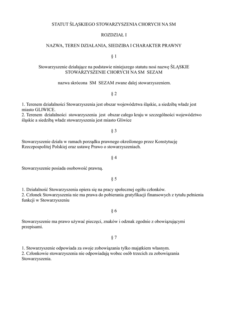 STATUT ŚLĄSKIEGO STOWARZYSZENIA CHORYCH NA SM ROZDZIAŁ I NAZWA, TEREN DZIAŁANIA, SIEDZIBA I CHARAKTER PRAWNY §1 Stowarzyszenie działające na podstawie niniejszego statutu nosi nazwę ŚLĄSKIE STOWARZYSZENIE CHORYCH NA SM SEZAM nazwa skrócona SM SEZAM zwane dalej stowarzyszeniem. §2 1. Terenem działalności Stowarzyszenia jest obszar województwa śląskie, a siedzibą władz jest miasto GLIWICE. 2. Terenem działalności stowarzyszenia jest obszar całego kraju w szczególności województwo śląskie a siedzibą władz stowarzyszenia jest miasto Gliwice §3 Stowarzyszenie działa w ramach porządku prawnego określonego przez Konstytucję Rzeczpospolitej Polskiej oraz ustawę Prawo o stowarzyszeniach. §4 Stowarzyszenie posiada osobowość prawną. §5 1. Działalność Stowarzyszenia opiera się na pracy społecznej ogółu członków. 2. Członek Stowarzyszenia nie ma prawa do pobierania gratyfikacji finansowych z tytułu pełnienia funkcji w Stowarzyszeniu §6 Stowarzyszenie ma prawo używać pieczęci, znaków i odznak zgodnie z obowiązującymi przepisami. §7 1. Stowarzyszenie odpowiada za swoje zobowiązania tylko majątkiem własnym. 2. Członkowie stowarzyszenia nie odpowiadają wobec osób trzecich za zobowiązania Stowarzyszenia. ROZDZIAŁ II CELE I ŚRODKI DZIAŁANIA §8 Stowarzyszenie jest organizacją społeczną obywateli polskich chorych na stwardnienie rozsiane i inne schorzenia neurologiczne, ich krewnych i przyjaciół, działającą na gruncie Konstytucji RP i ma na celu: a) zrzeszanie osób chorych celem poprawy ich warunków życiowych, zdrowotnych oraz zwiększania uczestnictwa w życiu społecznym, gospodarczym, zawodowym, kulturalnym, turystycznym i sportowym kraju, b) wyzwalanie inicjatywy osób chorych w kierunku jak najwszechstronniejszej ich rehabilitacji i leczenia rozumianych jako proces osiągania optymalnego poziomu funkcjonowania w społeczeństwie po to, by zapewnić im możliwość kierowania własnym życiem, c) likwidacji barier psychologiczno-społecznych poprzez uświadomienie pełnosprawnej społeczności problematyki dotyczącej osób ze stwardnieniem rozsianym i innymi schorzeniami neurologicznymi i kształtowanie partnerskich postaw między tymi grupami, d) artykułowanie i reprezentowanie interesów osób ze stwardnieniem rozsianym i innymi schorzeniami neurologicznymi w kraju w szczególności poprzez współpracę z Polskim Towarzystwem Stwardnienia Rozsianego oraz na arenie międzynarodowej między innymi poprzez współpracę ze Światową Federacją Towarzystw Stwardnienia Rozsianego oraz poszczególnymi organizacjami innych krajów. §9 Cele swoje realizuje poprzez: a) współdziałanie z organizacjami społecznymi, religijnymi, administracji państwowej i samorządowej, placówkami służby zdrowia i innymi organizacjami i stowarzyszeniami pracującymi dla dobra i na rzecz osób niepełnosprawnych, b) organizowanie pomocy członkom stowarzyszenia w rozwiązywaniu wszelkich problemów życiowych poprzez informację, pomoc prawną, socjalno-bytową oraz współdziałanie w organizowaniu działalności społecznej, gospodarczej i kulturalnej, c) organizowanie samopomocy członkowskiej mającej na celu przeciwdziałanie uczuciu rezygnacji, bezwartościowości, osamotnienia i bezradności, szczególnie wśród osób najciężej poszkodowanych, d) prowadzenie działalności popularyzatorskiej, informacyjno-uświadamiającej, zmierzającej do pełnej integracji osób ze stwardnieniem rozsianym i innymi schorzeniami neurologicznymi ze społeczeństwem ludzi pełnosprawnych i kształtowanie właściwych postaw przy wykorzystaniu środków masowego przekazu i własnych publikacji, e) inicjowanie i uczestniczenie w pracach badawczych, legislacyjnych dotyczących życia i warunków bytu, oświaty i wychowania oraz specyficznych potrzeb osób ze stwardnieniem rozsianym, a także sposobu ich zaspokajania, zwłaszcza w zakresie: - ujawniania barier społecznych, organizacyjnych, architektonicznych, komunikacyjnych i innych, ograniczających kontakt osób ze stwardnieniem rozsianym ze środowiskiem i utrudniających im rehabilitację oraz występowanie do kompetentnych Władz z wnioskiem o ich usuniecie, - opracowywanie adekwatnych rozwiązań sprawy dostępu osób ze stwardnieniem rozsianym do różnego rodzaju stanowisk pracy zgodnie z ich możliwościami fizycznymi, kwalifikacjami i zainteresowaniami oraz zasad jego realizacji, - opiniowanie i inicjowanie produkcji sprzętu ortopedycznego i rehabilitacyjnego niezbędnego lub usprawniającego życie codzienne i pracę osób ze stwardnieniem rozsianym. f) organizowanie kongresów, konferencji, sympozjów, posiedzeń, zjazdów, poradnictwa, imprez kulturalnych, rekreacyjnych, oświatowych i innych, a także obozów i wczasów, g) podejmowanie i popieranie inicjatyw społecznych zgodnie z celami statutowymi Stowarzyszenia, h) otaczanie szczegó1ną opieką dzieci osób chorych i ich rodzin, a także osób z nowym rozpoznaniem stwardnienia rozsianego, i) budzenie i pogłębianie wrażliwości społecznej różnych środowisk do działania na rzecz osób ze stwardnieniem rozsianym i innymi schorzeniami neurologicznymi, j) prowadzenie działalności gospodarczej zgodnie z obowiązującymi przepisami, w celu pozyskania środków na cele statutowe, k) udzielanie pomocy interwencyjnej w załatwianiu indywidualnych spraw osób chorych, l) ułatwianie osobom ze stwardnieniem rozsianym i innymi schorzeniami neurologicznymi podejmowania zatrudnienia oraz podnoszenia kwalifikacji zawodowych, a także podejmowania działa1ności społeczno-użytecznej, ł) podnoszenie kwalifikacji zawodowych personelu medycznego. ROZDZIAŁ III CZŁONKOWIE, ICH PRAWA I OBOWIĄZKI § 10 Członkami Stowarzyszenia mogą być: a) Członkowie zwyczajni, b) Członkowie honorowi. § 11 1. Członkiem zwyczajnym może być obywatel Polski, posiadający pełną zdolność do czynności prawnych. 2. Warunkiem zaliczenia w poczet cz