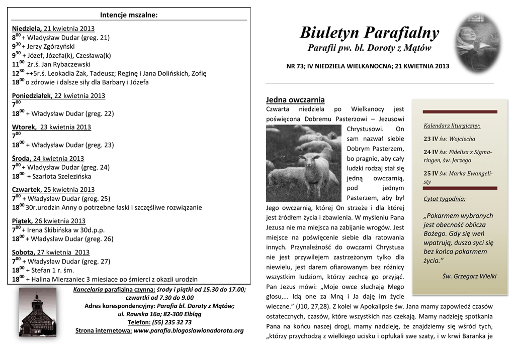 Intencje mszalne: Niedziela, 21 kwietnia 2013 800 + Władysław Dudar (greg. 21) 930 + Jerzy Zgórzyński 930 + Józef, Józefa(k), Czesława(k) 1100 2r.ś. Jan Rybaczewski 1230 ++5r.ś. Leokadia Żak, Tadeusz; Reginę i Jana Dolińskich, Zofię 1800 o zdrowie i dalsze siły dla Barbary i Józefa Poniedziałek, 22 kwietnia 2013 700 1800 + Władysław Dudar (greg. 22) Wtorek, 23 kwietnia 2013 700 1800 + Władysław Dudar (greg. 23) Środa, 24 kwietnia 2013 700 + Władysław Dudar (greg. 24) 1800 + Szarlota Szelezińska Czwartek, 25 kwietnia 2013 700 + Władysław Dudar (greg. 25) 1800 30r.urodzin Anny o potrzebne łaski i szczęśliwe rozwiązanie Piątek, 26 kwietnia 2013 700 + Irena Skibińska w 30d.p.p. 1800 + Władysław Dudar (greg. 26) Sobota, 27 kwietnia 2013 700 + Władysław Dudar (greg. 27) 1800 + Stefan 1 r. śm. 1800 + Halina Mierzaniec 3 miesiące po śmierci z okazji urodzin Kancelaria parafialna czynna: środy i piątki od 15.30 do 17.00; czwartki od 7.30 do 9.00 Adres korespondencyjny: Parafia bł. Doroty z Mątów; ul. Rawska 16a; 82-300 Elbląg Telefon: (55) 235 32 73 Strona internetowa: www.parafia.blogoslawionadorota.org Biuletyn Parafialny Parafii pw. bł. Doroty z Mątów NR 73; IV NIEDZIELA WIELKANOCNA; 21 KWIETNIA 2013 Jedna owczarnia Czwarta niedziela po Wielkanocy jest poświęcona Dobremu Pasterzowi – Jezusowi Kalendarz liturgiczny: Chrystusowi. On 23 IV św. Wojciecha sam nazwał siebie Dobrym Pasterzem, 24 IV św. Fidelisa z Sigmabo pragnie, aby cały ringen, św. Jerzego ludzki rodzaj stał się 25 IV św. Marka Ewangelijedną owczarnią, sty pod jednym Pasterzem, aby był Cytat tygodnia: Jego owczarnią, której On strzeże i dla której „Pokarmem wybranych jest źródłem życia i zbawienia. W myśleniu Pana jest obecność oblicza Jezusa nie ma miejsca na zabijanie wrogów. Jest Bożego. Gdy się weń miejsce na poświęcenie siebie dla ratowania wpatrują, dusza syci się innych. Przynależność do owczarni Chrystusa bez końca pokarmem nie jest przywilejem zastrzeżonym tylko dla życia.” niewielu, jest darem ofiarowanym bez różnicy Św. Grzegorz Wielki wszystkim ludziom, którzy zechcą go przyjąć. Pan Jezus mówi: „Moje owce słuchają Mego głosu,... Idą one za Mną i Ja daję im życie wieczne.” (J10, 27,28). Z kolei w Apokalipsie św. Jana mamy zapowiedź czasów ostatecznych, czasów, które wszystkich nas czekają. Mamy nadzieję spotkania Pana na końcu naszej drogi, mamy nadzieję, że znajdziemy się wśród tych, „którzy przychodzą z wielkiego ucisku i opłukali swe szaty, i w krwi Baranka je wybielili.”(Ap 7,9d), i którym żal, smutek „i każdą łzę otrze Bóg z ich oczu.” (Ap 7,17d). W tych słowach jest warunek, który musimy spełnić, aby należeć do Dobrego Pasterza. Czy słyszymy głos naszego Zbawiciela? Jeśli przyjmujemy i wypełniamy Ewangelię, jeśli zważamy na głos sumienia, na głos natchnień wewnętrznych, jeśli wprowadzamy te głosy w życie i w czyn, to znaczy, że idziemy za naszym Dobrym Pasterzem z coraz większą wiernością i gorliwością. To także znaczy, że należymy do Jezusa, a należeć do Jezusa, to należeć do Jego Ojca. I wtedy żadne potęgi świata nie są w stanie wyrwać człowieka z rąk Boga. W nich zawsze jest bezpieczny. Tylko sam człowiek dobrowolnie może uciec z tych rąk. Zło o tym wie i wciąż kusi, by człowiek się na to zdecydował. Zło nie wyrwie, ale może skusić. Idźmy więc za Dobrym Pasterzem, który jest źródłem naszej radości, który oddał życie za każdego z nas, za wszystkich ludzi na świecie. Jego owczarnia jest przestrzenią otwartą dla wszystkich, którzy tam chcą wejść, a Jego Serce jest „bramą owiec” – kto godzi się wejść przez tę bramę, zostanie przyjęty i znajdzie zbawienie. Bóg Ojciec czuwa nad nami, Jezus Chrystus chroni nas w jedności z Ojcem, gdyż, jak sam powiedział: „Ja i Ojciec jedno jesteśmy.” (J 10,30). Święci znani… i nie znani Św. Marek Ewangelista Marek był uczniem św. Piotra. Prawdopodobnie zaraz po zesłaniu Ducha Świętego św. Piotr udzielił św. Markowi Chrztu świętego. Dlatego nazywa go swoim synem (1 P 5, 13) Marek towarzyszył Barnabie i Pawłowi w podróży do Antiochii, a potem w pierwszej podróży na Cypr. Kiedy zaś Paweł chciał iść w głąb małej Azji przez wysokie góry Tauru, Marek się sprzeciwił, co bardzo rozgniewało Apostoła Narodów. Marek nie czuł się zdolny ponosić trudów tak uciążliwej pieszej wyprawy i dlatego w roku 49 w Pergo zawrócił (Dz 12, 25; 13, 13). Kiedy Paweł wybierał się z Barnabą w swą drugą podróż apostolską, Barnaba chciał zabrać ze sobą Marka, ale Apostoł Narodów się nie zgodził. Wtedy Barnaba opuścił Pawła, tak że ten odtąd sam w towarzystwie św. Łukasza Ewangelisty i innych odbywał swoje apostolskie podróże. Razem wówczas Barnaba i Marek udali się na Cypr. Była to wyspa rodzinna Barnaby, a być może, że również św. Marka (Dz 15, 35-40). W kilkanaście lat potem, w roku 61 widzimy ponownie św. Marka przy Pawle w Rzymie. Pisze o tym sam Apostoł w Liście do Kolosan i do Filemona (Kol 4, 10; Flm 24). Możliwe, że Marek wybierał się wtedy, wysłany przez św. Pawła, do wspomnianych adresatów, gdyż Apostoł Narodów żąda dla niego gościnnego przyjęcia. Nie wiemy nic pewnego o dalszych losach jego życia. Według tradycji miał być założycielem gminy chrześcijańskiej w Aleksandrii i jej pierwszym biskupem. Tam również miał ponieść śmierć męczeńską za panowania cesarza Nerona. Inni przesuwają słusznie datę jego śmierci do czasów cesarza Trajana (98-117). Odnośnie męczeństwa św. Marka nie mamy żadnych danych. Zastanawia, że o śmierci męczeńskiej św. Marka nic nie wie św. Hieronim. Tym większe zastrzeżenie budzi legenda, wg której Marek miał głosić Ewangelię w Akwilei, a nawet w Lorch (Austria). Święty Marek znał doskonale język aramajski i grecki.