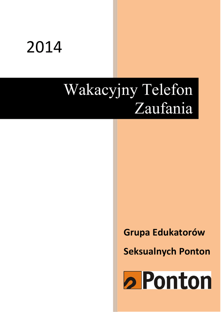 2014 Wakacyjny Telefon Zaufania Grupa Edukatorów Seksualnych Ponton Wakacyjny Telefon Zaufania Grupy Ponton Sprawozdanie z dyżurów w lipcu i sierpniu 2014 Z dniem 31 sierpnia, zakończyła się tegoroczna edycja Wakacyjnego Telefonu Zaufania Grupy Edukatorów Seksualnych Ponton, zorganizowana dzięki pomocy finansowej Ministerstwa Edukacji Narodowej. Wakacyjna infolinia Pontonu działała w tym roku po raz dziewiąty, a młodzież, podobnie jak w ubiegłych latach, mogła zadawać nam pytania dzwoniąc lub wysyłając SMS-y. W ciągu dwóch miesięcy wakacji edukatorki seksualne odpowiedziały na ponad 560 pytań. Podczas dwugodzinnego dyżuru średnio 10 osób otrzymywało poradę oraz wsparcie. Telefon zaufania jest anonimowy, więc nie wszystkie kontaktujące się z nami osoby podały swój wiek, jednak można odnieść wrażenie, że dominującą grupą wiekową spośród osób korzystających z naszej pomocy są nastolatki w przedziale 14 -18 lat. Podział pytań według kategorii tematycznych: Kategoria Seksualność Zdrowie/fizjologia Antykoncepcja Inne Relacje Ciąża Asertywność Przemoc SUMA Liczba pytań 163 119 96 90 50 36 ( w tym 3 zgłoszenia ciąży) 7 0 561 Podobnie jak w poprzednich edycjach Telefonu Zaufania szczególnym zainteresowaniem cieszyły się tematy związane z seksualnością (163 pytania), zdrowiem/fizjologią (119 pytań) oraz antykoncepcją (96 pytań). W powyższych kategoriach otrzymaliśmy najwięcej zgłoszeń. Nie jest to dla nas zaskoczeniem, ponieważ kwestie związane z samym seksem oraz z antykoncepcją należą do najrzadziej poruszanych na lekcjach Wychowania do Życia w Rodzinie, a w wielu domach stanowią temat tabu. Seksualność i antykoncepcja Młodzież w naturalny sposób interesuje się swoją seksualnością. Obserwujemy ogromny głód wiedzy, który w miarę możliwości staramy się zaspokoić zgodnie z merytoryczną wiedzą. Dementujemy mity i stereotypy, które, jak wiemy często wynikają z tego, że podstawowym źródłem wiedzy młodych ludzi na temat seksu są Internet i pornografia. To bardzo niekorzystna sytuacja dla nastolatka, kiedy pornografia staje się głównym, jeśli nie jedynym źródłem wiedzy o seksie. Młodzi ludzie często nie są w stanie odróżnić fikcji kreowanej przez przemysł pornograficzny od rzeczywistości; porównują się z aktorami, popadają w kompleksy na tle swojego wyglądu, ze szczególną koncentracją na narządach płciowych. Chłopcy są zaniepokojeni rozmiarami swojego penisa, dziewczynki wyglądem piersi, czy tym, że mają owłosienie łonowe (inaczej niż aktorki filmów porno). Młodzi ludzie obojga płci są przekonani, że już pierwszy stosunek może trwać godzinami, a dziewczyna powinna mieć wiele orgazmów z rzędu. Poważnym problemem jest również to, że pornografia ukazuje najczęściej przedmiotowy stosunek do kobiet i seksu - niezwykle niepokojące jest, że nawet bardzo młode dziewczyny starają się w jakiś sposób wejść w rolę seksualnego wampa albo uległej lolitki, bez świadomości, że naśladują wzorce kreowane przez pornografię. Dziewczęta często nie myślą o sobie, swoich potrzebach i emocjach, a o tym jak zrobić wrażenie na chłopaku. Cieszymy się, kiedy młode osoby zwracają się do nas ze swoimi wątpliwościami – mamy okazję sprostować błędne przekonania i wskazać młodym ludziom inne źródła wiedzy, niezafałszowujące obrazu seksu jak robi to pornografia. Przykładowe pytania w tej kategorii: - Jak długo można się kochać za jednym razem? - Czy są jakieś metody na powiększenie penisa? - Mam 16 lat i chcę zapytać, czy to normalne, że w moim miejscu intymnym rosną włosy, na filmie w Internecie widziałam, że kobiety nie są tak owłosione. Wstydzę się tego. - Widziałem nie raz seks na filmie i ogarnął mnie lęk przed pierwszym razem, mam obawy, że nie będę potrafił temu sprostać i na zawsze pozostanę prawiczkiem. - Jak zadowolić chłopaka? On często ogląda erotykę i chciałabym, żeby nie rozczarował się, kiedy pójdzie do łóżka ze mną. W tym roku szczególnie zaniepokoiły nas zgłoszenia od bardzo młodych dziewcząt (poniżej 15 roku życia) deklarujących chęć rozpoczęcia współżycia seksualnego. Powodem najczęściej było uczucie do chłopaka i obawa przed jego rozczarowaniem. Dyżurantki starały się odwieść dziewczynki od tej decyzji m.in. wyjaśniając jak wygląda w tym zakresie polskie prawo, które nie uznaje współżycia poniżej 15 r.ż. Otrzymaliśmy także zgłoszenie od brata 13-latki, który znalazł u niej prezerwatywy i prosił o poradę jak porozmawiać z siostrą o tym, aby nie rozpoczynała jeszcze współżycia seksualnego oraz zgłoszenie od ojca, który pytał jak o seksie porozmawiać z 14 - letnią córką. Zwracały się do nas również osoby zaniepokojone brakiem pociągu do płci przeciwnej oraz takie, które wiedziały już o sobie, że nie są heteroseksualne i szukały wsparcia, na które nie mogły liczyć w swoim otoczeniu. Bardzo wiele smsów i telefonów otrzymaliśmy w obszarze antykoncepcji. W tej kategorii dominowały pytania związane z tym, jak właściwie zabezpieczyć się przed ciążą; widoczne były również silne lęki związane z ryzykiem zajścia w ciążę. Część pytań wskazuje na niefrasobliwość w podejmowaniu kontaktów seksualnych bez zabezpieczenia, część na braki w podstawowej wiedzy o mechanizmie zapłodnienia. W rezultacie, podczas jednego dyżuru otrzymywaliśmy zarówno zapytania wskazujące na faktyczne ryzyko ciąży, jak i na bezpodstawny lęk. Otrzymaliśmy również trzy zgłoszenia ciąży i prośby o poradę oraz wsparcie w tej sytuacji. Przykłady pytań - Kochaliśmy się z chłopakiem, ale nie użyliśmy żadnego zabezpieczenia, on starał się uważać, ale teraz się niepokoimy, jak duże jest ryzyko ciąży? - Proszę mi odpowiedzieć, czy jeśli korzystałam z łazienki po swoim koledze, czy jest jakakolw