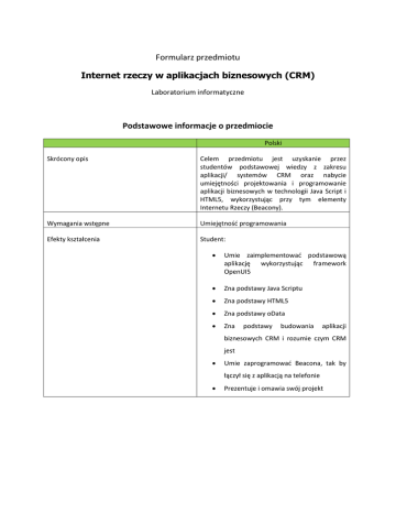 Formularz przedmiotu Internet rzeczy w aplikacjach biznesowych