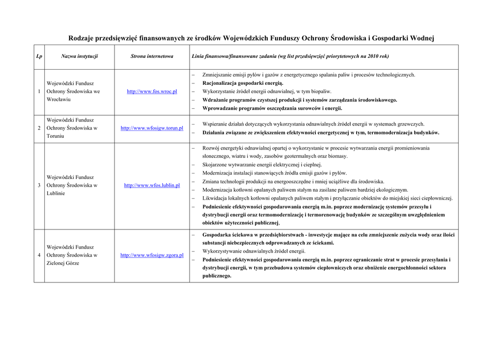 Rodzaje przedsięwzięć finansowanych ze środków Wojewódzkich Funduszy Ochrony Środowiska i Gospodarki Wodnej Lp 1 2 3 4 Nazwa instytucji Wojewódzki Fundusz Ochrony Środowiska we Wrocławiu Wojewódzki Fundusz Ochrony Środowiska w Toruniu Wojewódzki Fundusz Ochrony Środowiska w Lublinie Wojewódzki Fundusz Ochrony Środowiska w Zielonej Górze Strona internetowa http://www.fos.wroc.pl http://www.wfosigw.torun.pl http://www.wfos.lublin.pl http://www.wfosigw.zgora.pl Linia finansowa/finansowane zadania (wg list przedsięwzięć priorytetowych na 2010 rok) − Zmniejszanie emisji pyłów i gazów z energetycznego spalania paliw i procesów technologicznych. − Racjonalizacja gospodarki energią. − Wykorzystanie źródeł energii odnawialnej, w tym biopaliw. − Wdrażanie programów czystszej produkcji i systemów zarządzania środowiskowego. − Wprowadzanie programów oszczędzania surowców i energii. − Wspieranie działań dotyczących wykorzystania odnawialnych źródeł energii w systemach grzewczych. − Działania związane ze zwiększeniem efektywności energetycznej w tym, termomodernizacja budynków. − Rozwój energetyki odnawialnej opartej o wykorzystanie w procesie wytwarzania energii promieniowania słonecznego, wiatru i wody, zasobów geotermalnych oraz biomasy. − Skojarzone wytwarzanie energii elektrycznej i cieplnej. − Modernizacja instalacji stanowiących źródła emisji gazów i pyłów. − Zmiana technologii produkcji na energooszczędne i mniej uciążliwe dla środowiska. − Modernizacja kotłowni opalanych paliwem stałym na zasilane paliwem bardziej ekologicznym. − Likwidacja lokalnych kotłowni opalanych paliwem stałym i przyłączanie obiektów do miejskiej sieci ciepłowniczej. − Podniesienie efektywności gospodarowania energią m.in. poprzez modernizację systemów przesyłu i dystrybucji energii oraz termomodernizację i termorenowację budynków ze szczególnym uwzględnieniem obiektów użyteczności publicznej, − Gospodarka ściekowa w przedsiębiorstwach - inwestycje mające na celu zmniejszenie zużycia wody oraz ilości substancji niebezpiecznych odprowadzanych ze ściekami. − Wykorzystywanie odnawialnych źródeł energii. − Podniesienie efektywności gospodarowania energią m.in. poprzez ograniczanie strat w procesie przesyłania i dystrybucji energii, w tym przebudowa systemów ciepłowniczych oraz obniżenie energochłonności sektora publicznego. Lp Nazwa instytucji Strona internetowa 5 Wojewódzki Fundusz Ochrony Środowiska w Łodzi http://www.wfosigw.lodz.pl Wojewódzki Fundusz Ochrony Środowiska w Krakowie http://www.wfos.krakow.pl 6 7 8 9 Wojewódzki Fundusz Ochrony Środowiska we Warszawie Wojewódzki Fundusz Ochrony Środowiska w Opolu Wojewódzki Fundusz Ochrony Środowiska w Rzeszowie Wojewódzki Fundusz 10 Ochrony Środowiska w Białymstoku http://www.wfosigw.pl http://www.wfosigw.opole.pl Linia finansowa/finansowane zadania (wg list przedsięwzięć priorytetowych na 2010 rok) − Wykorzystanie odnawialnych źródeł energii − Ograniczenie niskiej emisji oraz racjonalizacja zużycia energii − Modernizacja układów technologicznych z wprowadzaniem nowoczesnych technik spalania paliw. − Ochrona powietrza – ograniczanie emisji. − Termomodernizacja. − Zadania i programy dotyczące wykorzystania odnawialnych źródeł energii. − Modernizacja systemów cieplnych w połączeniu z likwidacją lokalnych kotłowni o niskiej sprawności i złym stanie technicznym. − Wprowadzanie nowych technologii w zakładach przemysłowych mających na celu ograniczanie emisji zanieczyszczeń do powietrza. − Podniesienie efektywności gospodarowania energią, poprzez ograniczenie strat przesyłowych, ograniczenie jej zużycia, w tym termorenowacja obiektów. − Termomodernizaja budynków. − Wykorzystanie odnawialnych źródeł energii. − Modernizacja sieci ciepłowniczych. − Modernizacja instalacji przemysłowych spalania paliw. http://www.wfosigw.rzeszow.pl − Realizacja przedsięwzięć dotyczących odnawialnych źródeł energii. − http://www.wfosigw.bialystok.pl − Energetyczne wykorzystanie odnawialnych źródeł energii, w tym produkcji biopaliw. Zmniejszenie zużycia energii cieplnej i elektrycznej, w tym zadania związane z termomodernizacją budynków użyteczności publicznej i modernizacją oświetlenia ulic. Lp Nazwa instytucji Wojewódzki Fundusz 11 Ochrony Środowiska w Gdańsku Wojewódzki Fundusz 12 Ochrony Środowiska w Katowicach Wojewódzki Fundusz 13 Ochrony Środowiska w Kielcach Strona internetowa Linia finansowa/finansowane zadania (wg list przedsięwzięć priorytetowych na 2010 rok) − http://www.wfosigw-gda.pl http://www.wfosigw.katowice.pl paliw oraz zmianę rodzaju i jakości paliw. − Wspieranie wykorzystania odnawialnych źródeł energii. − Wdrażanie nowoczesnych technologii w przemyśle, energetyce i gospodarce komunalnej. − Wdrażanie projektów wysokosprawnych i efektywnych układów lub systemów ciepłowniczych. − Budowa lub zmiana systemu ogrzewania na bardziej efektywny ekologicznie i energetycznie. − Modernizacja układów technologicznych z wprowadzaniem nowoczesnych technik spalania paliw. − Poprawa efektywności energetycznej źródeł, przesyłu i wykorzystania ciepła. − Wykorzystanie metanu z kopalń węgla kamiennego. − Wdrażanie projektów z zastosowaniem odnawialnych i alternatywnych źródeł energii. − Wdrażanie projektów nowoczesnych, efektywnych i przyjaznych środowisku układów technologicznych, przesyłu i użytkowania energii. − Termoizolacja budynków w zakresie wynikającym z audytu energetycznego. − Wdrażanie programów ograniczenia zużycia energii ze źródeł konwencjonalnych. − Przedsięwzięcia zmierzające do ograniczenia emisji zanieczyszczeń gazowych i pyłowych do atmosfery poprzez przebudowę i unowocześnianie technologii produkcji, technologii spalania paliw. − Przebudowa lub wykonanie nowych inst