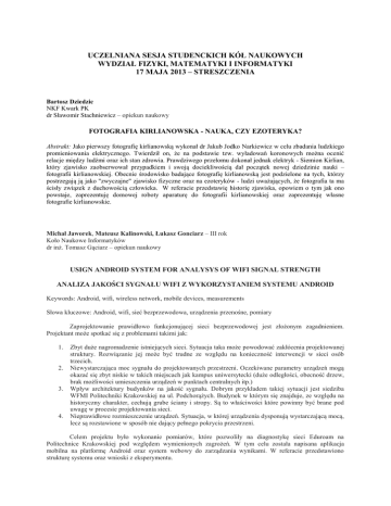 UCZELNIANA SESJA STUDENCKICH KÓŁ NAUKOWYCH WYDZIAŁ FIZYKI, MATEMATYKI I INFORMATYKI 17 MAJA 2013 – STRESZCZENIA Bartosz Dziedzic NKF Kwark PK dr Sławomir Stachniewicz – opiekun naukowy FOTOGRAFIA KIRLIANOWSKA - NAUKA, CZY EZOTERYKA? Abstrakt: Jako pierwszy fotografię kirlianowską wykonał dr Jakub Jodko Narkiewicz w celu zbadania ludzkiego promieniowania elektrycznego. Twierdził on, że na podstawie tzw. wyładowań koronowych można ocenić relacje między ludźmi oraz ich stan zdrowia. Prawdziwego przełomu dokonał jednak elektryk - Siemion Kirlian, który zjawisko zaobserwował przypadkiem i swoją dociekliwością dał początek nowej dziedzinie nauki – fotografii kirlianowskiej. Obecnie środowisko badające fotografię kirlianowską jest podzielone na tych, którzy postrzegają ją jako "zwyczajne" zjawisko fizyczne oraz na ezoteryków - ludzi uważających, że fotografia ta ma ścisły związek z duchowością człowieka. W referacie przedstawię historię zjawiska, opowiem o tym jak ono powstaje, zaprezentuję domowej roboty aparaturę do fotografii kirlianowskiej oraz zaprezentuję własne fotografie kirlianowskie. Michał Jaworek, Mateusz Kalinowski, Łukasz Gonciarz – III rok Koło Naukowe Informatyków dr inż. Tomasz Gąciarz – opiekun naukowy USIGN ANDROID SYSTEM FOR ANALYSYS OF WIFI SIGNAL STRENGTH ANALIZA JAKOŚCI SYGNAŁU WIFI Z WYKORZYSTANIEM SYSTEMU ANDROID Keywords: Android, wifi, wireless network, mobile devices, measurements Słowa kluczowe: Android, wifi, sieć bezprzewodowa, urządzenia przenośne, pomiary Zaprojektowanie prawidłowo funkcjonującej sieci bezprzewodowej jest złożonym zagadnieniem. Projektant może spotkać się z problemami takimi jak: 1. 2. 3. 4. Zbyt duże nagromadzenie istniejących sieci. Sytuacja taka może powodować zakłócenia projektowanej struktury. Rozwiązanie jej może być trudne ze względu na konieczność interwencji w sieci osób trzecich. Niewystarczająca moc sygnału do projektowanych przestrzeni. Oczekiwane parametry urządzeń mogą okazać się zbyt niskie w takich miejscach jak kampus uniwersytecki (duże odległości, obecność drzew, brak możliwości umieszczenia urządzeń w punktach centralnych itp.) Wpływ architektury budynków na jakość sygnału. Dobrym przykładem takiej sytuacji jest siedziba WFMI Politechniki Krakowskiej na ul. Podchorążych. Budynek w którym się znajduje, ze względu na historyczny charakter, cechują grube ściany i stropy. Są to właściwości które powinny być brane pod uwagę w procesie projektowania sieci. Nieprawidłowe rozmieszczenie urządzeń. Sytuacja, w której urządzenia dysponują wystarczającą mocą, lecz są rozstawione w sposób nie dający pełnego pokrycia przestrzeni. Celem projektu było wykonanie pomiarów, które pozwoliły na diagnostykę sieci Eduroam na Politechnice Krakowskiej pod względem wymienionych zagrożeń. W tym celu została napisana aplikacja mobilna na platformę Android oraz system webowy do zarządzania wynikami. W referacie przedstawiono strukturę systemu oraz wnioski z eksperymentu. Agnieszka Karpińska – III rok, I stopień Koło Naukowe Matematyków dr Marcin Skrzyński – opiekun naukowy THE GAME OF HEX GRA ,,HEX'' Keywords: game of Hex, swap rule, Hex theorem, planar graph. Słowa-klucze: gra Hex, ,,swap rule'', twierdzenie o heksie, graf płaski. Abstract: In the talk, we will present the game of Hex, invented independently by two mathematicians: Piet Hein (1942), and John Nash (1948). Hex is a simple board game with some interesting mathematical aspects. The Hex board is diamond-shaped and divided into hexagonal cells. The two players alternately place stones on the board. The game has been won by the player who has formed a connected path of his or her stones linking the opposite sides of the board. In the talk, we will prove a version of the Hex theorem, which states that a Hex game cannot end in a tie. The talk is based mainly on D. Gale's paper ,,The game of Hex and the Brouwer fixed-point theorem'' Streszczenie: W referacie zaprezentujemy grę ,,Hex'', którą stworzyli -- niezależnie od siebie -- dwaj matematycy: Piet Hein (1942) oraz John Nash (1948). Jest to prosta gra planszowa, mająca jednak aspekty ciekawe z matematycznego punktu widzenia. Gra toczy się na romboidalnej planszy złożonej z sześciokątnych pól. Dwaj gracze na przemian kładą na planszy kamienie. Wygrywa ten, który ułoży ze swoich kamieni ścieżkę łączącą przeciwległe krawędzie planszy. W referacie udowodnimy pewną wersję twierdzenia o heksie, mówiącego, że partia tej gry nie może się zakończyć remisem. Referat jest oparty głównie na artykule D. Gale'a ,,The game of Hex and the Brouwer fixed-point theorem''. Jakub Kabat – III rok, I stopień Koło Naukowe Matematyków dr Marcin Skrzyński – opiekun naukowy THE GAME OF HEX AND THE BROUWER FIXED-POINT THEOREM HEX A TWIERDZENIE BROUWERA O PUNKCIE STAŁYM Keywords: game of Hex, Hex theorem, n-dimensional Hex board, proof of the Brouwer fixed-point theorem. Słowa-klucze: gra ,,Hex'', twierdzenie o heksie, n-wymiarowa plansza do heksa, dowód twierdzenia Brouwera o punkcie stałym. Abstract: The talk is a continuation of ''The game of Hex''. It consists of two parts. In the first part, we will demonstrate how to use the game of Hex to prove the two-dimensional Brouwer fixed-point theorem. In the second part, we will present the n-person Hex and its relationship to the general Brouwer fixed-point theorem. The talk is based on D. Gale's paper ''The game of Hex and the Brouwer fixed-point theorem''. Streszczenie: Referat ten jest kontynuacją referatu ,,Gra Hex''. Dzieli się on na dwie części. W pierwszej z nich pokażemy, jak dowodzi się za pomocą heksa dwuwymiarową wersję twierdzenia Brouwera o punkcie stałym. W drugiej części omówimy n-osobową grę w heksa i jej związek z ogólną wersją twierdzenia Brouwera. Referat jest oparty na artykule D. 