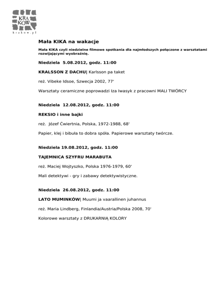 Mała KIKA na wakacje Mała KIKA czyli niedzielne filmowe spotkania dla najmłodszych połączone z warsztatami rozwijającymi wyobraźnię. Niedziela 5.08.2012, godz. 11:00 KRALSSON Z DACHU| Karlsson pa taket reż. Vibeke Idsoe, Szwecja 2002, 77' Warsztaty ceramiczne poprowadzi Iza Iwasyk z pracowni MALI TWÓRCY Niedziela 12.08.2012, godz. 11:00 REKSIO i inne bajki reż. Józef Ćwiertnia, Polska, 1972-1988, 68' Papier, klej i bibuła to dobra spóła. Papierowe warsztaty twórcze. Niedziela 19.08.2012, godz. 11:00 TAJEMNICA SZYFRU MARABUTA reż. Maciej Wojtyszko, Polska 1976-1979, 60' Mali detektywi - gry i zabawy detektywistyczne. Niedziela 26.08.2012, godz. 11:00 LATO MUMINKÓW| Muumi ja vaarallinen juhannus reż. Maria Lindberg, Finlandia/Austria/Polska 2008, 70' Kolorowe warsztaty z DRUKARNIĄ KOLORY Powered by TCPDF (www.tcpdf.org)