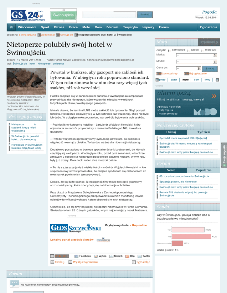 Echo Dziennik Gazeta o sG Nowa Nowiny Kurier cTygodnik cki MM M Moje ki zesna soje w Koszali Pomorza Szczeci Moje Miasto Dnia Trybuna Poranny Lubuska Pomorska Ostro Bydgoszcz Lublin Pozna Silesia Szczecin Warszawa Wroc Opolska ła Gazeta Wspó łę Moje Miasto Kraków ó źŁ ń Moje Miasto Trójmiasto d reklama Pogoda Świnoujście Wiadomości Jesteś tu: Strona główna Sport Biznes Wiadomości Wtorek 15.03.2011 Praca Świnoujście Moto Dom Zdrowie Turystyka Imprezy Ogłoszenia Nietoperze polubiły swój hotel w Świnoujściu Moto Nietoperze polubiły swój hotel w Świnoujściu dodano: 15 marca 2011, 9:15 Forum Znajdź: n i samochód n j k l m j części n k l m j motocykl k l m Autor: Hanna Nowak-Lachowska, [email protected] Marka: -- 6 Model: -- 6 Cena do: -- tagi: Świnoujście hotel Nietoperze zwierzęta Powstał w bunkrze, aby gazoport nie zakłócił ich bytowania. W ubiegłym roku poprawiono standard. W tym roku zimowało w nim dwa razy więcej tych ssaków, niż rok wcześniej. Mroczek późny sfotografowany w hoteliku dla nietoperzy, który naukowcy zrobili w poniemieckim schronie. (fot. Magdalena Dzięgielewska) Przeczytaj więcej Nietoperze tu stadami. Mogą mie ć wściekliznę W Świnoujściu powstał hotel... dla nietoperzy Nietoperze w świnoujskim bunkrze mają teraz lepiej załóż motosklep imprezy bazar 6 dodaj ogłoszenie moto dom firmy reklama Hotelik znajduje się w poniemieckim bunkrze. Powstał jako rekompensata przyrodnicza dla nietoperzy, które wcześniej mieszkały w różnych fortyfikacjach blisko powstającego gazoportu. Istniała obawa, że terminal LNG może zakłócić ich bytowanie. Stąd pomysł hoteliku. Nietoperze pojawiały się w tym schronie już wcześniej, choć nie było ich dużo. W ubiegłym roku poprawiono warunki dla bytowania tych ssaków. Najczęściej czytane – Podnieśliśmy kategorię hoteliku – żartuje dr Wojciech Kowalski, który odpowiada za nadzór przyrodniczy z ramienia Polskiego LNG, inwestora gazoportu. Dzisiaj Tydzień Sprzedali mecz za ponad 100 zł [zdjęcia] – Przede wszystkim ograniczyliśmy cyrkulację powietrza, co podniosło wilgotność wewnątrz obiektu. To bardzo ważne dla hibernacji nietoperzy. Świnoujście: W marcu wmurują kamień pod gazoport Dodatkowo postawiono w bunkrze specjalne ścianki z otworami, do których czepiają się nietoperze. W ubiegłym roku, przed tymi zmianami, w bunkrze zimowały 2 osobniki z najbardziej pospolitego gatunku nocków. W tym roku były już cztery. Dwa nocki rude i dwa mroczki późne. – To nie są jeszcze jakieś wielkie ilości – mówi dr Wojciech Kowalski. – Ale stuprocentowy wzrost potwierdza, że miejsce spodobało się nietoperzom i z roku na rok powinno ich tam przybywać. Świnoujście: Hordy psów biegają po mieście Forum Nowe Popularne 66. rocznica bombardowania Świnoujścia Dodaje, że są duże szanse, iż następnej zimy może nastąpić gwałtowny wzrost nietoperzy, które zdecydują się na hibernacje w hoteliku. Sprzątają piasek, ale niemrawo Przy okazji dr Magdalena Dzięgielewska z Zachodniopomorskiego Uniwersytety Technologicznego przeprowadziła również monitoring innych obiektów fortyfikacyjnych pod kątem obecności w nich nietoperzy. Renata Pliś dostanie więcej, bo promuje Świnoujście Świnoujście: Hordy psów biegają po mieście Okazało się, że tej zimy najwięcej nietoperzy hibernowało w Forcie Gerharda. Stwierdzono tam 25 różnych gatunków, w tym najcenniejszy nocek Natterera. Sonda Czy w Świnoujściu policja dobrze dba o bezpieczeństwo mieszkańców? reklama Czytaj e-wydanie » Kup online Lokalny portal przedsiębiorców Liczba głosów: 51. Dodaj do Facebook Drukuj Wyślij znajomemu Forum Na razie brak komentarzy, twój może być pierwszy. Wykop Śledzik Blip Twitter Zgłoś błąd praca Najnowsze wiadomości Nowe! Nietoperze polubiły swój hotel w Świnoujściu Nowe! Miss Czytelników Głosu. Zagłosuj na swoj ą faworytkę [zdjęcia] Informacje z Twojego miasta Nowe! Ukarać tych, co to zrobili Wszystkie Stargard Szczeciński czy Stargard? Ostatni dzień na głosowanie 6 Nowe! Ukarać tych, co to zrobili W Niemczech kupujemy taniej (i lepiej) cukier i... telewizory Nocą i w dni świąteczne w Policach do Mediki Więcej wiadomości » Czekamy na wydobycie wraku z Odry Policja apeluje: Uwaga na zwierzęta [film] Jechał kradzionym autem. Wpadł podczas kontroli Więcej wiadomości » Moto Dom Ford Focus Szczecinek - Olej napędowy (diesel) 2000 10900.00 Praca Mieszkanie Szczecin Żelechowa, Grzymińska, 4 pokoje, 100 m2 Dodge Caravan Świdwin Benzyna + LPG 2004 21000.00 KONSULTANT, SPRZEDAWCA Mieszkanie Koszalin, Karłowicza, 3 pokoje, 62 m2 Mieszkanie Szczecin, Świ ętoborzyców, 2 pokoje, 51 m2 Peugeot 405 Gryfice Benzyna 1992 1800.00 Bazar Katalog firm kupie spawarke Agencja Jasiński Nieruchomości skanerzysta Kierownik budowy domków jednorodzinnych Odlewnik,Tokarz,Oczyszczacz mechaniczny Kierownik budowy domków jednorodzinnych Odlewnik,Tokarz,Oczyszczacz mechaniczny domek biesiadny Komis Eska Szymon Pietruszkiewicz "CEZAR" Auto-Handel Blacharstwo-Lakiernictwo RESIDENCE-NIERUCHOMOŚCI Praca BMW 525 Koszalin - Olej napędowy (diesel) 1997 16600.00 Mieszkanie Darłowo, Wyspiańskiego, 3 pokoje, 46 m2 Saab 9-5 Koszalin - Olej napędowy (diesel) 2004 29900.00 Kawalerka Koszalin Śródmieście, Zwyci ęstwa, 38 m2 Kierownik RobA3t Drogowych Sanatorium MonaLisa Promocje Sprawdź czy Twoja domena jest dostępna! Miałeś wypadek komunikacyjny? Sprawdź jakie otrzymasz odszkodowanie! Kredyt hipoteczny Odzyskaj 800 funtów podatku za pracę za granicą Masz Volkswagena? Masz 15% zniżki na OC i AC Kontakt z reklamą » Kontakt z redakcją » Kontakt z marketingiem » Zadzwo ń 91 48 13 333 Napisz maila: [email protected] Napisz na Gadu-Gadu: Napisz na Skype: 760530 akcjags Serwisy powiatowe Serwisy tematyczne Gryfice Szczecin Stargard Świnoujście Goleniów Kamień Pomorski Police Zachodniopomorskie Polska i Św