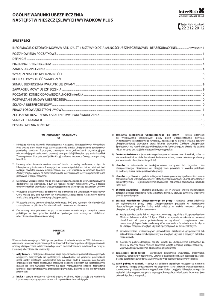 OGÓLNE WARUNKI UBEZPIECZENIA NASTĘPSTW NIESZCZĘŚLIWYCH WYPADKÓW PLUS InterRisk Kontakt 22 212 20 12 SPIS TREŚCI INFORMACJE, O KTÓRYCH MOWA W ART. 17 UST. 1 USTAWY O DZIAŁALNOŚCI UBEZPIECZENIOWEJ I REASEKURACYJNEJ.................rewers str. 1 POSTANOWIENIA POCZĄTKOWE����������������������������������������������������������������������������������������������������������������������������������������������������������������������������������������������������������������������� 1 DEFINICJE������������������������������������������������������������������������������������������������������������������������������������������������������������������������������������������������������������������������������������������������������������������� 1 PRZEDMIOT UBEZPIECZENIA������������������������������������������������������������������������������������������������������������������������������������������������������������������������������������������������������������������������������ 4 ZAKRES UBEZPIECZENIA��������������������������������������������������������������������������������������������������������������������������������������������������������������������������������������������������������������������������������������� 4 WYŁĄCZENIA ODPOWIEDZIALNOŚCI�������������������������������������������������������������������������������������������������������������������������������������������������������������������������������������������������������������� 5 RODZAJE I WYSOKOŚĆ ŚWIADCZEŃ���������������������������������������������������������������������������������������������������������������������������������������������������������������������������������������������������������������� 5 SUMA UBEZPIECZENIA I WARUNKI JEJ ZMIANY������������������������������������������������������������������������������������������������������������������������������������������������������������������������������������������� 9 ZAWARCIE UMOWY UBEZPIECZENIA��������������������������������������������������������������������������������������������������������������������������������������������������������������������������������������������������������������� 9 POCZĄTEK I KONIEC ODPOWIEDZIALNOŚCI InterRisk ����������������������������������������������������������������������������������������