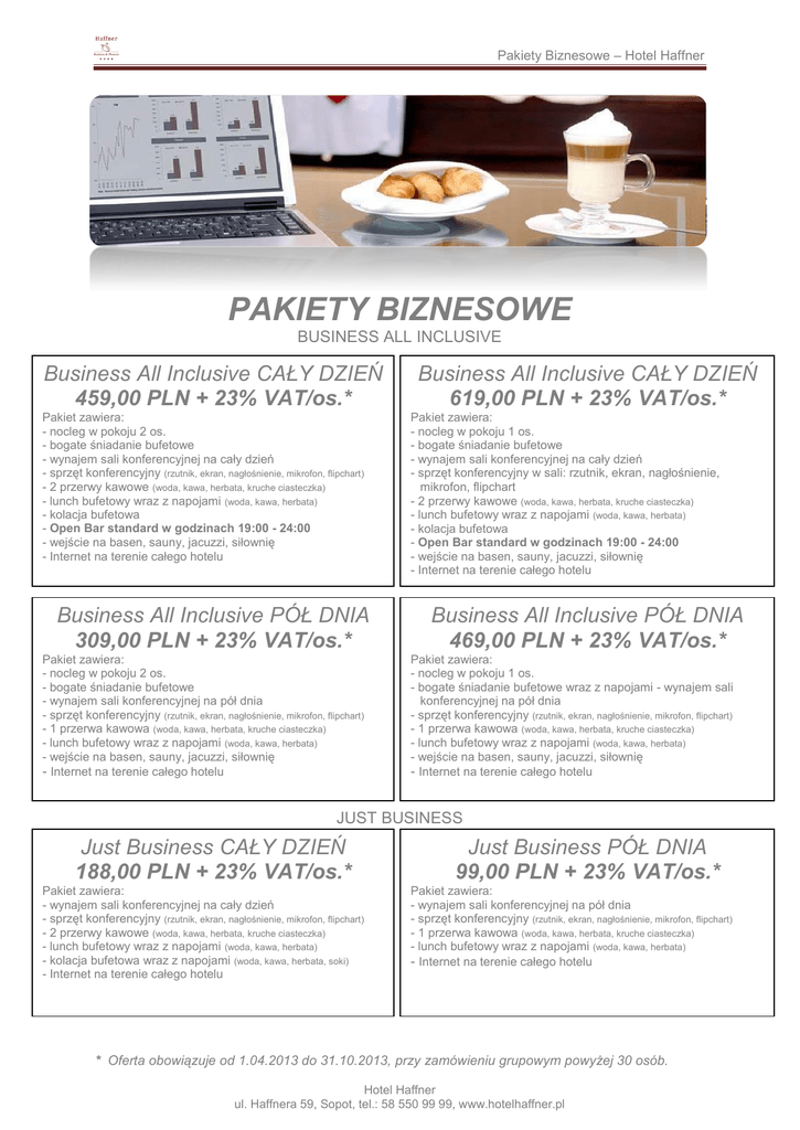 Pakiety Biznesowe – Hotel Haffner PAKIETY BIZNESOWE BUSINESS ALL INCLUSIVE Business All Inclusive CAŁY DZIEŃ 459,00 PLN + 23% VAT/os.* Pakiet zawiera: - nocleg w pokoju 2 os. - bogate śniadanie bufetowe - wynajem sali konferencyjnej na cały dzień - sprzęt konferencyjny (rzutnik, ekran, nagłośnienie, mikrofon, flipchart) - 2 przerwy kawowe (woda, kawa, herbata, kruche ciasteczka) - lunch bufetowy wraz z napojami (woda, kawa, herbata) - kolacja bufetowa - Open Bar standard w godzinach 19:00 - 24:00 - wejście na basen, sauny, jacuzzi, siłownię - Internet na terenie całego hotelu Business All Inclusive PÓŁ DNIA 309,00 PLN + 23% VAT/os.* Pakiet zawiera: - nocleg w pokoju 2 os. - bogate śniadanie bufetowe - wynajem sali konferencyjnej na pół dnia - sprzęt konferencyjny (rzutnik, ekran, nagłośnienie, mikrofon, flipchart) - 1 przerwa kawowa (woda, kawa, herbata, kruche ciasteczka) - lunch bufetowy wraz z napojami (woda, kawa, herbata) - wejście na basen, sauny, jacuzzi, siłownię - Internet na terenie całego hotelu Business All Inclusive CAŁY DZIEŃ 619,00 PLN + 23% VAT/os.* Pakiet zawiera: - nocleg w pokoju 1 os. - bogate śniadanie bufetowe - wynajem sali konferencyjnej na cały dzień - sprzęt konferencyjny w sali: rzutnik, ekran, nagłośnienie, mikrofon, flipchart - 2 przerwy kawowe (woda, kawa, herbata, kruche ciasteczka) - lunch bufetowy wraz z napojami (woda, kawa, herbata) - kolacja bufetowa - Open Bar standard w godzinach 19:00 - 24:00 - wejście na basen, sauny, jacuzzi, siłownię - Internet na terenie całego hotelu Business All Inclusive PÓŁ DNIA 469,00 PLN + 23% VAT/os.* Pakiet zawiera: - nocleg w pokoju 1 os. - bogate śniadanie bufetowe wraz z napojami - wynajem sali konferencyjnej na pół dnia - sprzęt konferencyjny (rzutnik, ekran, nagłośnienie, mikrofon, flipchart) - 1 przerwa kawowa (woda, kawa, herbata, kruche ciasteczka) - lunch bufetowy wraz z napojami (woda, kawa, herbata) - wejście na basen, sauny, jacuzzi, siłownię - Internet na terenie całego hotelu JUST BUSINESS Just Business CAŁY DZIEŃ 188,00 PLN + 23% VAT/os.* Pakiet zawiera: - wynajem sali konferencyjnej na cały dzień - sprzęt konferencyjny (rzutnik, ekran, nagłośnienie, mikrofon, flipchart) - 2 przerwy kawowe (woda, kawa, herbata, kruche ciasteczka) - lunch bufetowy wraz z napojami (woda, kawa, herbata) - kolacja bufetowa wraz z napojami (woda, kawa, herbata, soki) - Internet na terenie całego hotelu Just Business PÓŁ DNIA 99,00 PLN + 23% VAT/os.* Pakiet zawiera: - wynajem sali konferencyjnej na pół dnia - sprzęt konferencyjny (rzutnik, ekran, nagłośnienie, mikrofon, flipchart) - 1 przerwa kawowa (woda, kawa, herbata, kruche ciasteczka) - lunch bufetowy wraz z napojami (woda, kawa, herbata) - Internet na terenie całego hotelu * Oferta obowiązuje od 1.04.2013 do 31.10.2013, przy zamówieniu grupowym powyżej 30 osób. Hotel Haffner ul. Haffnera 59, Sopot, tel.: 58 550 99 99, www.hotelhaffner.pl Pakiety Biznesowe – Hotel Haffner Hotel Haffner Hotel Haffner dysponuje 8 salami konferencyjnymi. Do standardowego wyposażenia sali należy: ekran, flipchart i rzutnik folii. Sale Gdańsk, Sopot i Gdynia możemy połączyć w jedną dużą salę mogącą pomieścić w ustawieniu teatralnym 300 osób. Sale Morskie A, B i C również mogą zostać połączone. Wtedy uzyskamy sale mogącą pomieścić w ustawieniu teatralnym 80 osób. Sala VIP Bursztynowa jest samodzielną salą dla najbardziej wymagających Gości, którzy oprócz standardowego wyposażenia, potrzebują wysokiej jakości sprzętu Hi-Fi. Na jej wyposażeniu w cenie wynajmu znajduje się 42 calowy monitor plazmowy. W Sali VIP obradować może 10 osób. Naturalne oświetlenie Sali Bałtyckiej zachęca do organizowania zarówno spotkań firmowych jak i uroczystości rodzinnych. Ustawienia sal konferencyjnych Układ teatralny Układ U-shape Układ bankietowy Układ szkolny Sale konferencyjne Ilość osób Ilość osób Ilość osób Ilość osób Gdańsk 120 52 60 90 Sopot 90 40 48 72 Gdynia 70 40 36 56 Gdańsk, Sopot, Gdynia 300 80 168 180 Morska A 20 16 - 16 Morska B 30 20 - 20 Morska C 12 - - 8 Morska A, B, C 70 42 50 50 Bałtycka 60 24 48 40 Bursztynowa - 10 - - Dodatkowe atrakcje: Jako dodatkowe atrakcje możemy Państwu zaproponować: usługi Instytutu SPA & Salon Hotelu Haffner, imprezy w hotelowym pubie, grę w golfa na symulatorze w hotelowym pubie, rejs XVII wiecznym Galeonem po Zatoce Gdańskiej (muzyka na żywo, niezapomniane smaki korsarskiej przygody i wesoła zabawa), biesiadę na średniowiecznym Grodzisku w Sopocie, czarter luksusowych łodzi i jachtów degustację win z pokazem sommelierskim. Szczegółowe informacje uzyskacie Państwo pod numerami telefonów: 58 550 98 02, 58 550 98 66, bądź drogą mailową: [email protected] lub [email protected]. Serdecznie zapraszamy! Hotel Haffner ul. Haffnera 59, Sopot, tel.: 58 550 99 99, www.hotelhaffner.pl