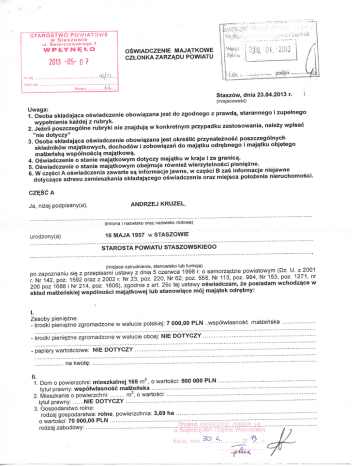 STAROSTWO POWIATOWE w Staszowie ul. Swierczcwskiego 7 WPtYN^f-O OSWIADCZENIE MAJATKOWE CZLONKAZARZADU POWIATU 2013 -05- 0 7 ' Iio4czal.,, Podpis J^*i...... Staszow, dnia 23.04.2013 r. (miejscowosc) 1 Uwaga: 1. Osoba sktadajqca oswiadczenie obowiazana jest do zgodnego z prawdq, starannego i zupetnego wypetnienia kazdej z rubryk. 2. Jezeli poszczegolne rubryki nie znajdujq w konkretnym przypadku zastosowania, nalezy wpisac "nie dotyczy" 3. Osoba sktadajc|ca oswiadczenie obowiqzana jest okreslic przynaleznosc poszczegolnych sktadnikow majqtkowych, dochodow i zobowiazari do majqtku odrebnego i majatku objetego maJzeriskq wspolnosciej majejtkowq. 4. Oswiadczenie o stanie maja^kowym dotyczy maja^ku w kraju i za granicq. 5. Oswiadczenie o stanie majatkowym obejmuje rowniez wierzytelnosci pieniezne. 6. W czesci A oswiadczenia zawarte sq informacje jawne, w czesci B zas informacje niejawne dotyczqce adresu zamieszkania sktadajqcego oswiadczenie oraz miejsca polozenia nieruchomosci. CZE.SC A Ja, nizej podpisany(a), ANDRZEJ KRUZEL, (imiona i nazwisko oraz nazwisko rodowe) urodzony(a) 16 MAJA 1957 w STASZOWIE STAROSTA POWIATU STASZOWSKIEGO (miejsce zatrudnienia, stanowisko lub funkcja) po zapoznaniu si§ z przepisami ustawy z dnia 5 czerwca 1998 r. o samorza^dzie powiatowym (Dz. U. z 2001 r. Nr 142, poz. 1592 oraz z 2002 r. Nr 23, poz. 220, Nr 62, poz. 558, Nr 113, poz. 984, Nr 153, poz. 1271, nr 200 poz 1688 i Nr 214, poz. 1806), zgodnie z art. 25c tej ustawy oswiadczam, ze posiadam wchodzace w sklad mafzenskiej wspolnosci majcjtkowej lub stanowicjce moj majqtek odrebny: I. Zasoby pieniezne: - srodki pieniezne zgromadzone w walucie polskiej: 7 000,00 PLN ..wspotwiasnosc maizenska - srodki pieniezne zgromadzone w walucie obcej: NIE DOTYCZY - papiery wartosciowe: NIE DOTYCZY na kwote; II. 1. Dom o powierzchni: mieszkalnej 165 m 2 , o wartosci: 500 000 PLN tytuJ prawny: wspofwtasnosc malzeriska 2. Mieszkanie o powierzchni: m2, o wartosci: tytut prawny: NIE DOTYCZY 3. Gospodarstwo rolne: rodzaj gospodarstwa: rolne, powierzchnia: 3,69 ha o wartosci: 70000,00 PLN rodzaj zabudowy: P(y.9JnaJ..^ w Swi?tol<rzysl<im'Urz§d^e'Wo]ew6dzkim Kieice, dnia tytut prawny: wspolwlasnosc matzeriska (Koniemtoty) i rodzinna w Kurozw?kach 1/6 cz?sci . A Z tego tytutu osiqgnqtem(ejam) w roku ubiegtym przychod dochod w wysokosci: 0,00 PLN. Av>\jdUA£* 4. Inne nieruchomosci: ' ' ' powierzchnia: 6 arow - dziatka budowlana w Koniemtotach o wartosci: 30 000,00 PLN 8 arow - dziatka pod domem wykazanym w pozycji II poz.1 o wartosci: 40 000,00 PLN tytut prawny: wspotwtasnosc matzehska III. 1. Posiadam udziaty w spotkach handlowych z udziatem powiatowych osob prawnych lub przedsi^biorcow, w ktorych uczestnicza. takie osoby - nalezy podac liczbe i emitenta udziatow: NIEDOTYCZY udziaty te stanowia. pakiet wi^kszy niz 10% udziatow w spotce: NIE DOTYCZY Z tego tytutu osia.gna.tem(^tam) w roku ubiegtym dochod w wysokosci: NIEDOTYCZY 2. Posiadam udziaty w innych spotkach handlowych - nalezy podac liczb$ i emitenta udziatow: NIEDOTYCZY Z tego tytutu osiqgnajem($tam) w roku ubiegtym dochod w wysokosci: NIEDOTYCZY IV. 1. Posiadam akcje w spotkach handlowych z udziatem powiatowych osob prawnych lub przedsiebiorcow, w ktorych uczestnicza. takie osoby - nalezy podac liczb§ i emitenta akcji: NIEDOTYCZY akcje te stanowia. pakiet wi^kszy niz 10% akcji w spotce: NIEDOTYCZY Z tego tytutu osiqgnajem(§tam) w roku ubiegtym doch6d w wysokosci: NIEDOTYCZY 2. Posiadam akcje w innych spotkach handlowych - nalezy podac liczb§ i emitenta akcji: NIEDOTYCZY Z tego tytutu osia.gna.tem(^tam) w roku ubiegtym dochod w wysokosci: NIEDOTYCZY V. Nabytem(am) (nabyt moj matzonek, z wyta.czeniem mienia przynaleznego do jego majajku odr^bnego) od Skarbu Pahstwa, innej pahstwowej osoby prawnej, jednostek samorza.du terytorialnego, ich zwia.zk6w lub od komunalnej osoby prawnej nast^puja^ce mienie, ktore podlegato zbyciu w drodze przetargu - nalezy podac opis mienia i dat§ nabycia, od kogo: .NIE DOTYCZY VI. 1. Prowadz^ dziatalnosc gospodarcza. (nalezy podac form§ prawnq i przedmiot dziatalnosci): NIEDOTYCZY -osobiscie ..NIE DOTYCZY... - wspolnie z innymi osobami .NIE DOTYCZY. Z tego tytutu osia.gnatem(§tam) w roku ubiegtym przychod i dochod w wysokosci: 2. Zarza.dzam dziatalnosci^ gospodarcza. lub jestem przedstawicielem petnomocnikiem takiej dziatalnosci (nalezy podac form§ prawna. i przedmiot dziatalnosci): NIEDOTYCZY -osobiscie ....NIE DOTYCZY Ory9lnat.o^yuiadczenia.-znaj(iuje"&i^—• w Swi?tokrzyskim Urz^dzie Wojewodzkim Kielce, - wspolnie z innymi osobami .NIE DOTYCZY. Z tego tytutu osiqgnajerrXetam) w roku ubiegtym dochod w wysokosci: .NIE DOTYCZY.. VII. 1 .W spotkach handlowych (nazwa, siedziba spotki): NIE DOTYCZY - jestem cztonkiem zarza^du (od kiedy): NIE DOTYCZY -jestem cztonkiem rady nadzorczej (od kiedy): NIE DOTYCZY -jestem cztonkiem komisji rewizyjnej (od kiedy): NIE DOTYCZY Z tego tytutu osia.gnatem(§tam) w roku ubiegtym dochod w wysokosci: NIE DOTYCZY 2. W spotdzielniach: NIE DOTYCZY -jestem cztonkiem zarz^du (od kiedy): NIE DOTYCZY -jestem cztonkiem rady nadzorczej (od kiedy): NIE DOTYCZY -jestem cztonkiem komisji rewizyjnej (od kiedy): NIE DOTYCZY Z tego tytutu osi^gn^tem(^tam) w roku ubiegtym dochod w wysokosci: NIE DOTYCZY 3.W fundacjach prowadza^cych dziatalnosc gospodarczq: NIE DOTYCZY - jestem cztonkiem zarzqdu (od kiedy): NIE DOTYCZY -jestem cztonkiem rady nadzorczej (od kiedy): NIE DOTYCZY -jestem cztonkiem komisji rewizyjnej (od kiedy): NIE DOTYCZY Z tego tytutu osiqgnatem(ejam) w roku ubiegtym dochod w wysokosci: NIE DOTYCZY VIII. Inne dochody osia^gane z tytutu zatrudnienia lub innej dziatalnosci zarobkowej lub zaj§6, z podaniem kwot uzyskiwanych z kazdego tytutu: Starostwo Powiatowe wynagrodzenie - 160 277,96 PLN przychod 158 609,24 PLN dochod Koneckie Sfowarzyszenie Wspierania Przedsiebiorczosci 350,00 PLN przychod 280,00 PLN dochod IX. Sktadniki mienia ruchomego o wartosci powyzej 10.000 ztotych (w przypadku pojazdow mechanicznych 