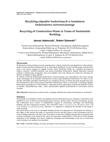 PROBLEMY EKOROZWOJU – PROBLEMS OF SUSTAINABLE DEVELOPMENT 2010, vol. 5, no 2, 125-131 Recykling odpadów budowlanych w kontekście budownictwa zrównowaŜonego Recycling of Construction Waste in Terms of Sustainable Building Janusz Adamczyk*, Robert Dylewski** *Uniwersytet Zielonogórski, Wydział Ekonomii i Zarządzania, Zakład Zarządzania Środowiskiem i Gospodarką Publiczną, ul. Podgórna 50, 65-246 Zielona Góra, e-mail: [email protected] ** Uniwersytet Zielonogórski, Wydział Matematyki, Informatyki i Ekonometrii, Zakład Teorii i Metod Optymalizacji, ul. prof. Z. Szafrana 4a, 65-516 Zielona Góra, e-mail: [email protected] Streszczenie W dąŜeniu do zrównowaŜonego rozwoju gospodarczego i ochrony środowiska, przedsiębiorstwa sektora budowlanego powinny bardziej koncentrować się na skutecznych działaniach na rzecz projektowania prośrodowiskowego, a tym samym osiągnąć cel ciągłego wzrostu. Sektor budowlany składa się z zakładów prowadzących budowy, remonty i rozbiórki budynków oraz innych konstrukcji inŜynierskich. Odpady budowlane stanowią problem w kaŜdym kraju europejskim, ilości tych odpadów stale rosną. Dlatego teŜ, istotne jest wdraŜanie elementów recyklingu tej grupy odpadów. W artykule omówiono problematykę budownictwa zrównowaŜonego oraz najwaŜniejsze akty prawa europejskiego nawiązujące do tej tematyki. Przedstawiono równieŜ etapy działalności budowlanej i ich wpływ na środowisko. Recykling materiałów budowlanych jest zasadniczą kwestią, do której nawiązuje prezentowany artykuł. Przedstawiono opisy innowacyjnych materiałów budowlanych, które są wytwarzane z recyklingu odpadów budowlanych powstających w trakcie budowy, modernizacji lub po zakończeniu uŜytkowania budynku (rozbiórka obiektu). Zidentyfikowano wady i zalety wykorzystania odpadów budowlanych do wytworzenia nowych wyrobów. Słowa kluczowe: budownictwo zrównowaŜone, recykling, oddziaływanie sektora budowlanego na środowisko Summary In the pursuit of sustainable economic development and environmental protection, enterprises construction sector should focus more on effective environmental design activities, and thus achieve the goal of permanent growth. The construction sector consists of establishments engaged in constructing, renovating, and demolishing buildings and other engineering structures. The construction waste is an issue in every European country, and waste quantities are generally growing. Therefore, it is important to implement the elements of this group of waste recycling. The article discusses the issue of sustainable building and the most important acts of European law referring to this subject. It also presents the stages of construction activities and their impact on the environment with recycling of building materials as the basic idea. Descriptions of innovative building materials that are produced from recycled construction waste arising in the course of construction, modernization or after the use of the building (demolition of the building) were shown. Finally the advantages and disadvantages of the use of construction waste to produce new products were identified. Key words: sustainable building, recycling, the impact of the construction sector on the environment Adamczyk/Dylewski/Problemy Ekorozwoju/Problems of Sustainable Development 2/2010, 125-131 126 1. Wstęp Pojęcie „zrównowaŜonego budownictwa” wywodzi się od pojęcia zrównowaŜonego rozwoju. Paradygmat zrównowaŜonego rozwoju ma swój wymiar społeczny, ekonomiczny i ekologiczny. W literaturze przedmiotu spotyka się róŜne (bardzo liczne) definicje tego pojęcia (Kozłowski, 2005; Piontek, 2002; Sztumski, 2006; Sanchéz, 2008; Skowroński, 2006; Hull 2007, 2008, Redclift, 2009), jednak wszystkie nawiązują do samopodtrzymującego się, obecnego rozwoju gospodarczego (zasada sprawiedliwości wewnątrzpokoleniowej), który powinien takŜe umoŜliwić zapewnienie tego rozwoju następnym pokoleniom (zasada sprawiedliwości międzypokoleniowej). Budynek, czy teŜ samo mieszkanie, jest doskonałym przykładem na fakt zachodzenia relacji wewnątrzpokoleniowych jak i międzypokoleniowych z uwagi na czas jego uŜytkowania wynoszący 5080 lat, a w niektórych przypadkach nawet 150 lat (Stawicka-Wałkowska, 2000). Stąd teŜ „zrównowaŜone budownictwo” jest pierwszoplanowym elementem szerszego pojęcia jakim jest „rozwój zrównowaŜony”. Wierzbicki podał definicję budownictwa zrównowaŜonego, która została sformułowana przy okazji opracowania wskaźnika dotyczącego zrównowaŜonego budownictwa CRISP (Construction and City Related Sustainability Indicators). Brzmi ona następująco: Pojęcie zrównowaŜonego budownictwa ma na celu stworzenie i odpowiedzialne zarządzanie zdrowym obszarem zabudowanym, opartym na zasadzie efektywnego i ekologicznego wykorzystania zasobów naturalnych. Uwzględnia ono aspekt środowiska i jakości Ŝycia, ponadto kwestie kulturowe i sprawiedliwości społecznej oraz ekonomiczne ograniczenia (Wierzbicki, Gajownik, 2002). Tematyka rozwoju zrównowaŜonego w budownictwie w dziedzinie konstrukcji budowlanych została podjęta przez Conseil International du Bâtiment (CIB) w 1995 roku. Następnie w 1998 roku na konferencji w Gävle (Szwecja), została sprecyzowana wiodąca rola procesu budowlanego w zrównowaŜonym rozwoju w wyniku opracowania przez CIB Agendy 21 w zakresie Budownictwa ZrównowaŜonego, stanowiącej pośredni dokument pomiędzy Agendą 21 z Rio i Agendą Habitat (StawickaWałkowska, 2001). W obecnym stuleciu, potrzeba wprowadzenia rozwoju zrównowaŜonego do wszystkich obszarów działalności gospodarczej została jednoznacznie sformułowana w maju 2001 roku przez Komisję Europejską, która na posiedzeniu w Göteborgu przedstawiła Radzie Europy propozycję Strategii Unii Europejskiej na rzecz zrównowaŜonego rozwoju – tzw. Strategii Göteborskiej. Podkreślono w niej konieczność wprowadzenia pro