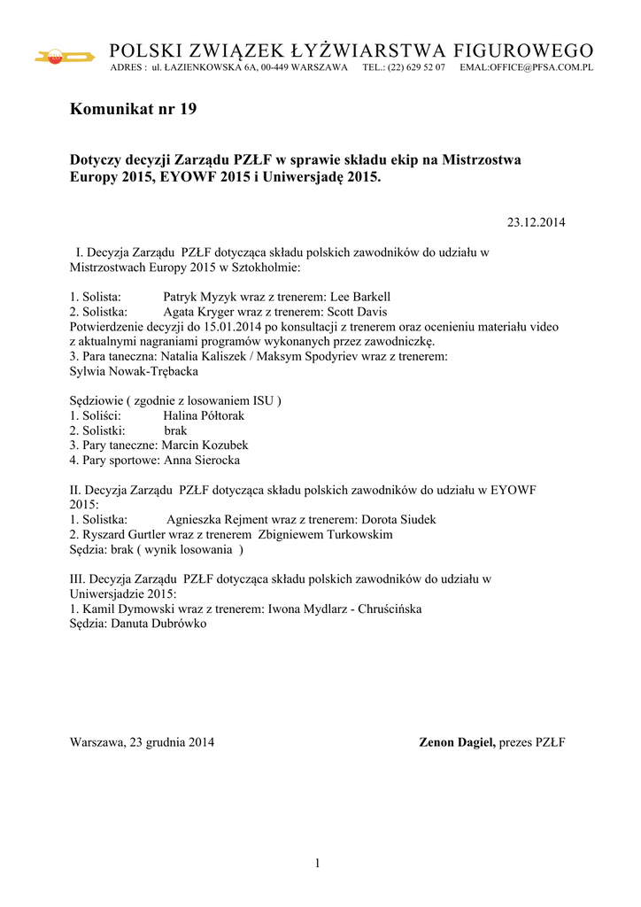 POLSKI ZWIĄZEK ŁYŻWIARSTWA FIGUROWEGO ADRES : ul. ŁAZIENKOWSKA 6A, 00-449 WARSZAWA TEL.: (22) 629 52 07 EMAL:[email protected] Komunikat nr 19 Dotyczy decyzji Zarządu PZŁF w sprawie składu ekip na Mistrzostwa Europy 2015, EYOWF 2015 i Uniwersjadę 2015. 23.12.2014 I. Decyzja Zarządu PZŁF dotycząca składu polskich zawodników do udziału w Mistrzostwach Europy 2015 w Sztokholmie: 1. Solista: Patryk Myzyk wraz z trenerem: Lee Barkell 2. Solistka: Agata Kryger wraz z trenerem: Scott Davis Potwierdzenie decyzji do 15.01.2014 po konsultacji z trenerem oraz ocenieniu materiału video z aktualnymi nagraniami programów wykonanych przez zawodniczkę. 3. Para taneczna: Natalia Kaliszek / Maksym Spodyriev wraz z trenerem: Sylwia Nowak-Trębacka Sędziowie ( zgodnie z losowaniem ISU ) 1. Soliści: Halina Półtorak 2. Solistki: brak 3. Pary taneczne: Marcin Kozubek 4. Pary sportowe: Anna Sierocka II. Decyzja Zarządu PZŁF dotycząca składu polskich zawodników do udziału w EYOWF 2015: 1. Solistka: Agnieszka Rejment wraz z trenerem: Dorota Siudek 2. Ryszard Gurtler wraz z trenerem Zbigniewem Turkowskim Sędzia: brak ( wynik losowania ) III. Decyzja Zarządu PZŁF dotycząca składu polskich zawodników do udziału w Uniwersjadzie 2015: 1. Kamil Dymowski wraz z trenerem: Iwona Mydlarz - Chruścińska Sędzia: Danuta Dubrówko Warszawa, 23 grudnia 2014 Zenon Dagiel, prezes PZŁF 1