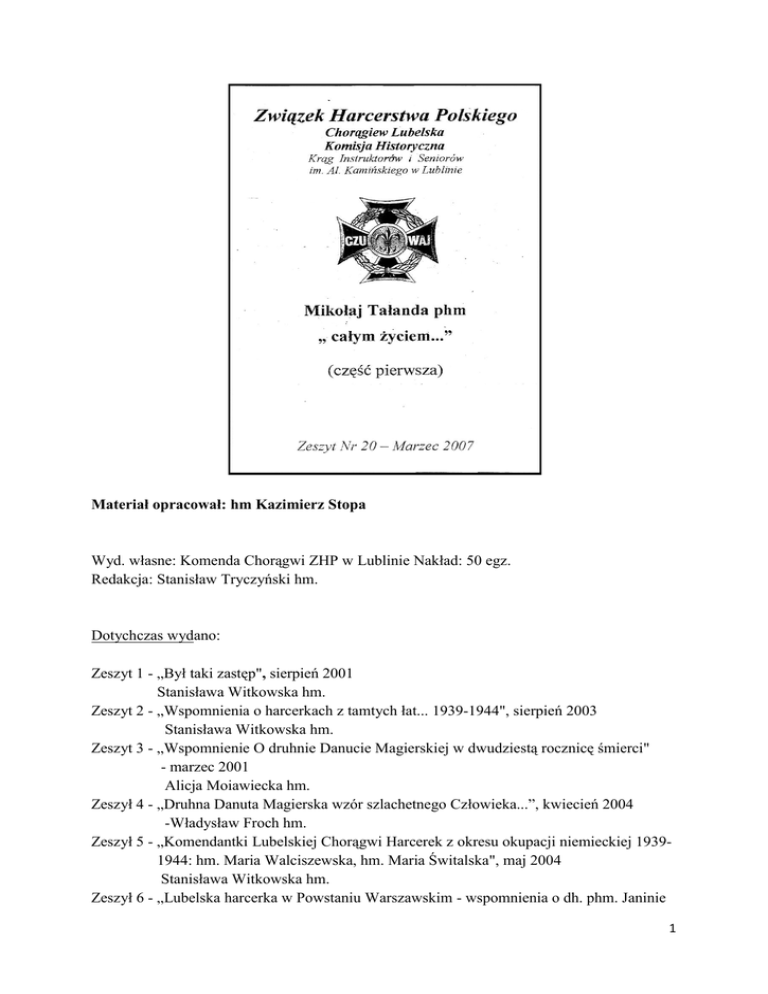 Materiał opracował: hm Kazimierz Stopa Wyd. własne: Komenda Chorągwi ZHP w Lublinie Nakład: 50 egz. Redakcja: Stanisław Tryczyński hm. Dotychczas wydano: Zeszyt 1 - „Był taki zastęp", sierpień 2001 Stanisława Witkowska hm. Zeszyt 2 - „Wspomnienia o harcerkach z tamtych łat... 1939-1944", sierpień 2003 Stanisława Witkowska hm. Zeszyt 3 - „Wspomnienie O druhnie Danucie Magierskiej w dwudziestą rocznicę śmierci" - marzec 2001 Alicja Moiawiecka hm. Zeszył 4 - „Druhna Danuta Magierska wzór szlachetnego Człowieka...”, kwiecień 2004 -Władysław Froch hm. Zeszył 5 - „Komendantki Lubelskiej Chorągwi Harcerek z okresu okupacji niemieckiej 19391944: hm. Maria Walciszewska, hm. Maria Świtalska", maj 2004 Stanisława Witkowska hm. Zeszył 6 - „Lubelska harcerka w Powstaniu Warszawskim - wspomnienia o dh. phm. Janinie 1 Łotockiej w 60 rocznicę Powstania Warszawskiego”, sierpień 2001 Stanisława Witkowska hm. Zeszył 7 - „Komendantki Lubelskiej Chorągwi Harcerek" cz. II, sierpień 2004 Stanisława Witkowska hm. Zeszyt 8 - „Płk Emil Czapliński Harcerz Rzeczypospolitej, Działacz Harcerski", sierpień 2004 Stanisław Dąbrowski hm. Zeszyt 9 - „Druhna Maryla. Ostatnia komendantka konspiracyjnej Lubelskiej Komendy Chorągwi Harcerek", wrzesień 2004, Stanisława Ziemnicka Zeszyt 10 - „Powojenna służba harcerki (relacja hufcowej)”, październik 2004 Stanisława Witkowska hm. Zeszyt 11 - „Moja droga do harcerstwa", listopad 2004 Cezary Siedlecki hm. Zeszyt 12 - „Druhna Antoszka - Wspomnienie o hm Antoninie Łopatyńskiej", styczeń 2005 Stanisława Witkowska hm. Zeszyt 13 - „Instruktorki Lubelskiej Chorągwi Harcerek w kierownictwie Związku Walki Zbrojnej i Wojskowej Służbie Kobiet AK Okręgu Lubelskiego", luty 2005 Stanisława Witkowska hm. Zeszyt 14 - „Swoje życie oddały Ojczyźnie", luty 2005 Stanisława Witkowska hm. Zeszyt 15 - „W 60-tą rocznice wyzwolenia obozu Ravensbruck", sierpień 2005 Stanisława Witkowska hm. Zeszyt 16 - „Hm Elżbieta Starzycka-Andrzejowska (Naczelniczka Harcerek poza granicami kraju 1950-1957 i 1972-1976)”, sierpień 2005 Stanisława Witkowska hm. Zeszyt 17 - „U progu stulecia", sierpień 2006 Stanisław Dąbrowski hm. Zeszyt 18 - „Hm Anna Krzymowska w harcerskiej służbie Bogu i Polsce", wrzesień 2006 Stanisława Witkowska hm. Zeszyt 19 - „Był taki zastęp..." (część druga), grudzień 2006 Stanisława Witkowska hm. Mikołaj Tałanda „Całym życiem..." Część I Dzieje drużyny harcerskiej w Wojsławicach nierozerwalnie związane są z osobą Mikołaja Tałandy, nauczyciela siedmioklasowej Szkoły Powszechnej w Wojsławicach. Mikołaj Tałanda syn Jana i Katarzyny, urodził się w Szczebrzeszynie dnia 28 listopada 1906 roku. Rodzina Tałandów do roku 1875 była wyznania greckokatolickiego (unickiego). Władze rosyjskie mając na uwadze strategiczny cel, jakim miała być rusyfikacja ludności polskiej wyznania greckokatolickiego, ukazem cara z 1875 roku skasowały Unię na terenie guberni 2 siedleckiej i lubelskiej przekształcając kościoły unickie w cerkwie prawosławne a ludność wyznania unickiego siłą zmuszając do prawosławia i zadeklarowania się, jako Rusini1. Rodzina Tałandów podobnie jak wszystkich Unitów zmuszona była do przejścia na prawosławie. Obok urzędowych zarządzeń i nakazów, zastosowano wobec opornych przymus ekonomiczny. Uchylający się od przejścia na prawosławie byli prześladowani i szykanowani. Wybuch wojny rosyjsko - japońskiej i niepowodzenia militarne Rosji w wojnie z Japończykami na Dalekim Wschodzie, stały się przyczyną wybuchu rewolucji, która w 1905 roku ogarnęła całe imperium carów w tym również Królestwo Polskie, które po klęsce Powstania Styczniowego, utraciło resztki autonomii i włączone zostało, jako prowincja, w skład imperium rosyjskiego pod nazwą Prywislańskij Kraj. Rewolucja, w zachodnich guberniach Rosji a przede wszystkim na terenie Litwy, Białorusi i Królestwa Kongresowego, przerodziła się w masowy protest przeciw wynaradawianiu i prześladowaniom religijnym. W wyniku strajków i manifestacji, antyrządowych, które ogarnęły całą Rosję car został zmuszony do wydania manifestu tolerancyjnego z dnia 17/30 kwietnia 1905 r. znoszącego prześladowania religijne na terenie całej Rosji. Po ogłoszeniu manifestu ludność polska w Królestwie Kongresowym przymuszona do wyznawania prawosławia masowo wracała na łono Kościoła Rzymskokatolickiego. Porzucając wyznanie greckokatolickie, gdyż byli Unici nie ufali carskim zapewnieniom. Woleli zostać wyznawcami Kościoła rzymskokatolickiego by nie stać się w przyszłości powtórnie przedmiotem prześladowań. Jedną z pierwszych rodzin w Szczebrzeszynie, która porzuciła prawosławie była rodzina Tałandów. Dzięki temu mały Mikołaj był już chrzczony w miejscowym kościele parafialnym, rzymskokatolickim. Stało się to w dniu Św. Mikołaja 1906r. Mikołaj wyrastał w szczególnej atmosferze. Głęboka religijność domu rodzinnego, aktywność ojca, jako działacza Polskiej Partii Socjalistycznej (PPS) i jego zaangażowanie się w jej działalność na rzecz niepodległości Polski, tworzyło szczególną atmosferę rodzinnego domu. Chłopięce lata Mikołaja wypadły w szczególnie niespokojnych czasach. Miał bowiem zaledwie 8 lat, gdy wybuchła I wielka wojna światowa. Wraz z rodziną i mieszkańcami Szczebrzeszyna przeżył dramatyczne chwile w czasie niezwykle krwawej bitwy przygranicznej, stoczonej przez Rosjan z Austriakami. Po zwycięskiej ofensywie Rosjan, gdy front przesunął się w głąb 1 Unia Brzeska. Dobrowolna uchwała wspólnego synodu biskupów kościoła rzymskokatolickiego i biskupów prawosławnych, która zdecydowała o zjednoczeniu obu wyznań i uznaniu przez cerkiew zwierzchności z zachowaniem w cerkwi obrządku wschodniego i liturgii w języku starocerkiewnym. Unia Brzeska zawarta w 1596 roku, dała początek 