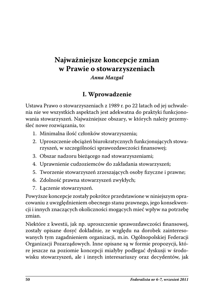 Najważniejsze koncepcje zmian w Prawie o stowarzyszeniach Anna Mazgal I. Wprowadzenie Ustawa Prawo o stowarzyszeniach z 1989 r. po 22 latach od jej uchwalenia nie we wszystkich aspektach jest adekwatna do praktyki funkcjonowania stowarzyszeń. Najważniejsze obszary, w których należy przemyśleć nowe rozwiązania, to: 1. Minimalna ilość członków stowarzyszenia; 2. Uproszczenie obciążeń biurokratycznych funkcjonujących stowarzyszeń, w szczególności sprawozdawczości finansowej; 3. Obszar nadzoru bieżącego nad stowarzyszeniami; 4. Uprawnienie cudzoziemców do zakładania stowarzyszeń; 5. Tworzenie stowarzyszeń zrzeszających osoby fizyczne i prawne; 6. Zdolność prawna stowarzyszeń zwykłych; 7. Łączenie stowarzyszeń. Powyższe koncepcje zostały pokrótce przedstawione w niniejszym opracowaniu z uwzględnieniem obecnego stanu prawnego, jego konsekwencji i innych znaczących okoliczności mogących mieć wpływ na potrzebę zmian. Niektóre z kwestii, jak np. uproszczenie sprawozdawczości finansowej, zostały opisane dosyć dokładnie, ze względu na dorobek zainteresowanych tym zagadnieniem organizacji, m.in. Ogólnopolskiej Federacji Organizacji Pozarządowych. Inne opisane są w formie propozycji, które jeszcze na poziomie koncepcji miałyby podlegać dyskusji w środowisku stowarzyszeń, ale i innych interesariuszy oraz decydentów, jak 50 Federalista nr 6-7, wrzesień 2011 np. propozycje zmian dotyczące nadzoru. Jeszcze inne, jak możliwość tworzenia stowarzyszeń zrzeszających osoby fizyczne i prawne, pojawia się w sektorze organizacji, ale ma tyluż zwolenników, co przeciwników i wymaga większego namysłu i badań, m.in. nad praktyką funkcjonowania tego rozwiązania w krajach, które takie rozwiązanie wprowadziły. Jeszcze inne wydają się interesujące z punktu widzenia rozszerzenia faktycznej wolności zrzeszania się – jak możliwość łączenia stowarzyszeń – ale nie były jak dotąd podnoszone przez organizacje, a ich źródłem jest senacki projekt ustawy o zrzeszeniach (próbę jego wprowadzenia do procesu legislacyjnego podjął parlamentarny zespół ds. współpracy z organizacjami pozarządowymi na przełomie 2010/11 r. Podstawą dla tak skonstruowanego wstępnego katalogu koncepcji zmian Prawa o stowarzyszeniach jest po pierwsze dorobek organizacji i obserwacje wynikające z działalności Ogólnopolskiej Federacji Organizacji Pozarządowych, Sieci SPLOT i innych organizacji infrastrukturalnych. Po drugie, niektóre problemy zostały wskazane w zamówionych przez Senat RP w 2009 r. dwóch ekspertyzach, które posłużyły za podstawę dla sformułowania projektu senackiego – chodzi tu o ekspertyzy prof. Huberta Izdebskiego oraz mec. Jana A. Stefanowicza. Chociaż wiele z proponowanych przez autorów rozwiązań spotkało się ze sprzeciwem organizacji, sama diagnoza czy katalog przywołanych problemów pokrywa się w części z obserwacjami organizacji zainteresowanych polepszeniem regulacji prawnych dotyczących stowarzyszeń. Pewnym punktem odniesienia stał się druk 1028, czyli senacki projekt ustawy o zrzeszeniach. Jak wielokrotnie podnoszono w dyskusji, sprzeciw budziły nie tyle inicjatywy, które w projekcie zaproponowano (np. zmniejszenie wymaganej liczby członków stowarzyszenia), ile sposób ich realizacji. W pewnym sensie jego konstrukcja stała się „antyprzykładem” dla aktów prawnych mających służyć obywatelom, którzy nie są biegli w prawie cywilnym i kodeksie spółek handlowych. Świetnym materiałem do przemyśleń w tej kwestii są opinie do projektu ustawy, w szczególności prof. dr hab. Piotra Steca oraz Fundacji Instytut Myśli Obywatelskiej im. Stańczyka. Przedstawione poniżej koncepcje opierają się bez wyjątku na następujących zasadach: Federalista nr 6-7, wrzesień 2011 51 - działalność obywateli w stowarzyszeniach powinna być ułatwiona poprzez maksymalne ograniczenie wymogów formalnych. Uproszczenia te nie powinny zmniejszać transparentności działań stowarzyszeń, ale tam, gdzie nie mają na nią wpływu, powinno nastąpić zniesienie obciążeń biurokratycznych; - stowarzyszenia są samorządne i demokratyczne; oznacza to, że o ile nie dysponują majątkiem publicznym, ich działalność powinna być nadzorowana przez członków, którym należy maksymalnie ułatwić dostęp do istotnych informacji o działalności stowarzyszenia; - obciążenia: biurokratyczne, finansowe i inne, powinny być proporcjonalne do rozmiaru prowadzonej działalności; w modelu idealnym stowarzyszenie nieposiadające żadnego lub dysponujące znikomym majątkiem nie powinno ponosić kosztów z tytułu prowadzenia podstawowej działalności wynikającej z przepisów prawa; - przepisy ustawy Prawo o stowarzyszeniach powinny stanowić możliwie zamkniętą całość; chodzi o to, żeby każdy mógł na podstawie przepisów Prawa o stowarzyszeniach zrozumieć, jak zakłada się i jak działa stowarzyszenie, bez konieczności odwoływania się do przepisów odrębnych. Jak ujął to prof. Stec: „przepisy (…) powinny być jak najbardziej klarowne i regulować kompleksowo problemy związane z funkcjonowaniem zrzeszeń. Nie mogą one odsyłać do innych przepisów, zwłaszcza jeśli to mają być przepisy o łączeniu, przekształceniu i podziale spółek. Normy te są bowiem skomplikowane i nastręczają trudności w stosowaniu praktykom życia gospodarczego. W przypadku stowarzyszeń ich odpowiednie stosowanie może okazać się barierą nie do przekroczenia” [Stec P., 2011]. Zawartość niniejszego dokumentu nie przesądza o kierunkach zmian ustawy Prawo o stowarzyszeniach. Jest zaledwie podstawą do dyskusji nad kierunkami zmian w środowisku organizacji zainteresowanych dobrym prawem dla stowarzyszeń. 52 Federalista nr 6-7, wrzesień 2011 II. Modyfikacje obecnych regulacji usprawniające funkcjonowanie stowarzyszeń 1. Minimalna ilość członków stowarzyszenia 1.1 Obecny stan prawny Ob