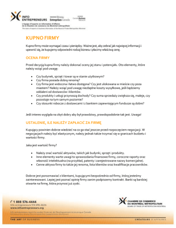 KUPNO FIRMY Kupno firmy może wymagać czasu i pieniędzy. Ważne jest, aby zebrać jak najwięcej informacji i upewnić się, że kupujemy odpowiedni rodzaj biznesu i płacimy właściwą cenę. OCENA FIRMY Przed decyzją kupna firmy należy dokonać oceny jej stanu i potencjału. Oto elementy, które należy wziąć pod uwagę: • • • • • Czy budynek, sprzęt i towar są w stanie użytkowym? Czy firma posiada dobrą renomę? Czy firma jest widoczna i łatwo dostępna? Czy jest ulokowana w mieście czy poza miastem? Należy wziąć pod uwagę niezbędne koszty wysyłkowe, jeśli będziemy oddaleni od dostawców i klientów. Czy produkty i usługi przynoszą dochody? Czy suma sprzedaży zwiększa się, maleje, czy pozostaje na tym samym poziomie? Czy stosunki robocze z dostawcami i z bankiem zapewniającym fundusze są dobre? Jeśli interes wygląda na zbyt dobry aby był prawdziwy, prawdopodobnie tak jest. Uwaga! USTALENIE, ILE NALEŻY ZAPŁACIĆ ZA FIRMĘ Kupujący powinien dobrze wiedzieć na co go stać jeszcze przed rozpoczęciem negocjacji. W negocjacjach należy być elastycznym, należy jednak także trzymać się w granicach budżetu i wartości firmy. Jaka jest wartość firmy? • • • Należy znać wartość aktywów, takich jak budynki, sprzęt i produkty. Inne elementy warte uwagi to sprawozdania finansowe firmy, coroczne raporty oraz własność intelektualna (na przykład, patenty i zarejestrowane nazwy komercjalne). Cenne aktywa firmy to także jej renoma, lista klientów oraz kwalifikacje pracowników. Dobrze jest porozmawiać z klientami, kupującymi bezpośrednio od firmy, którą jesteśmy zainteresowani. Lepiej jest poznać opinię firmy zanim podpiszemy kontrakt. Banki są bardziej otwarte na firmę, która przynosi już zyski. UWAGI KOŃCOWE • • • • • Nie śpieszmy się i sprawdźmy wszystkie otrzymane informacje zanim zaangażujemy się w kupno. Należy kupować firmę działającą w dziedzinie, którą dobrze znamy i sprzedającą produkty, które możemy bez obaw sprzedawać. Kupno oprzeć należy na zasadzie zwrotu uzyskanego z inwestycji, nie na cenie. Nie wydawajmy od razu całej gotówki naszej na kupno firmy. Przed dokonaniem zakupu należy sprawdzić dostawców, klientów i opinię o firmię, którą jesteśmy zainteresowani.