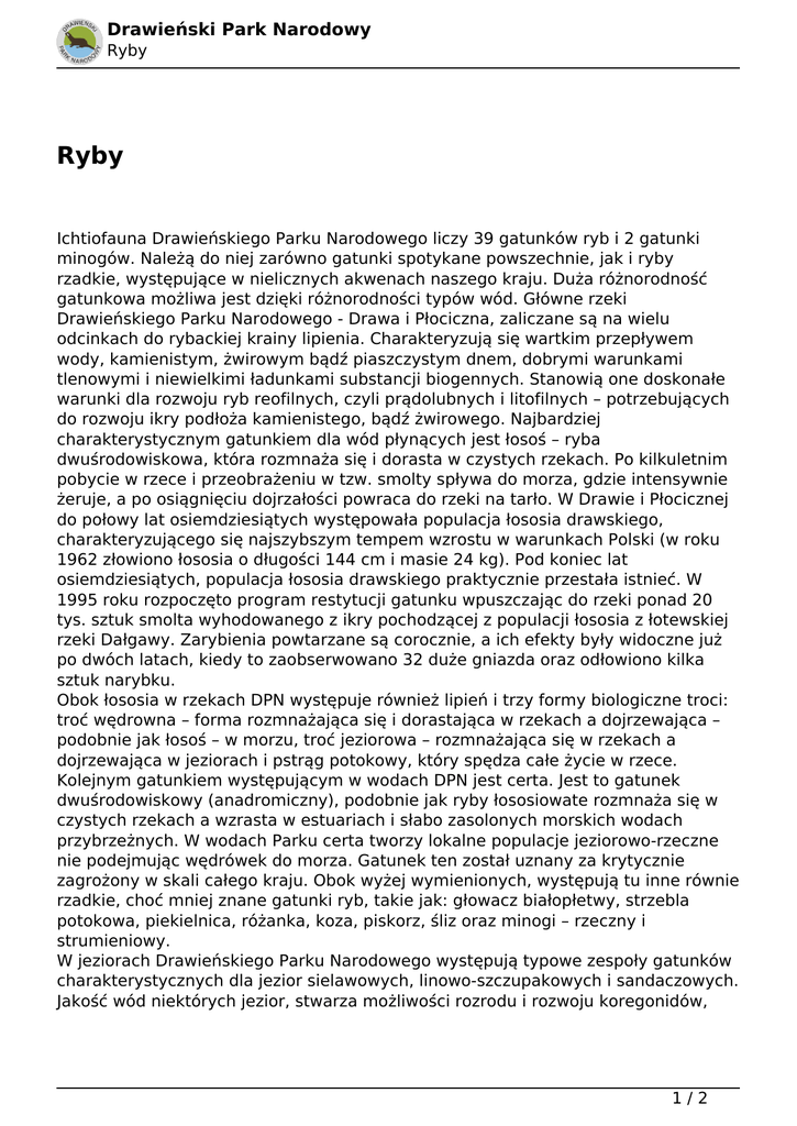 Drawieński Park Narodowy Ryby Ryby Ichtiofauna Drawieńskiego Parku Narodowego liczy 39 gatunków ryb i 2 gatunki minogów. Należą do niej zarówno gatunki spotykane powszechnie, jak i ryby rzadkie, występujące w nielicznych akwenach naszego kraju. Duża różnorodność gatunkowa możliwa jest dzięki różnorodności typów wód. Główne rzeki Drawieńskiego Parku Narodowego - Drawa i Płociczna, zaliczane są na wielu odcinkach do rybackiej krainy lipienia. Charakteryzują się wartkim przepływem wody, kamienistym, żwirowym bądź piaszczystym dnem, dobrymi warunkami tlenowymi i niewielkimi ładunkami substancji biogennych. Stanowią one doskonałe warunki dla rozwoju ryb reofilnych, czyli prądolubnych i litofilnych – potrzebujących do rozwoju ikry podłoża kamienistego, bądź żwirowego. Najbardziej charakterystycznym gatunkiem dla wód płynących jest łosoś – ryba dwuśrodowiskowa, która rozmnaża się i dorasta w czystych rzekach. Po kilkuletnim pobycie w rzece i przeobrażeniu w tzw. smolty spływa do morza, gdzie intensywnie żeruje, a po osiągnięciu dojrzałości powraca do rzeki na tarło. W Drawie i Płocicznej do połowy lat osiemdziesiątych występowała populacja łososia drawskiego, charakteryzującego się najszybszym tempem wzrostu w warunkach Polski (w roku 1962 złowiono łososia o długości 144 cm i masie 24 kg). Pod koniec lat osiemdziesiątych, populacja łososia drawskiego praktycznie przestała istnieć. W 1995 roku rozpoczęto program restytucji gatunku wpuszczając do rzeki ponad 20 tys. sztuk smolta wyhodowanego z ikry pochodzącej z populacji łososia z łotewskiej rzeki Dałgawy. Zarybienia powtarzane są corocznie, a ich efekty były widoczne już po dwóch latach, kiedy to zaobserwowano 32 duże gniazda oraz odłowiono kilka sztuk narybku. Obok łososia w rzekach DPN występuje również lipień i trzy formy biologiczne troci: troć wędrowna – forma rozmnażająca się i dorastająca w rzekach a dojrzewająca – podobnie jak łosoś – w morzu, troć jeziorowa – rozmnażająca się w rzekach a dojrzewająca w jeziorach i pstrąg potokowy, który spędza całe życie w rzece. Kolejnym gatunkiem występującym w wodach DPN jest certa. Jest to gatunek dwuśrodowiskowy (anadromiczny), podobnie jak ryby łososiowate rozmnaża się w czystych rzekach a wzrasta w estuariach i słabo zasolonych morskich wodach przybrzeżnych. W wodach Parku certa tworzy lokalne populacje jeziorowo-rzeczne nie podejmując wędrówek do morza. Gatunek ten został uznany za krytycznie zagrożony w skali całego kraju. Obok wyżej wymienionych, występują tu inne równie rzadkie, choć mniej znane gatunki ryb, takie jak: głowacz białopłetwy, strzebla potokowa, piekielnica, różanka, koza, piskorz, śliz oraz minogi – rzeczny i strumieniowy. W jeziorach Drawieńskiego Parku Narodowego występują typowe zespoły gatunków charakterystycznych dla jezior sielawowych, linowo-szczupakowych i sandaczowych. Jakość wód niektórych jezior, stwarza możliwości rozrodu i rozwoju koregonidów, 1/2 Drawieński Park Narodowy Ryby czyli sielawy i siei. Oba gatunki maja wysokie wymagania środowiskowe, dlatego naturalnym siedliskiem są dla nich są głębokie i dobrze natlenione jeziora, z litoralem piaszczystym lub kamienistym, oraz z roślinnością ramienicową. Sielawa zasiedla jezioro Pecnik Duży, Płociowe, Marta i Ostrowieckie, natomiast sieja występuje w trzech jeziorach: w Ostrowieckim, Marcie i w Czarnym, w którym populacja ma charakter endemiczny. Na uwagę zasługuje również autochtoniczna populacja troci jeziorowej, zasiedlającej jeziora przepływowe w systemie rzeki Płocicznej, a rozmnażająca się w jej dopływie – rzece Runicy. Data wydruku: 02.03.2017 06:41:45 Adres URL: http://dpn.pl/ryby 2/2 Powered by TCPDF (www.tcpdf.org)