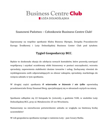 Szanowni Państwo – Członkowie Business Centre Club! Zapraszamy na wspólne spotkanie Klubu Biznesu Olympic, Związku Pracodawców Europy Środkowej i Loży Dolnośląskiej Business Center Club pod tytułem: Tygiel Gospodarczy BCC. Będzie to doskonała okazja do zdobycia nowych kontaktów, które pozwolą nawiązać współpracę i uzyskać oczekiwany efekt biznesowy w postaci oszczędności, wzrostu sprzedaży, zapewnienia stabilności dostaw towarów i usług. Zachęcamy również do wydelegowania osób odpowiadających za obszar zakupów, sprzedaży, marketingu do wzięcia udziału w tym spotkaniu. W drugiej części spotkania O wizerunku w biznesie i nie tylko opowiedzą przedstawiciele firmy Emanuel Berg, specjalizującej się w ubraniach szytych na miarę. Spotkanie odbędzie się 22 listopada br. (wtorek), o godzinie 9:00, w siedzibie Loży Dolnośląskiej BCC, przy ul. Metalowców 25 we Wrocławiu. Namawiamy na niezwłoczne potwierdzenie udziału ze względu na limitową liczbę uczestników! W roli gospodarza spotkania wystąpi z ramienia Loży - pan Cezary Rutka. Oczekujemy na Państwa od godziny 8.45 Agenda spotkania: 9:00 Powitanie gości oraz prezentacje Klubów. 9:40 Autoprezentacja uczestników 10:40 Przerwa 10:55 O wizerunku w biznesie i nie tylko. Joanna Dawid (manager ds. kluczowych klientów) oraz Magdalena Wojcieszek (manager salonów Emanuel Berg) przedstawią zasady dress code’u i klasycznej elegancji jako skutecznego narzędzia w kreowaniu własnego wizerunku. Z racji zbliżających się Świąt Bożego Narodzenia opowiedzą jak prezentować się elegancko w Wieczór Wigilijny oraz podczas Balu Sylwestrowego. 11:40 Rozmowy kuluarowe Termin: 22 listopada 2016 r., godzina 9:00 Miejsce: Złota Sala, Loża Dolnośląska BCC, ul. Metalowców 25 we Wrocławiu. R.S.V.P.: Prosimy o przesłanie potwierdzenia obecności na adres [email protected] Serdecznie zapraszamy! Loża Dolnośląska BCC ul. Metalowców 25 54-156 Wrocław tel/fax 071/ 359 09 29 e-mail: [email protected]