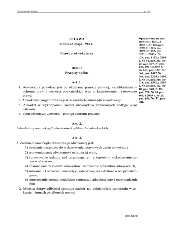 USTAWA z dnia 26 maja 1982 r. Prawo o adwokaturze Dział I
