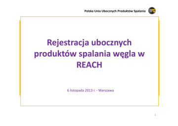 Polska Unia Ubocznych Produktów Spalania Rejestracja ubocznych produktów spalania węgla w REACH 6 listopada 2013 r. - Warszawa 1 REACH WE nr 1907/2006 Registration Evaluation Authorisation and Restriction of Chemicals Rejestracja Ocena udzielanie zezwoleń i stosowanie ograniczeń w zakresie chemikaliów 2 W Europie niezarejestrowane substancje chemiczne nie mogą być wprowadzane na rynek od 1 czerwca 2008 r. rejestracja wstępna 30 listopada 2008r. spóźniona wstępna rejestracja 30 listopada 2009 r. rejestracja pełna dla substancji >1000 t/a 30 listopada 2010 r. 3 Definicja zgodnie z Rozporządzeniem WE nr 1907/2006 11. Wprowadzenie do obrotu : oznacza odpłatne lub nieodpłatne dostarczenie lub udostępnienie stronie trzeciej. 4 5 Gdzie znaleźć informacje na temat zarejestrowanych substancji • Strona internetowa ECHA: http://echa.europa.eu/pl/information-on-chemicals/registered substances;jsessionid=79CB7F9F6DEFA0F0B9A912E1B1DB6EE0.live1 6 REACH – IT dostępny jest za pomocą internetu na stronie: https://reach-it.echa.europa.eu/ 7 Potwierdzenie rejestracji 8 Substancja i jej identyfikacja Analiza chemiczna – skład pierwiastkowy wyrażony w postaci tlenków Analiza jakościowa i ilościowa XRD – skład mineralogiczny Zawartość metali ciężkich oraz pierwiastków śladowych 9 SIP – Profil Identyfikacyjny Substancji Popioły Konwencjonalne Skład minerologiczny Faza amorficzna Mullit Kwarc Magnetyt Anhydryt Anortyt 30% - 100% 0% - 35% 0% - 35% 0% - 15% 0% - 15% 0% - 15% Skład pierwiastkowy CaO SiO2 K2O SO3 P2O5 MgO Fe2O3 Al2O3 Na2O TiO2 LOI 0,1 - 45 20 - 76 0,01 - 8 0,01 - 15 0,01 - 10 0,01 - 15 0,01 - 27 5 - 40 0,01 - 8,0 0,01 - 8,0 0,1 - 20 10 Ocena dokumentacji rejestracyjnej a ocena substancji – po przedłożeniu do ECHA 11 Popioły lotne a popioły denne Różnice substancji w zależności od frakcji Konieczność udowodnienia zbieżności pod względem składu i właściwości Aktualizacja dokumentacji - spontaniczna INQUIRY – finalna akceptacja ECHA 12 Weryfikacja propozycji badań – ocena dokumentacji 1. Podczas rejestracji proponowane są badania chroniczne oraz długookresowe 2. Badania te są nie tylko czasochłonne i kosztowne, ale wymagają również użycia największej ilości zwierząt 3. ECHA nie decyduje o przeprowadzaniu badań chronicznych i długookresowych przed oceną wyników pozostałych badań przedłożonych w dokumentacji rejestracyjnej oraz Raporcie Bezpieczeństwa Chemicznego (CSR) 13 Kluczowe informacje ECHA dla Rejestrujących • „Nie traktuj dokumentacji rejestracyjnej jako finalnego produktu” – Przyjmijcie pozycję aktywną i aktualizujcie swoją dokumentację zawsze, gdy pojawią się nowe informacje o zagrożeniach bądź zastosowaniach – Nie czekaj na wynik potencjalnej weryfikacji zawartości – ulepszaj jakość swojej dokumentacji poprzez aktualizacje z własnej inicjatywy – Dalsza weryfikacja poprawności dokumentacji i raporty na temat jej wyników będą podnosiły jakość dokumentacji 14 Nadzór nad REACH w Polsce • Nadzór nad chemikaliami –Ustawa o substancjach chemicznych: „Nadzór nad przestrzeganiem przepisów ustawy o substancjach i preparatach chemicznych przez osoby wprowadzające substancje lub preparaty do obrotu i stosujące je w działalności zawodowej sprawuje Państwowa Inspekcja Sanitarna” 15 Nadzór nad REACH w Polsce • Inspekcja Ochrony Środowiska – w zakresie zagrożeń dla środowiska • Państwowa Inspekcja Pracy – w zakresie nadzoru i kontroli przestrzegania przepisów ustawy przez pracodawców • Inspekcja Handlowa – w zakresie oznakowania opakowań jednostkowych substancji niebezpiecznych • Państwowa Straż Pożarna • Organy Celne 16 Karta informacyjna o substancji (SIS) – indywidualizacja informacji 17 Dziękuję za uwagę Magdalena Kornacka 18