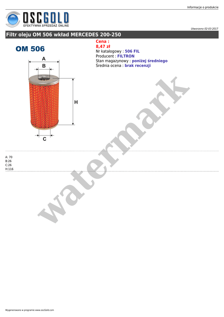 Informacje o produkcie Utworzono 02-03-2017 Filtr oleju OM 506 wkład MERCEDES 200-250 Cena : 8,47 zł er m ar k Nr katalogowy : 506 FIL Producent : FILTRON Stan magazynowy : poniżej średniego Średnia ocena : brak recenzji w at A: 70 B:26 C:26 H:116 Wygenerowano w programie www.oscGold.com